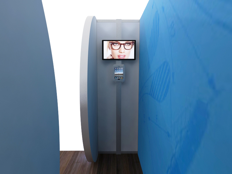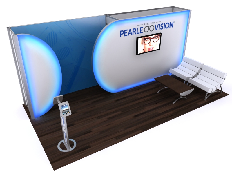 Lighting attracts attention, and subtle lighting like edge-lit graphics provides a soft, upscale appearance. The VK-1116 and VK-2957 demonstrate how a clean, visually strong exhibit with graceful curves can transform a modular inline into a custom-looking display. The Silicone Edge Graphics minimize the metal structure while focusing attention on the graphics and the monitor. Both configurations include ample storage, unusual in an inline. There's space for casual furniture and an attractive iPad stand for demos.