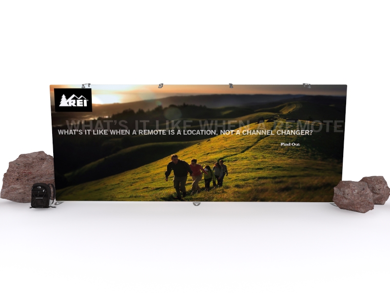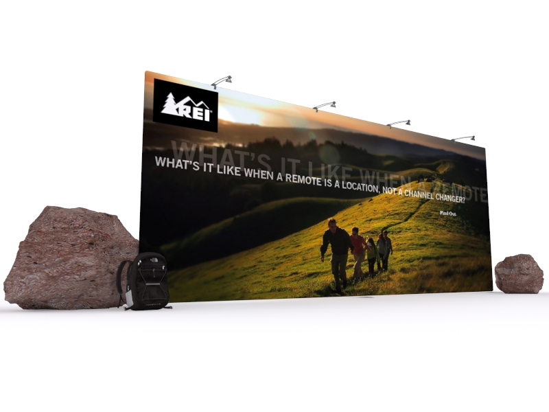 Graphics: Primarily one large tension fabric graphic @ 7.5 ft x 6.75 ft with a smaller tension fabric graphic and/or direct print graphics. Velcro tension fabric connections.