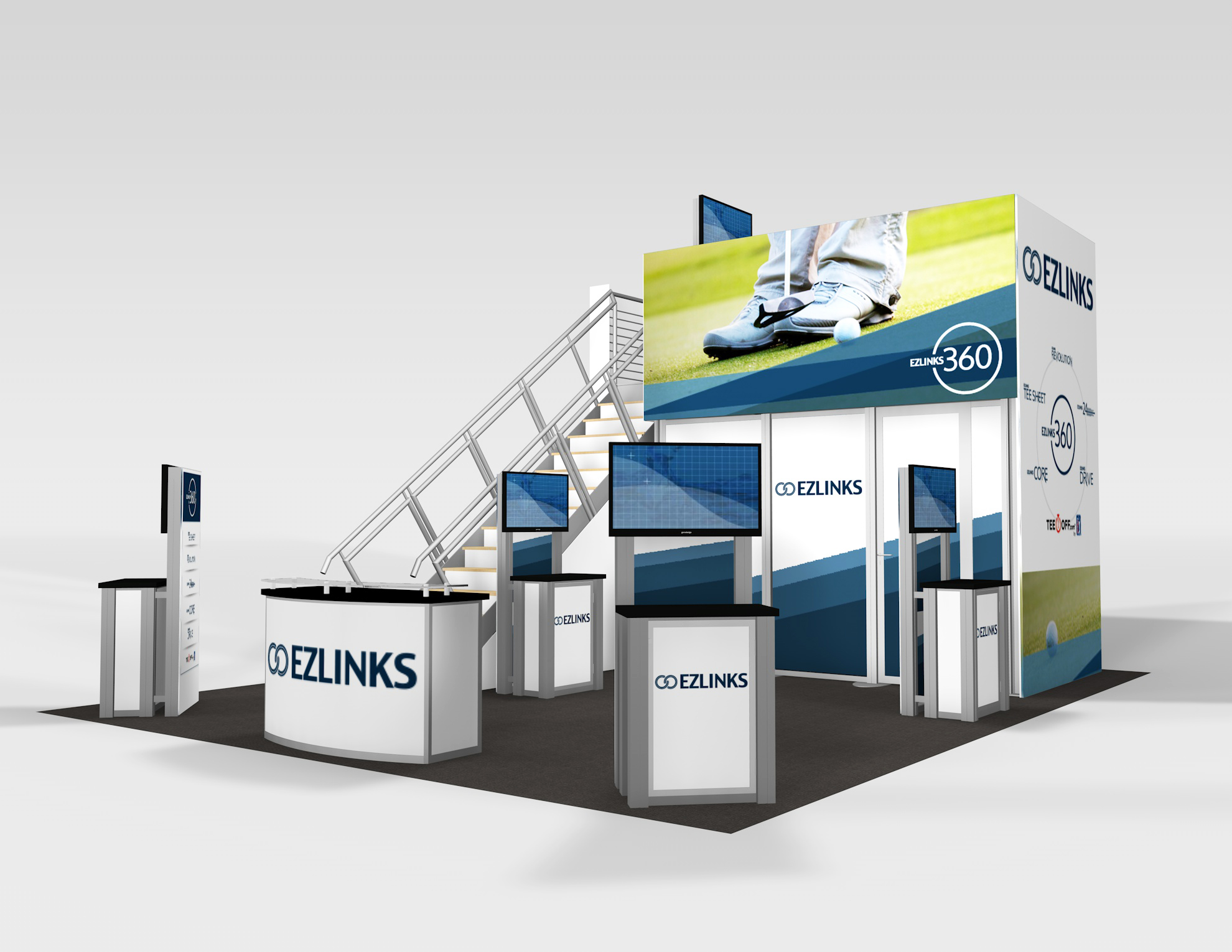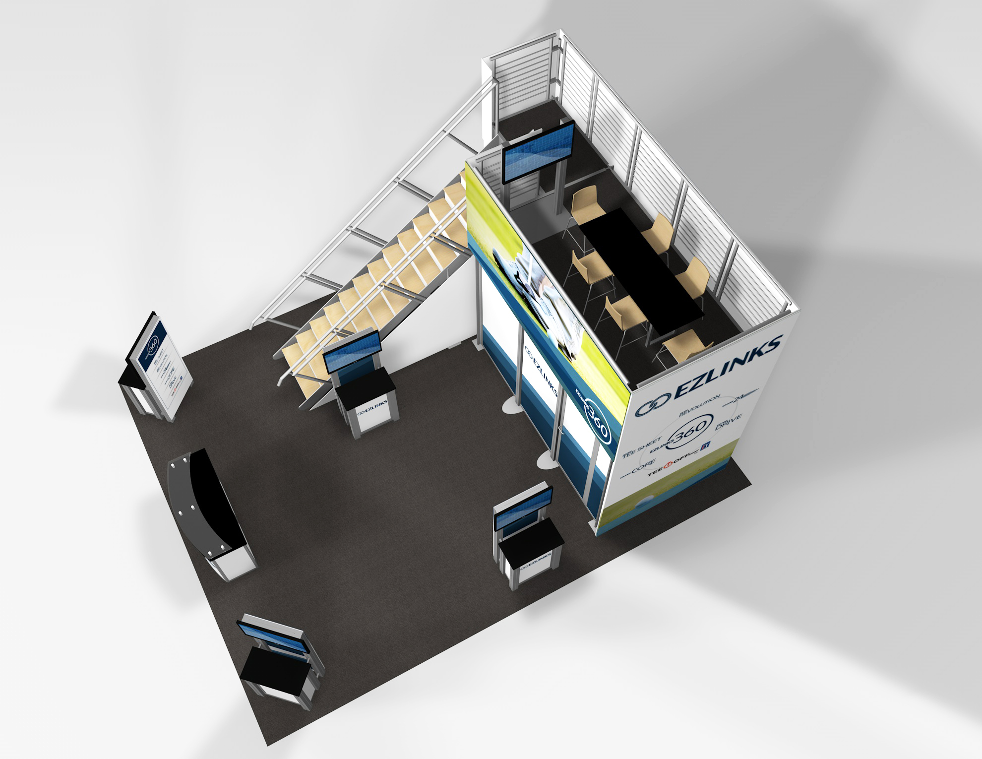 The Rental Island Exhibits go way beyond a pretty picture. We've incorporated key features such as large graphics, private and semi-private conference rooms, towers with locking storage access, and workstations and reception counters with secure storage. Not enough? Then add product shelves, large and small monitors for presentations, a variety of light fixtures, and hanging signs for high visibility from anywhere on the show floor. We also offer three contemporary double-deck configurations.