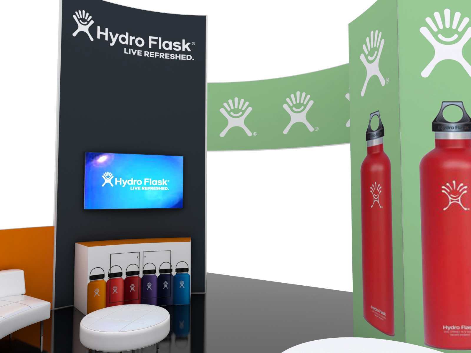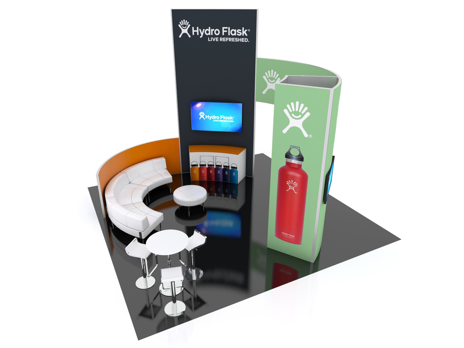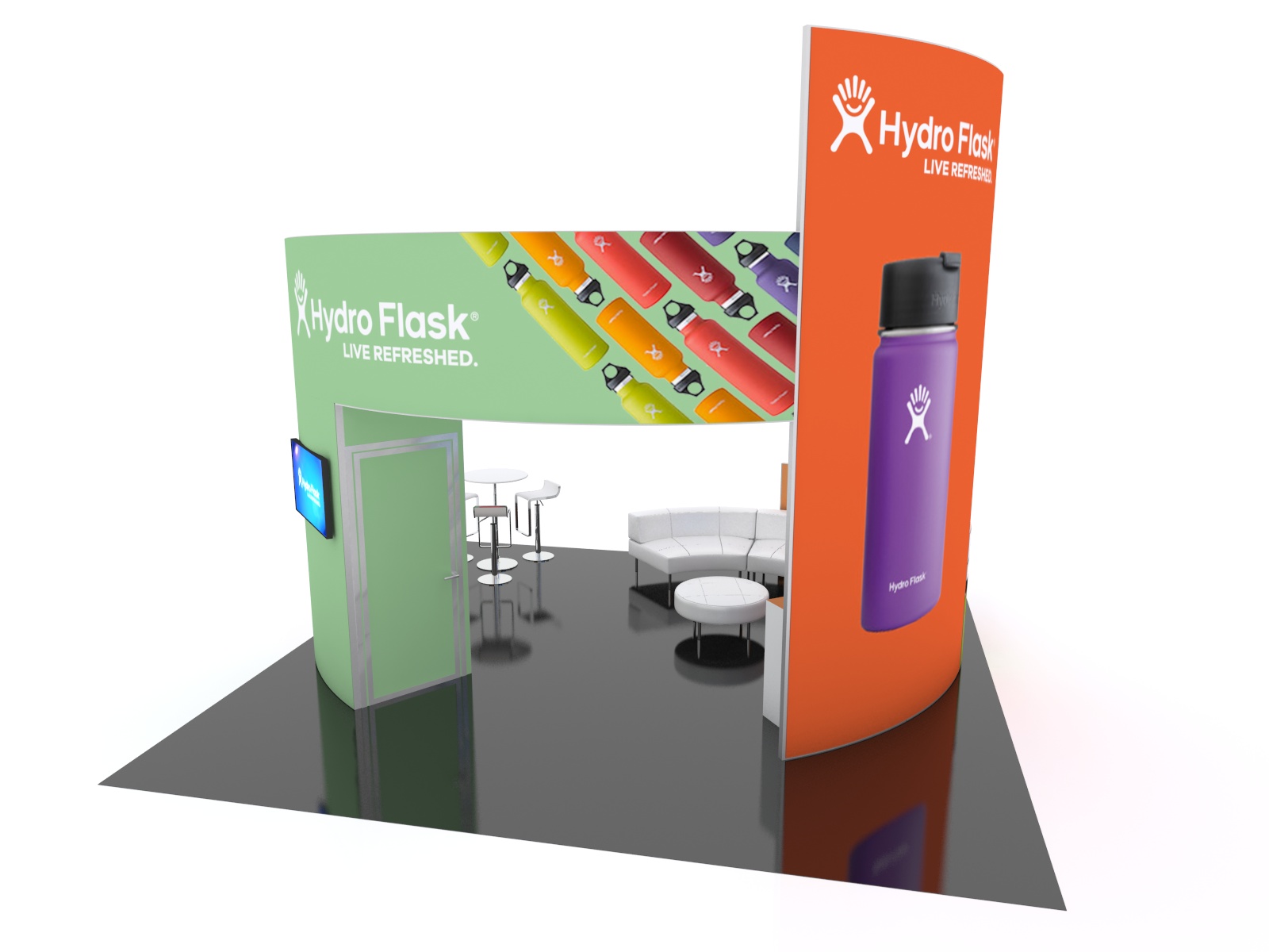 A well-designed, attractive, and practical island can be transformational for a company at a trade show. There's no better way to describe the re-configurable GK-5149, GK-5150, and GK-5051. The GK-5149 and GK-5150 20 x 20 islands maximize the available space with double-sided curved panels. The design includes monitors, meeting areas, optional pedestals, and large tension fabric graphics. In addition, the islands have multiple seating areas shown with rental furniture. All the curved panels are from the patented Gravitee System, so individual panels connect without tools and there are no loose parts or pieces. The (2) 20 x 20 islands connect seamlessly to create the larger 20 x 40 version.