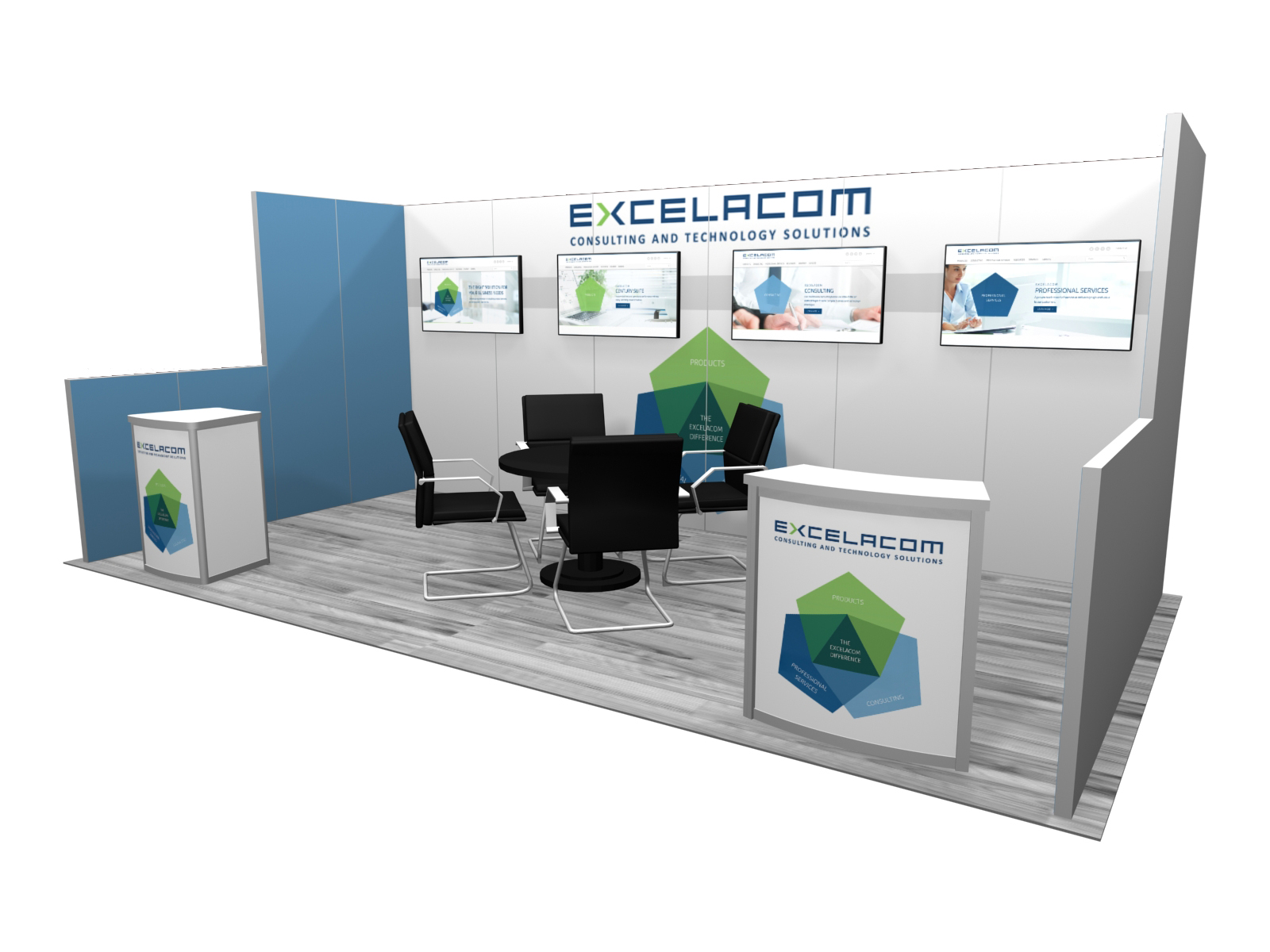 Quite often, a few custom elements added to the design can give the entire design a custom look even if it’s as simple as some colorful laminated workstations, shelves, or a reception counter. Custom laminated soffits and backlighting are also nice touches that are inexpensive and well worth the investment. As a bonus, if you re-rent the same exhibit, your second rental will most likely be less expensive, since your first rental covered the cost of those custom components.