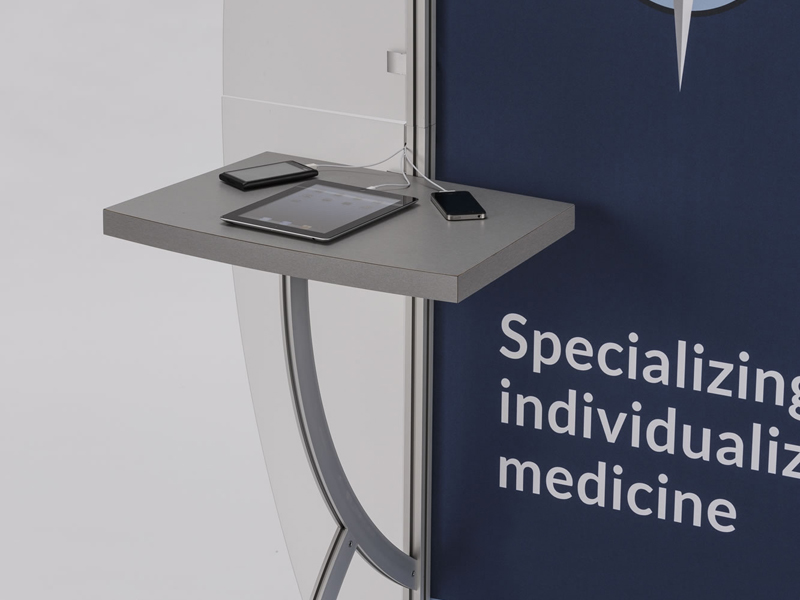 Quite often, a few custom elements added to the design can give the entire design a custom look even if it’s as simple as some colorful laminated workstations, shelves, or a reception counter. Custom laminated soffits and backlighting are also nice touches that are inexpensive and well worth the investment. As a bonus, if you re-rent the same exhibit, your second rental will most likely be less expensive, since your first rental covered the cost of those custom components.