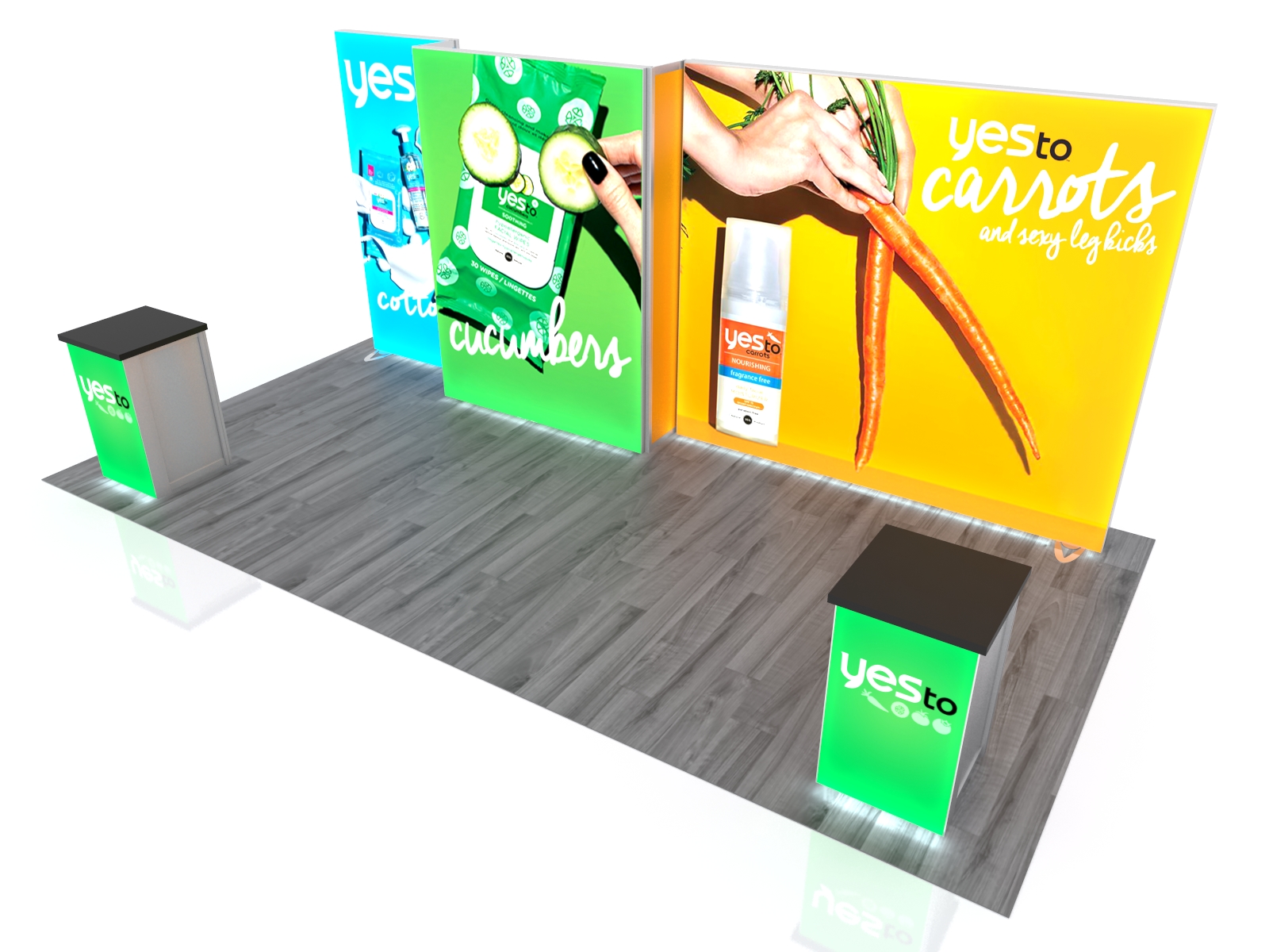Quite often, a few custom elements added to the design can give the entire design a custom look even if it’s as simple as some colorful laminated workstations, shelves, or a reception counter. Custom laminated soffits and backlighting are also nice touches that are inexpensive and well worth the investment. As a bonus, if you re-rent the same exhibit, your second rental will most likely be less expensive, since your first rental covered the cost of those custom components.