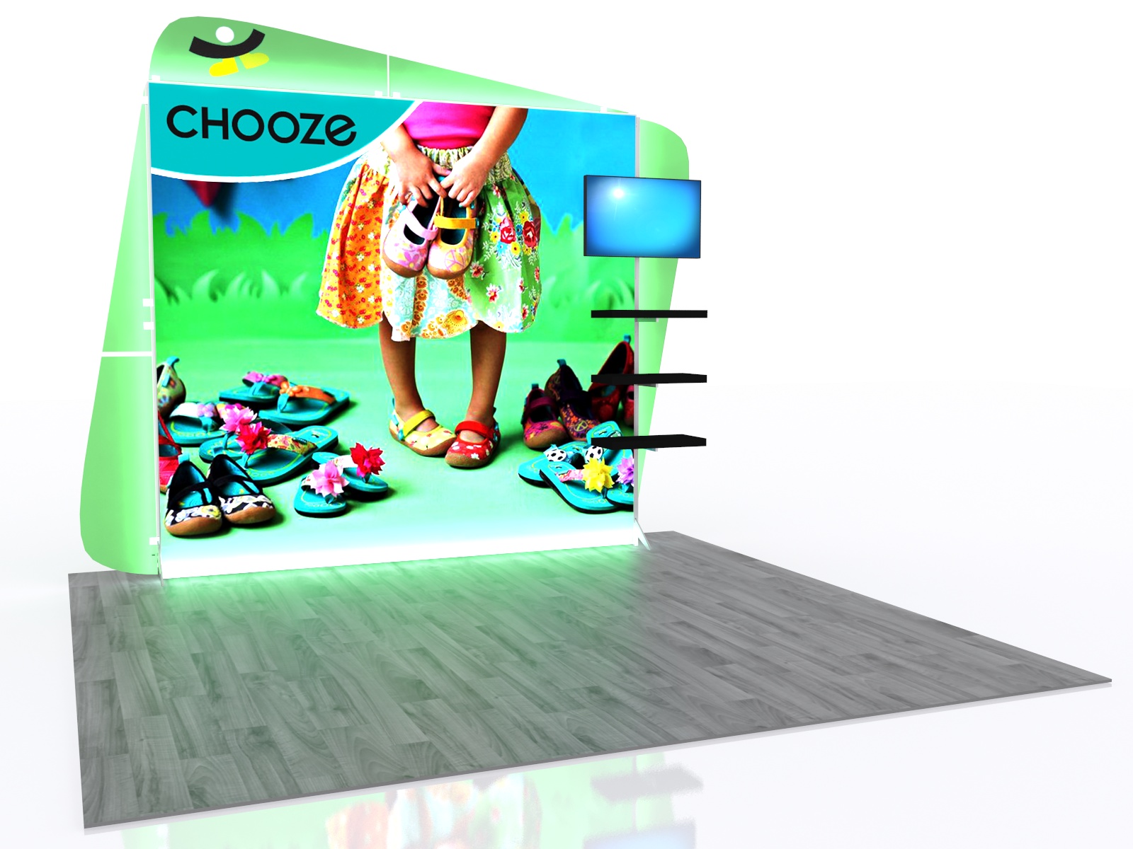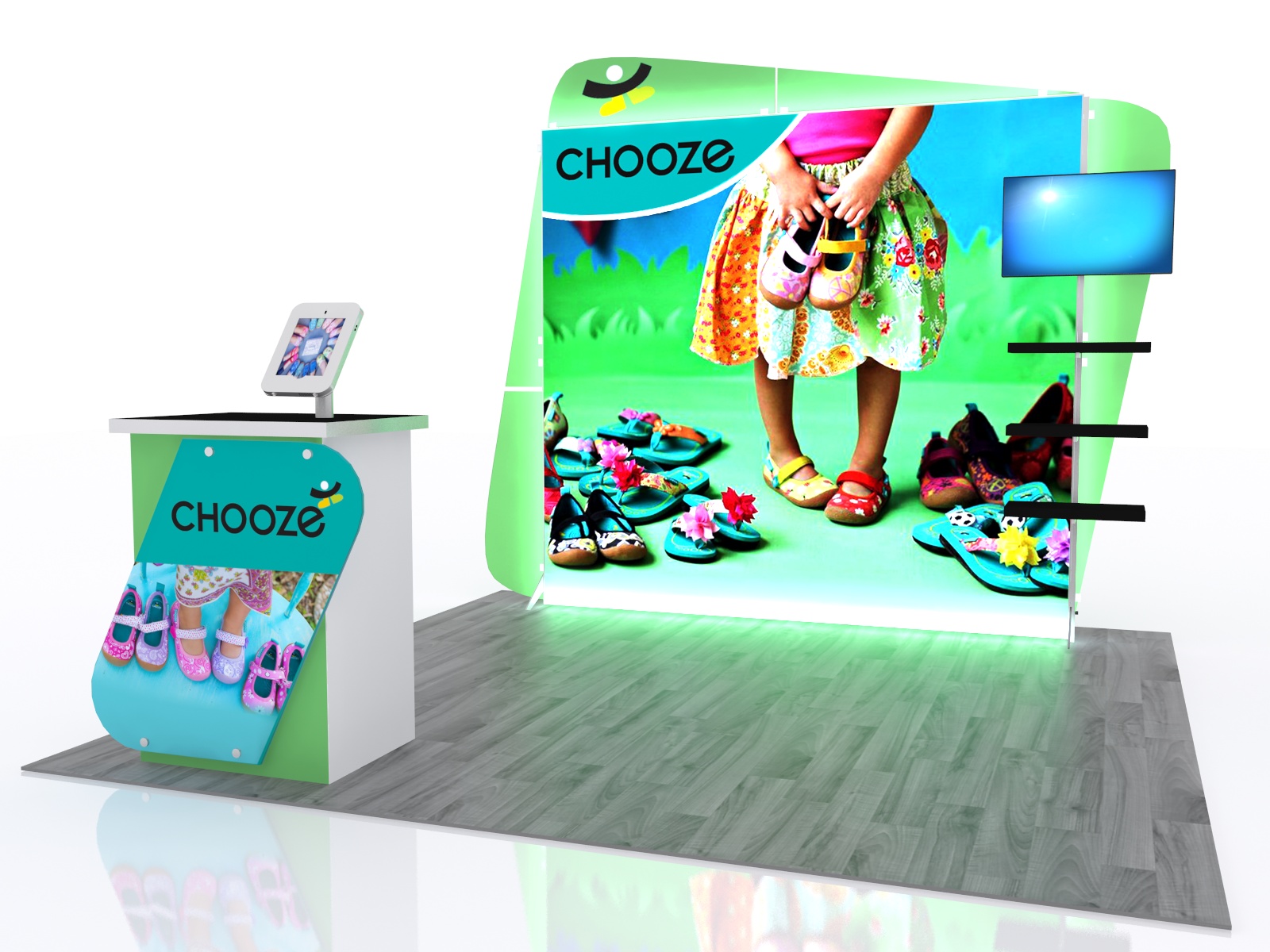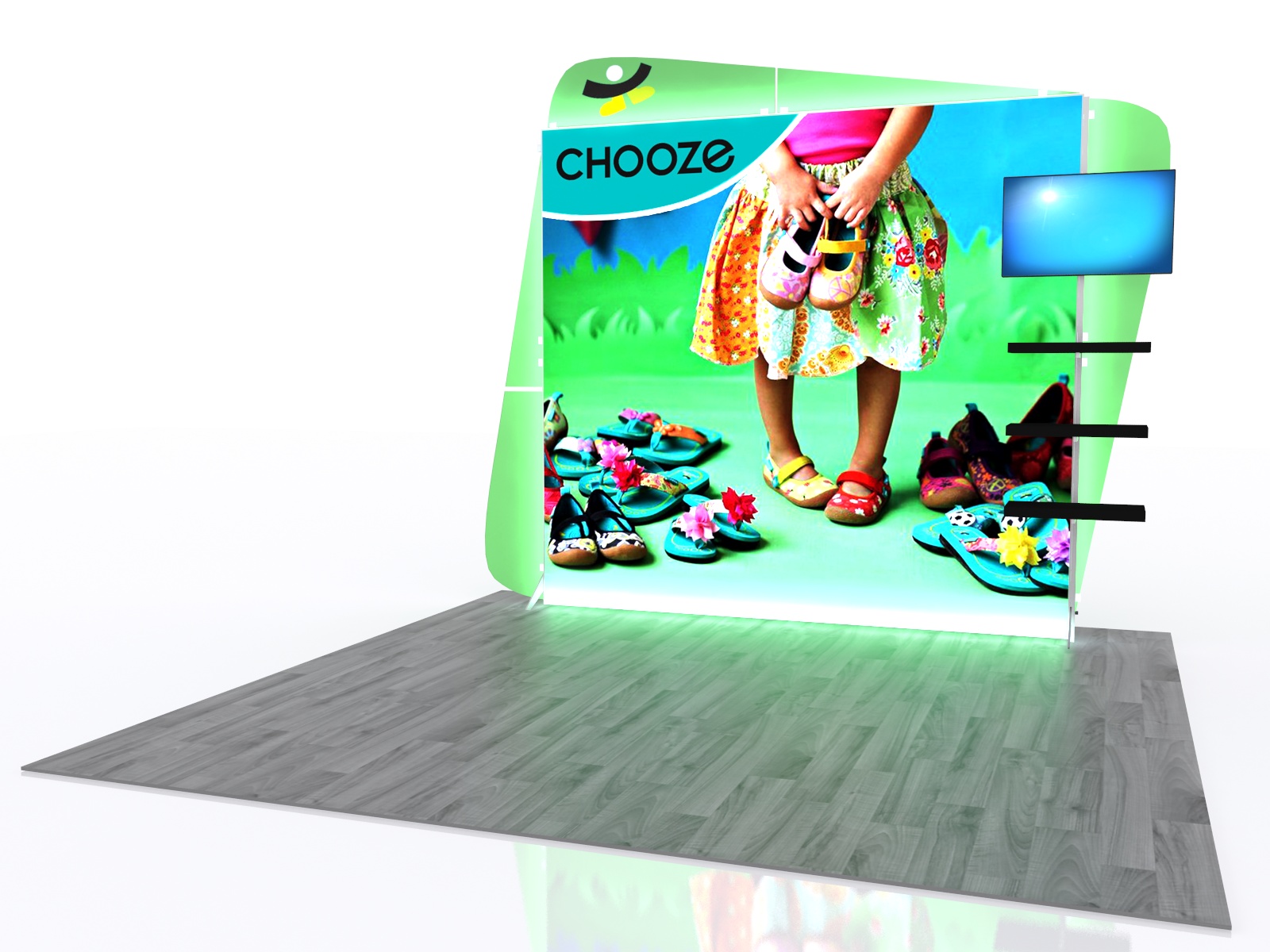 Quite often, a few custom elements added to the design can give the entire design a custom look even if it’s as simple as some colorful laminated workstations, shelves, or a reception counter. Custom laminated soffits and backlighting are also nice touches that are inexpensive and well worth the investment. As a bonus, if you re-rent the same exhibit, your second rental will most likely be less expensive, since your first rental covered the cost of those custom components.