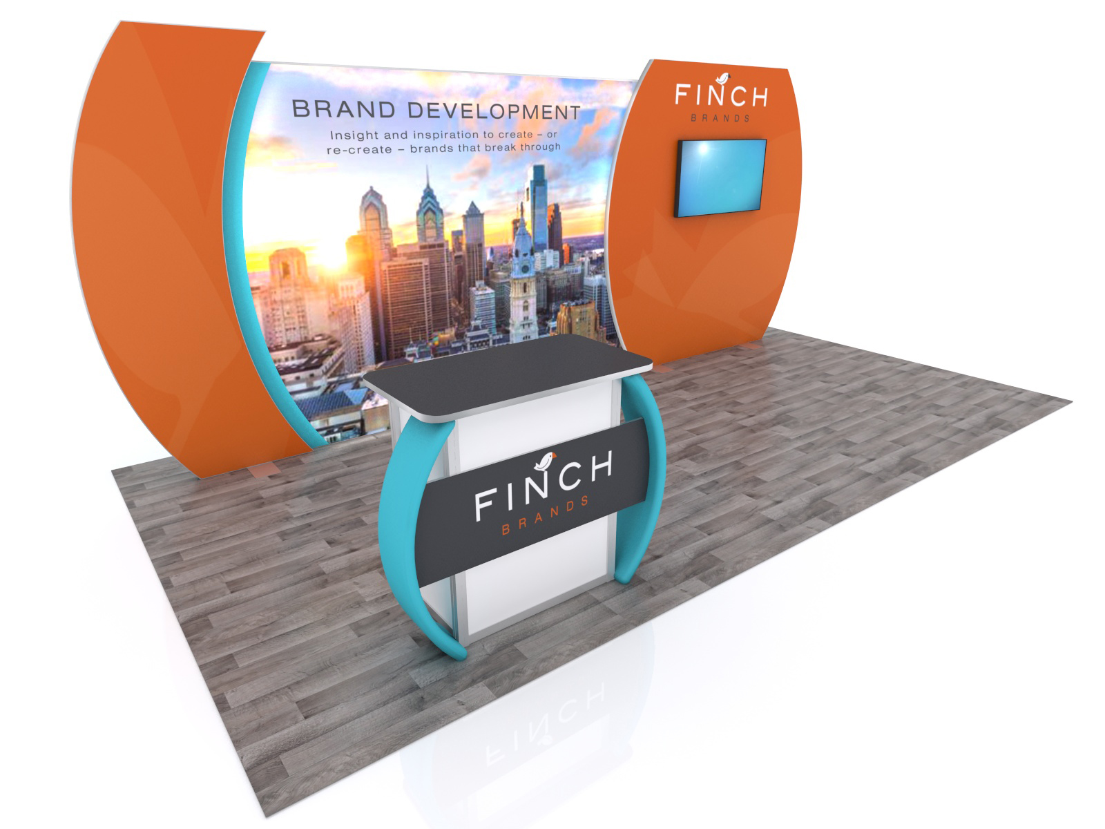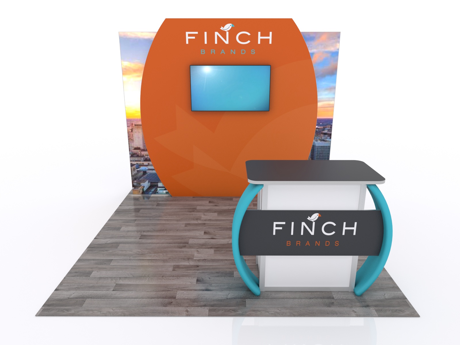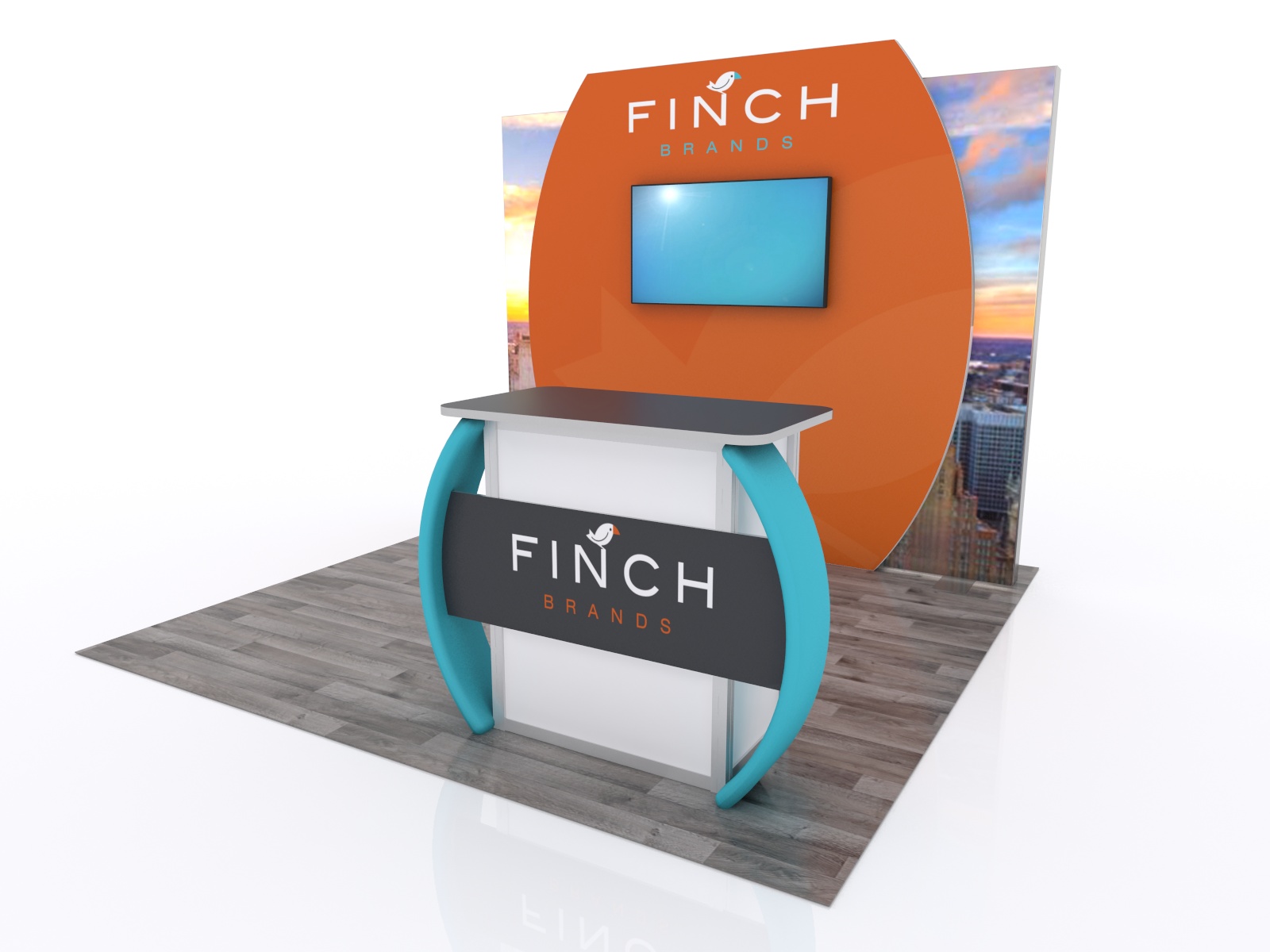 This distinctive VK-1351 and VK-6002 lightboxes blend exceptionally bright LED lights, an aluminum SEG frame, and vibrant fabric graphics into a brilliant eye-catching display. The large LED lightbox spans the display and is framed with curved laminated panels. The middle section supports a large monitor and includes graphics for high impact. Upfront there's a modified MOD-1550 reception counter with a front backlit graphic and USB charging ports. All have integrated cord management. You won't believe your eyes the first time you flip the switch and see how stunning your backlit graphic can be.