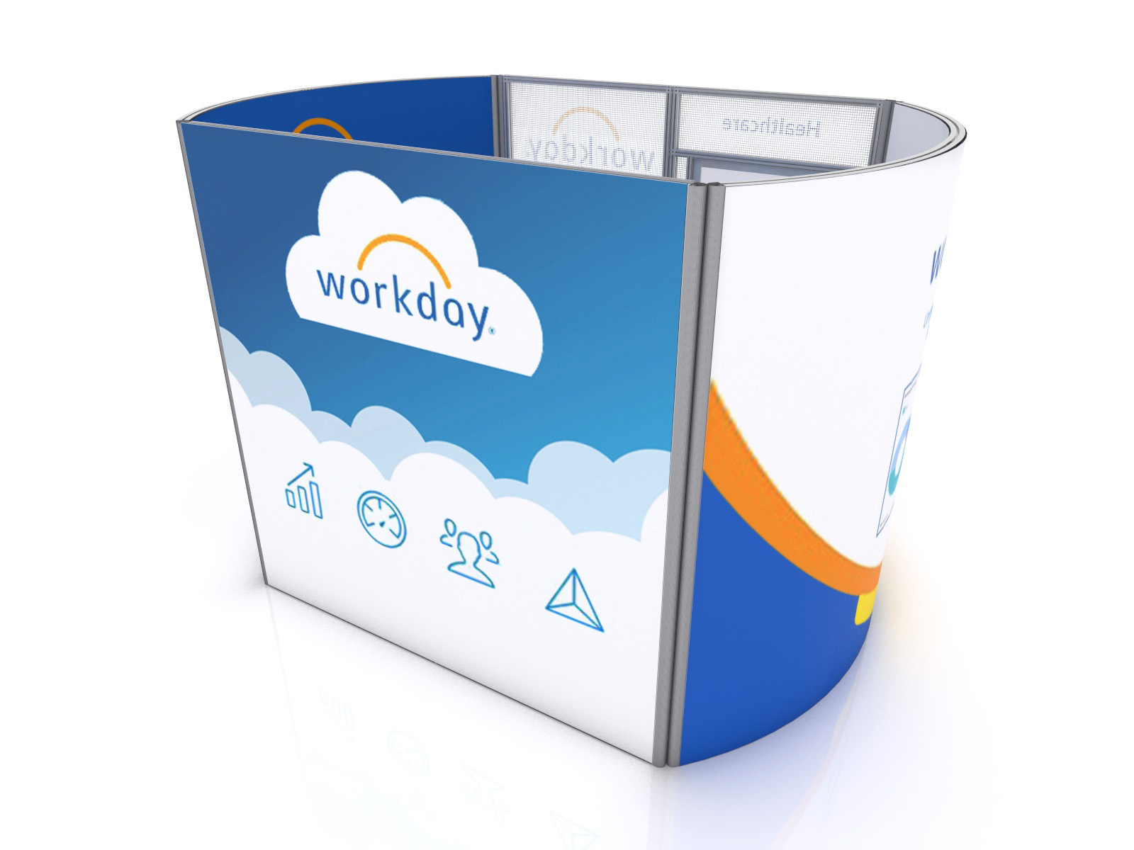 The Gravitee One-Step Mobile Meeting Pods turn your casual temporary meeting room into something much more. The Pods assemble without tools and disassemble into convenient flat or curved panels for easy shipping. Aluminum panels connect using attached patented slide clips and locking plunger so there's no loose parts. Choose from three pre-designed configurations, oval, trapezoid, or square, or design a shape that matches your event, sales meeting, or conference.