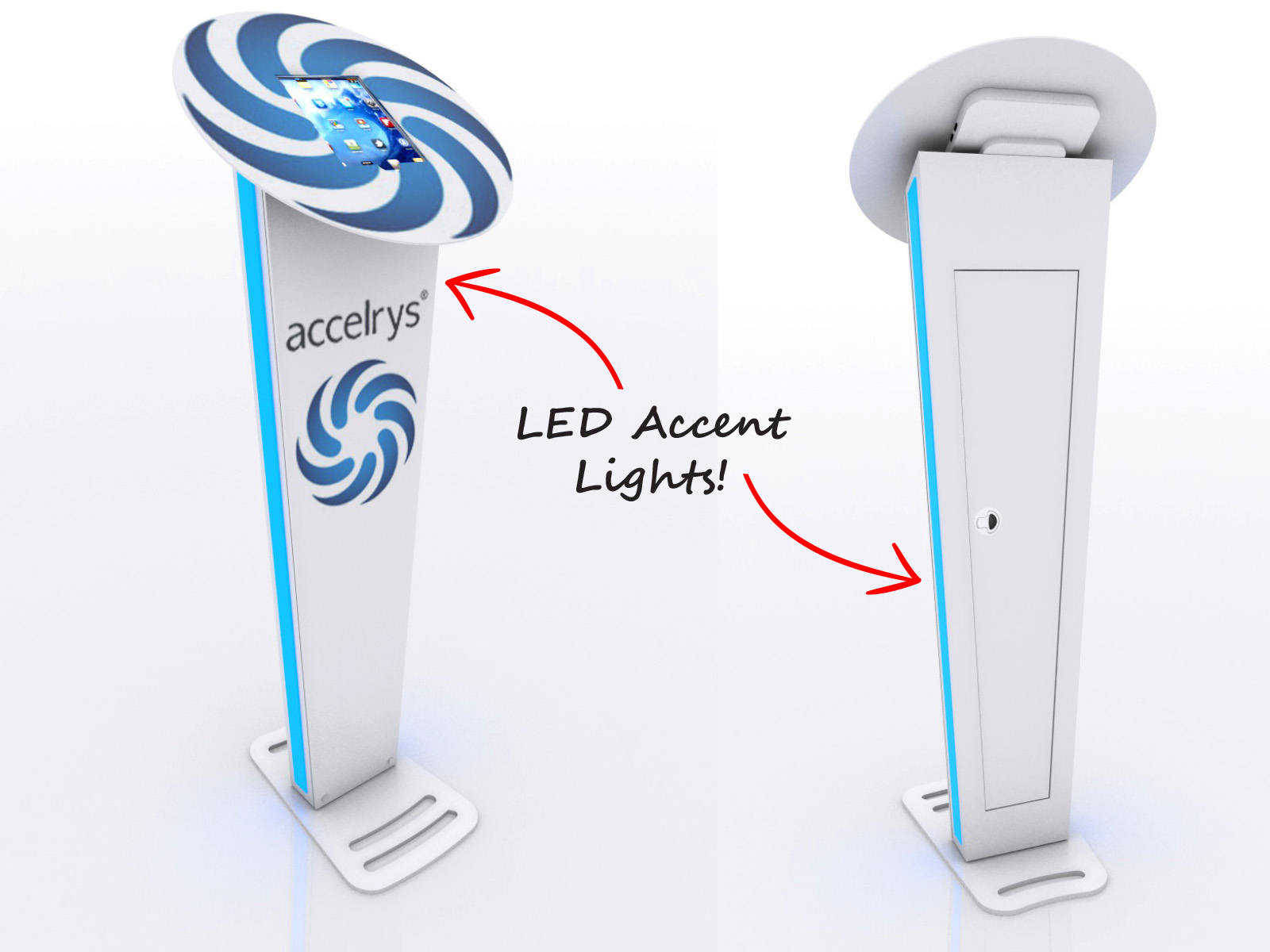 MOD-1374 iPad Stand with LED Accent LightsMOD-1374 iPad Kiosk with GraphicsMOD-1374 iPad Kiosk with GraphicsMOD-1374 iPad Kiosk with GraphicsClamshell with Dual LocksPortrait to Landscape Rotation FeatureOptional LT-550 Portable Roto-molded Case with Wheels and Jigging