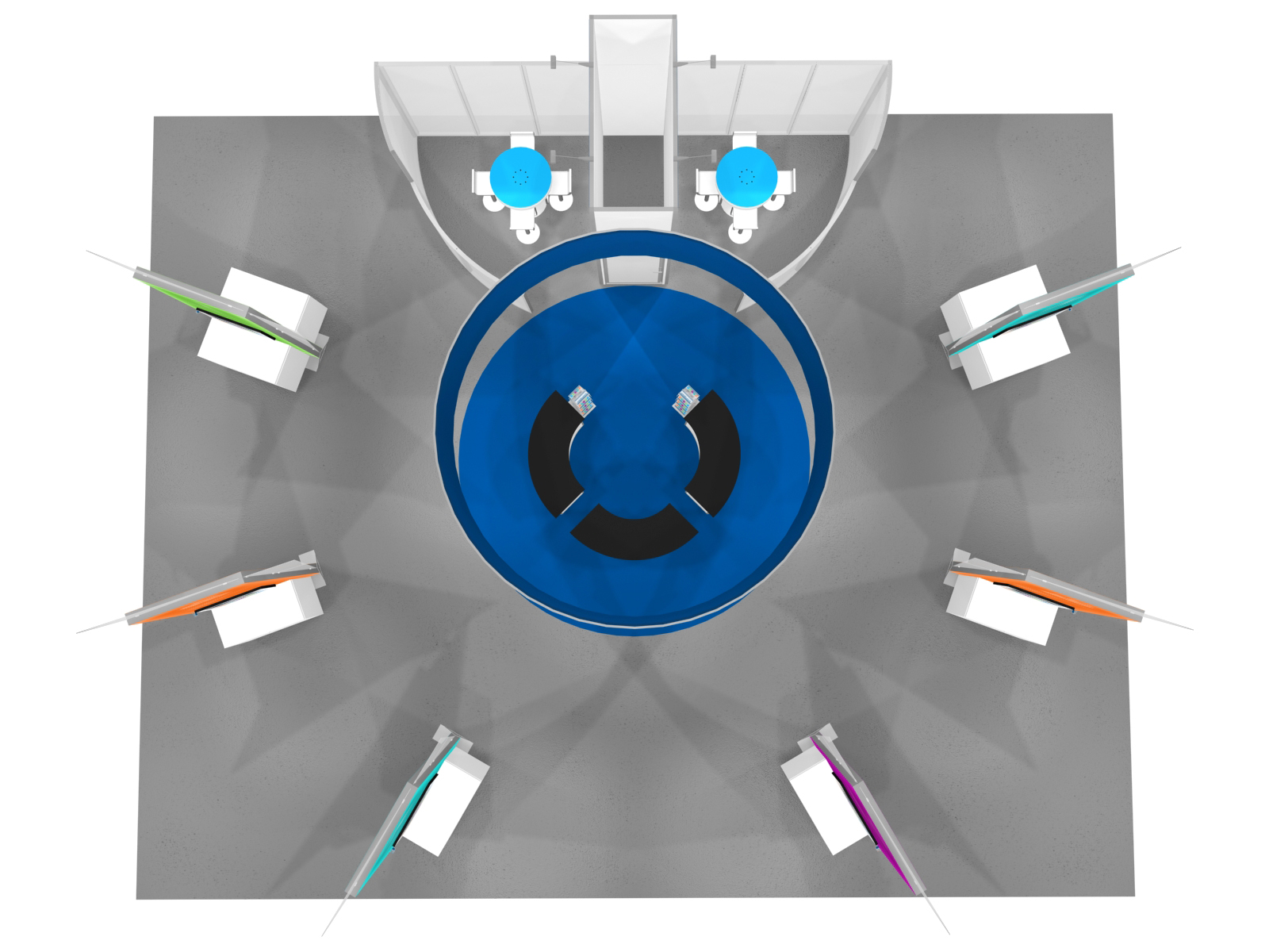 Quite often, a few custom elements added to the design can give the entire design a custom look even if it’s as simple as some colorful laminated workstations, shelves, or a reception counter. Custom laminated soffits and backlighting are also nice touches that are inexpensive and well worth the investment. As a bonus, if you re-rent the same exhibit, your second rental will most likely be less expensive, since your first rental covered the cost of those custom components.