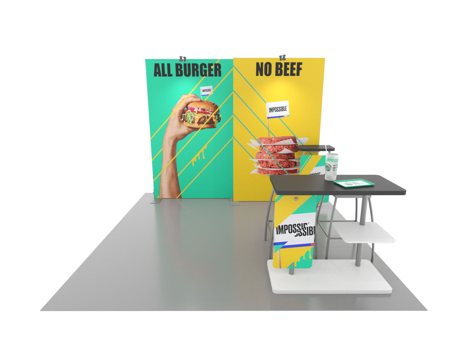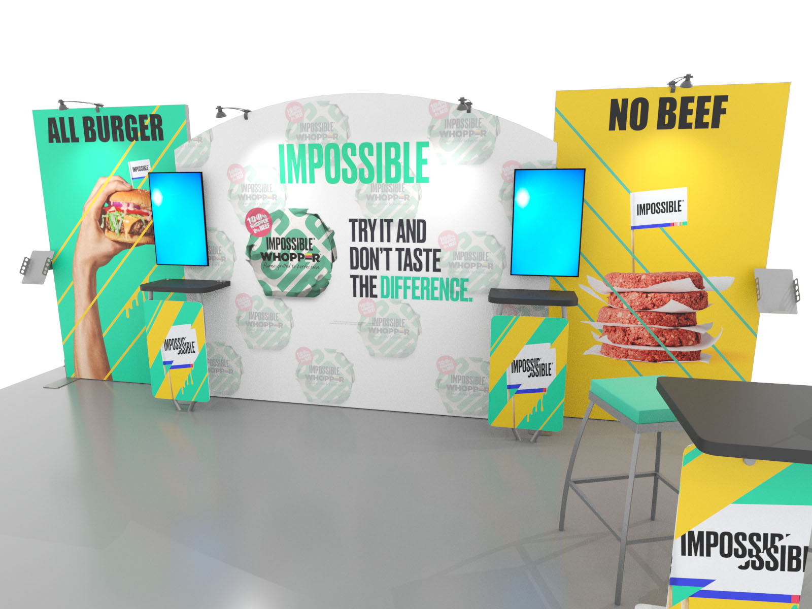 Graphics: Primarily one large tension fabric graphic @ 7.5 ft x 6.75 ft with a smaller tension fabric graphic and/or direct print graphics. Velcro tension fabric connections.