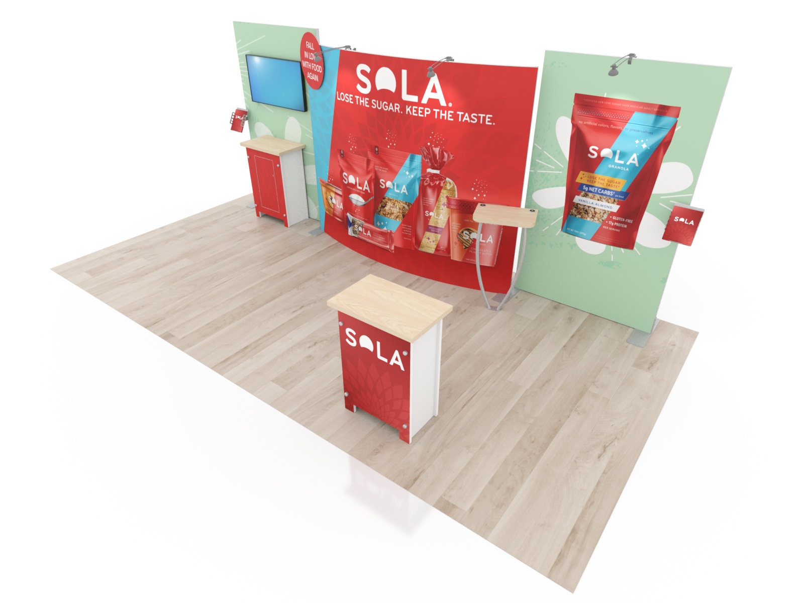 Graphics: Primarily one large tension fabric graphic @ 7.5 ft x 6.75 ft with a smaller tension fabric graphic and/or direct print graphics. Velcro tension fabric connections.