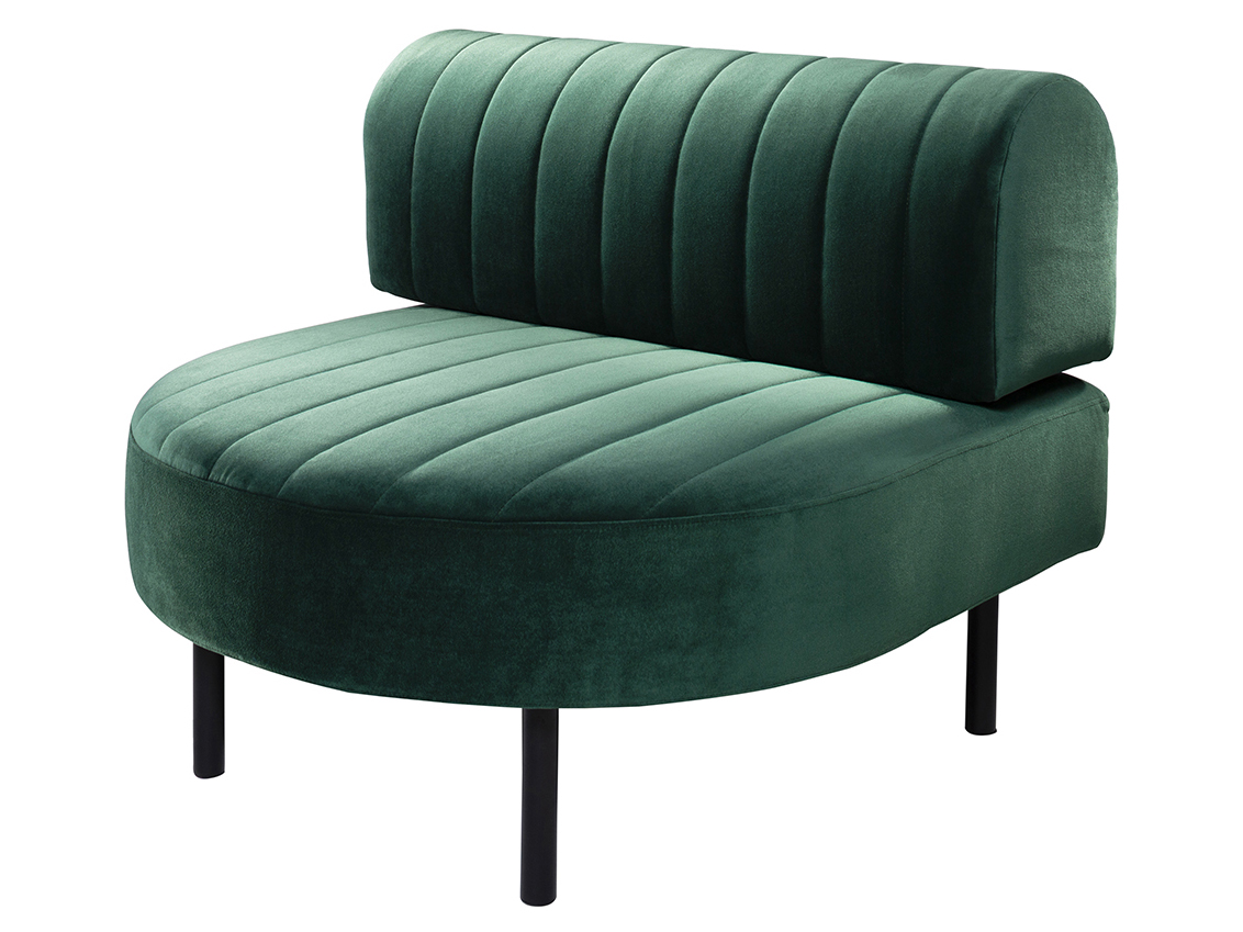This retro-vibe, green velvet chair with a modern flair is compact, comfortable and stylish. Dims: 34.5" L x 34.5" D x 27" H