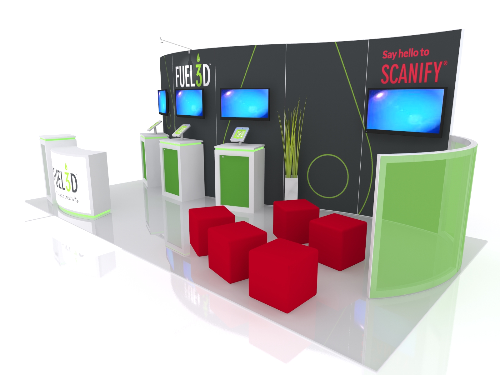 Quite often, a few custom elements added to the design can give the entire design a custom look even if it’s as simple as some colorful laminated workstations, shelves, or a reception counter. Custom laminated soffits and backlighting are also nice touches that are inexpensive and well worth the investment. As a bonus, if you re-rent the same exhibit, your second rental will most likely be less expensive, since your first rental covered the cost of those custom components.
