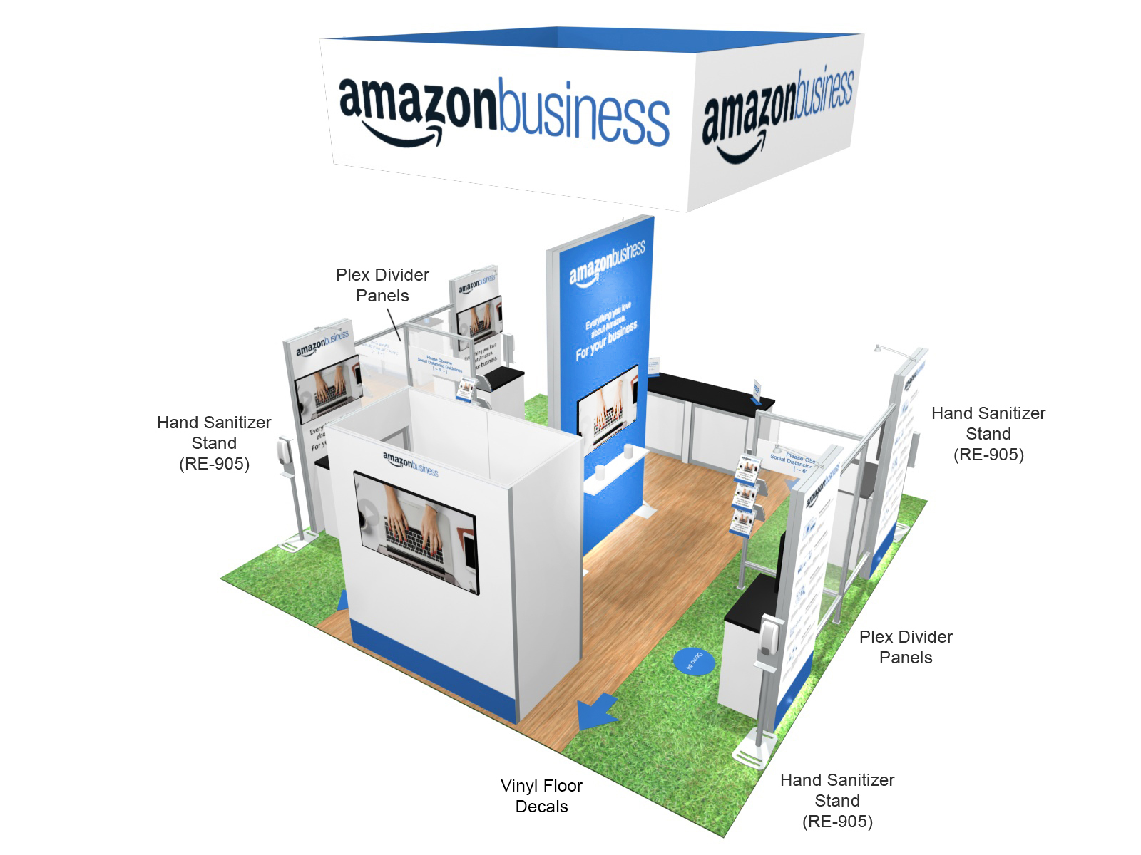 A well-designed rental island exhibit should be attractive, inviting, informative, and practical. The RE-9127 does all that... and more. It combines lightboxes and vibrant graphics with functional monitor kiosks in a booth design that welcomes business conversations and problem solving. There are multiple locking counters and a full-size closet for secure storage. The 12 ft. high central tower include meeting area. Finally a large square overhead hanging sign ensures visibility throughout the exhibit hall.