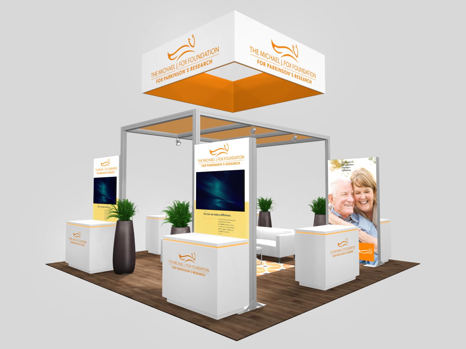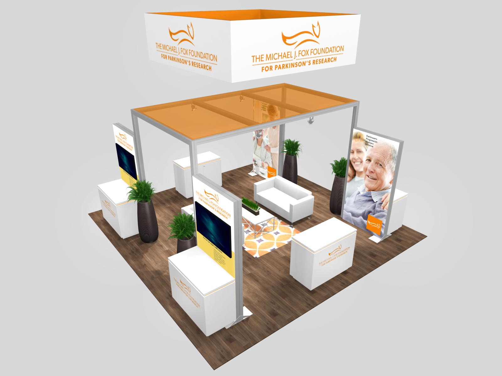 Along the perimeter of the booth are counters and monitors for demos or client consultations. Anchoring it all is square hanging sign for maximum visibility on the show floor.