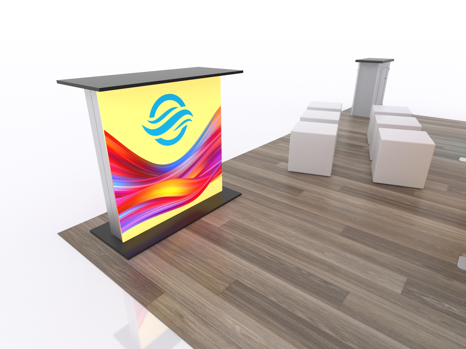 Quite often, a few custom elements added to the design can give the entire design a custom look even if it’s as simple as some colorful laminated workstations, shelves, or a reception counter. Custom laminated soffits and backlighting are also nice touches that are inexpensive and well worth the investment. As a bonus, if you re-rent the same exhibit, your second rental will most likely be less expensive, since your first rental covered the cost of those custom components.