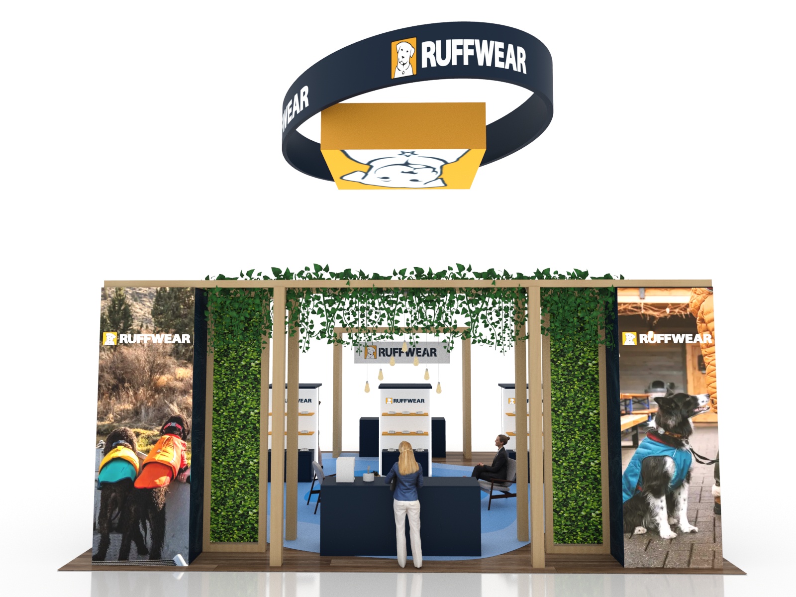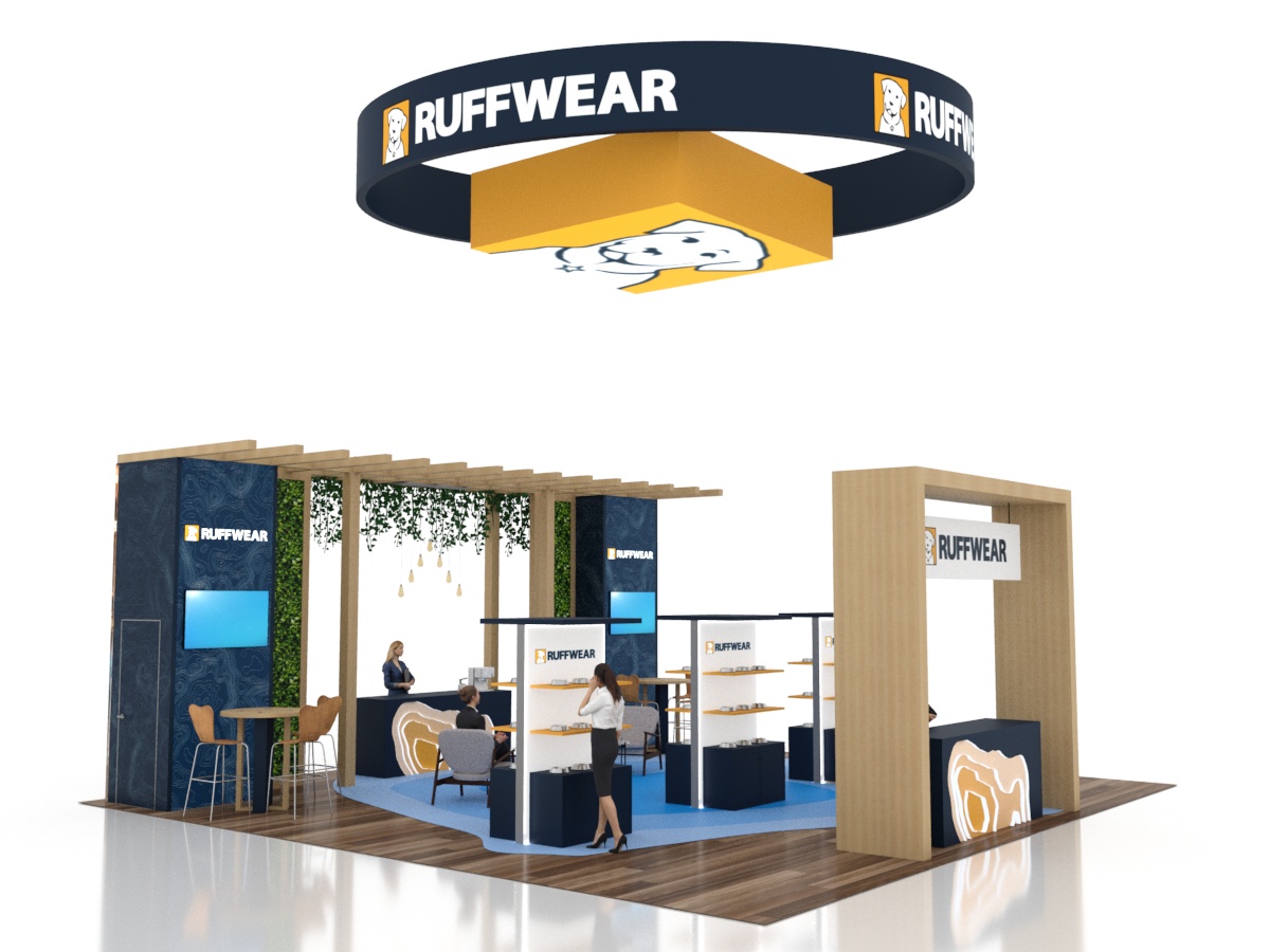 The VK-5178 and VK-5184 transform the typical trade show island into an inviting retail space with product displays, coffee bar, and casual seating. The natural finishes complement the greenery. There are backlit tension fabric graphics on the reception desk and larger towers. The 30 x 40 design even includes a grid product wall with additional lightboxes and a layered overhead hanging sign.