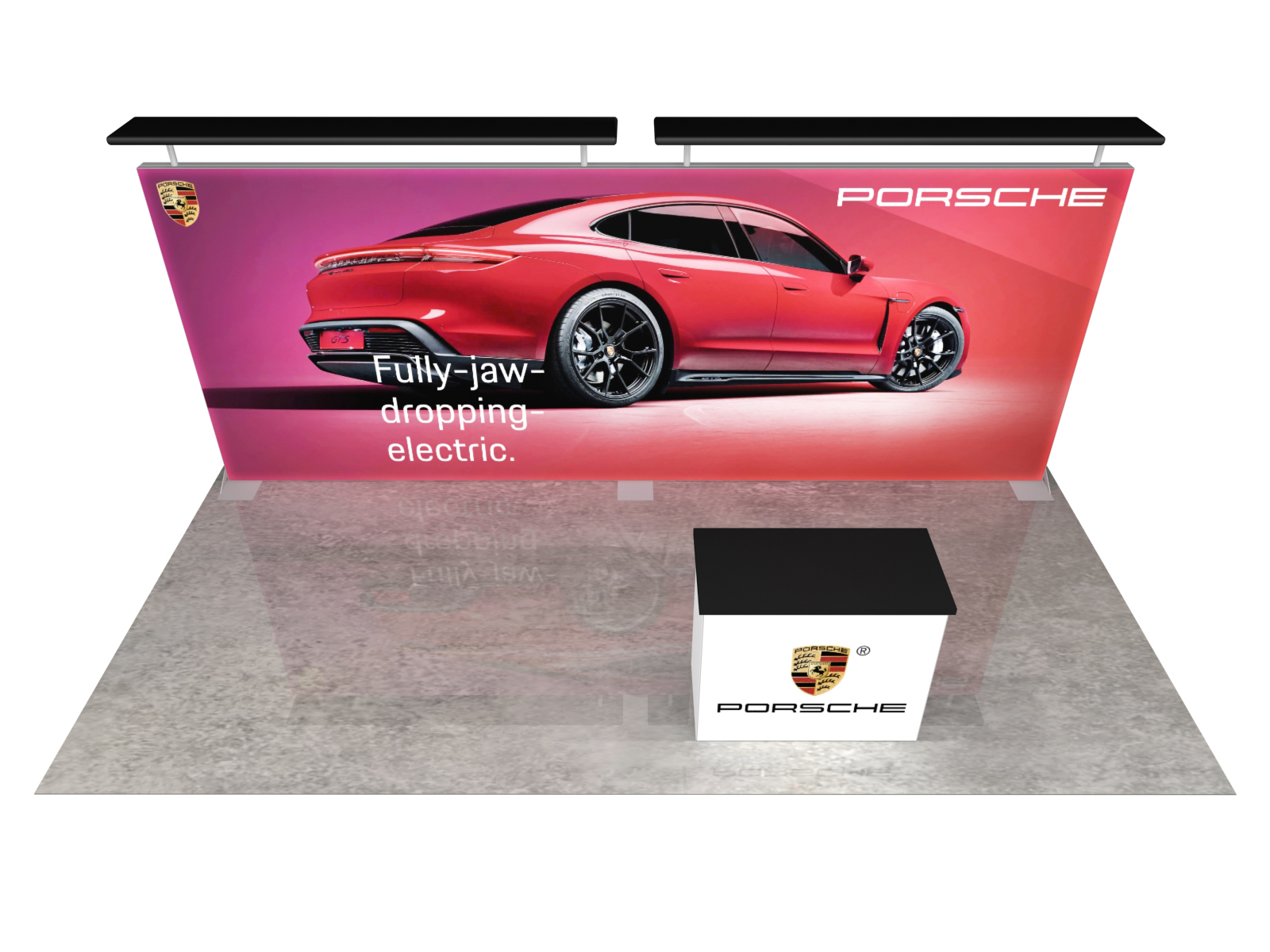 Quite often, a few custom elements added to the design can give the entire design a custom look even if it’s as simple as some colorful laminated workstations, shelves, or a reception counter. Custom laminated soffits and backlighting are also nice touches that are inexpensive and well worth the investment. As a bonus, if you re-rent the same exhibit, your second rental will most likely be less expensive, since your first rental covered the cost of those custom components.