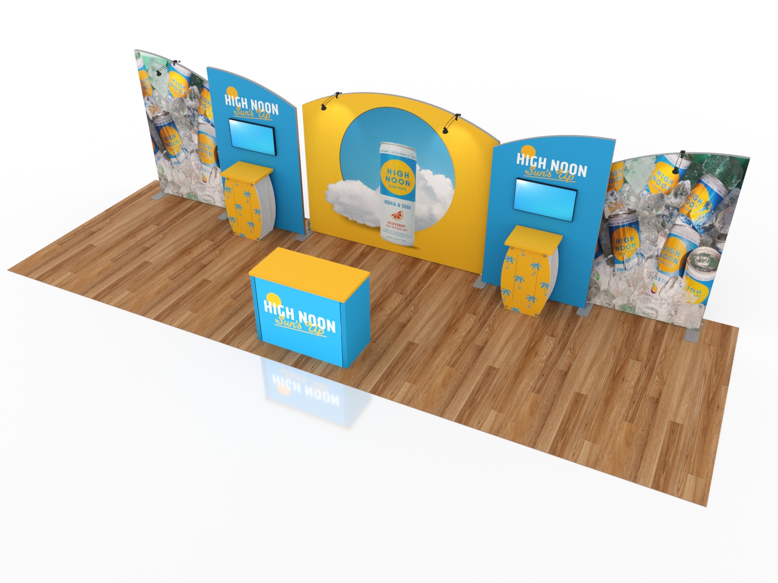 Graphics: Primarily one large tension fabric graphic @ 7.5 ft x 6.75 ft with a smaller tension fabric graphic and/or direct print graphics. Velcro tension fabric connections.