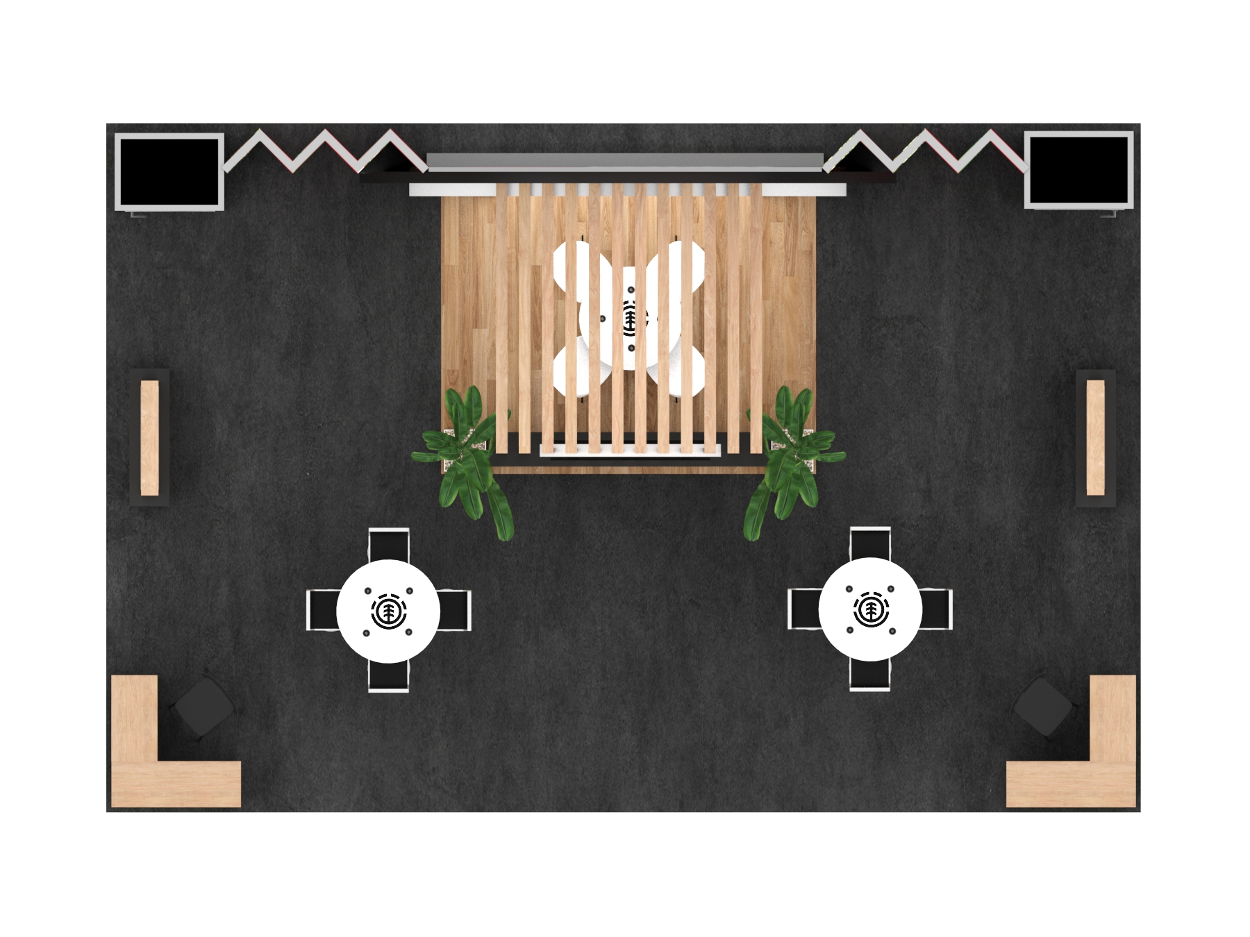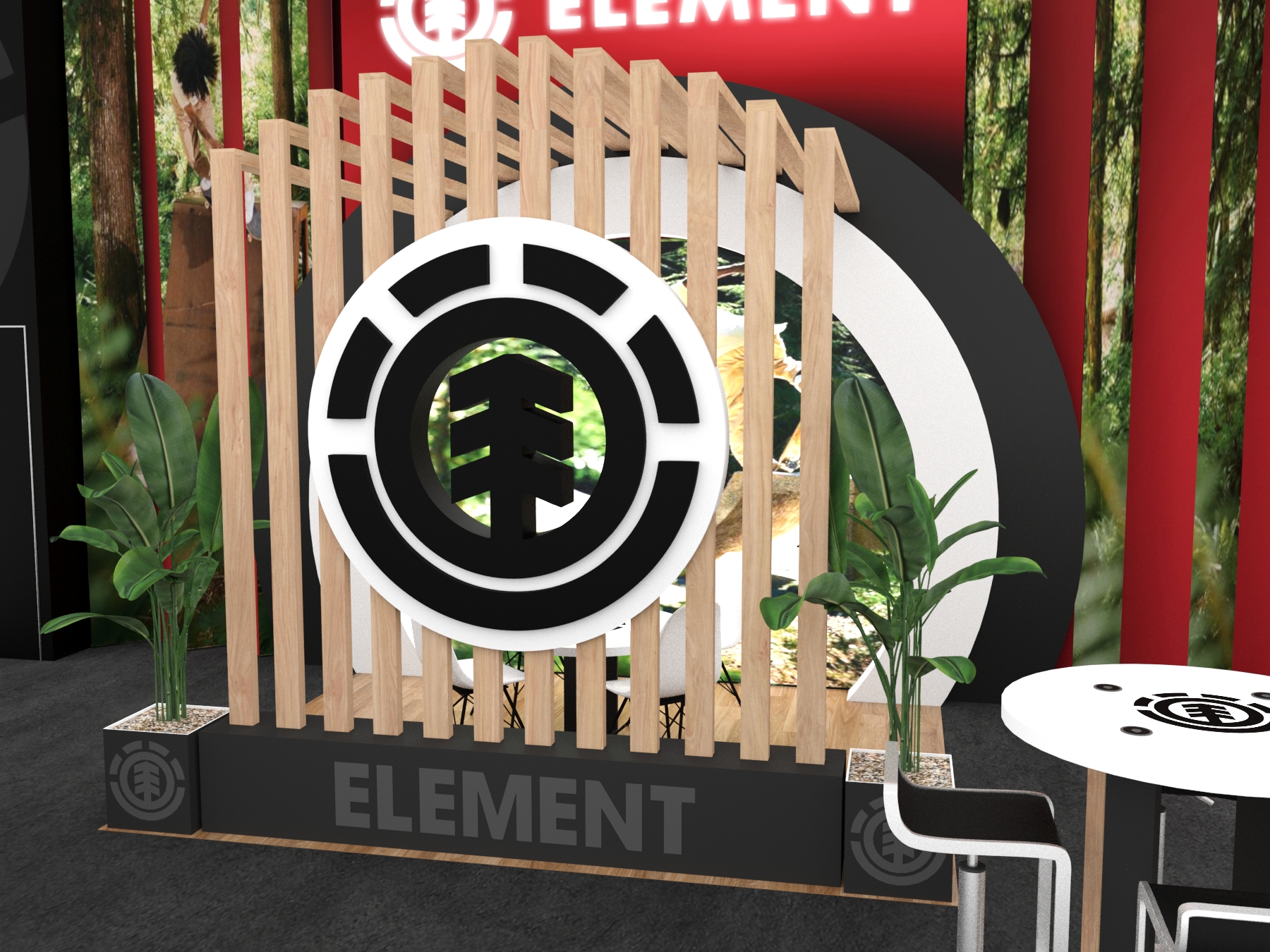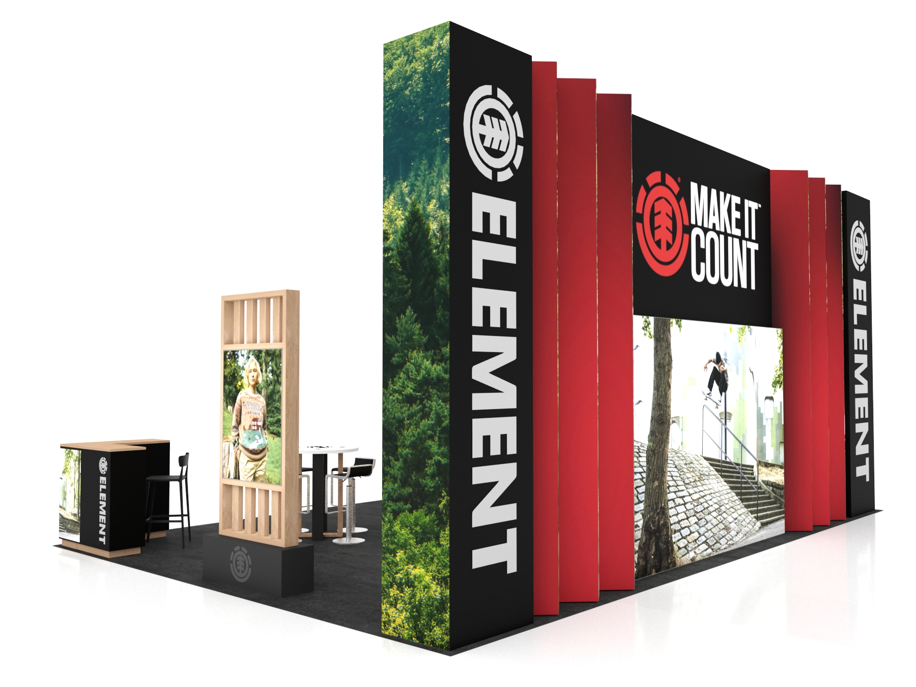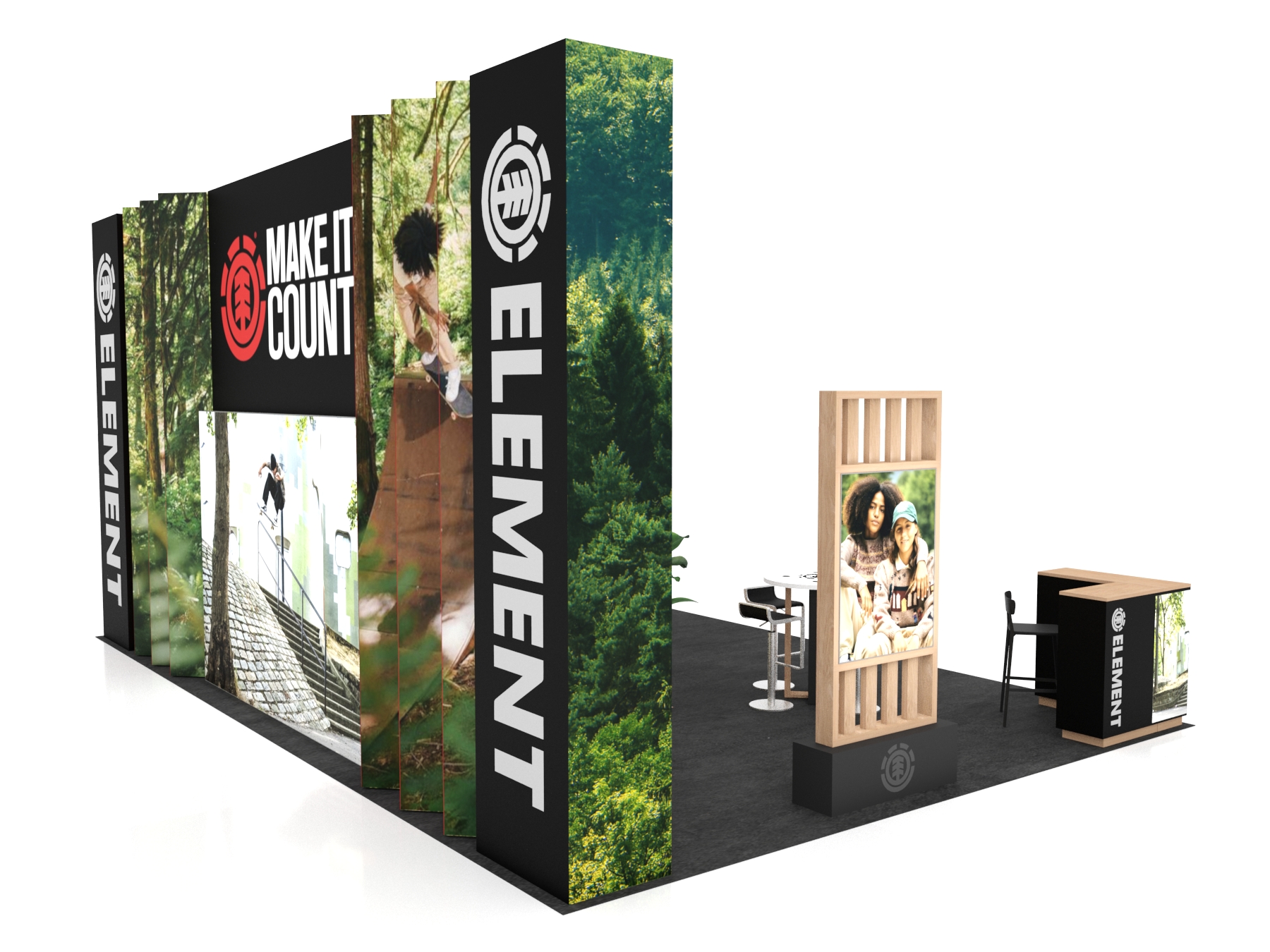 In addition, the series includes two seating areas, reception counters with locking storage, a head-turning pergola, and custom double-side lightboxes.