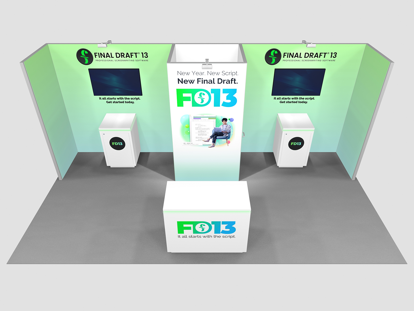 Quite often, a few custom elements added to the design can give the entire design a custom look even if it’s as simple as some colorful laminated workstations, shelves, or a reception counter. Custom laminated soffits and backlighting are also nice touches that are inexpensive and well worth the investment. As a bonus, if you re-rent the same exhibit, your second rental will most likely be less expensive, since your first rental covered the cost of those custom components.