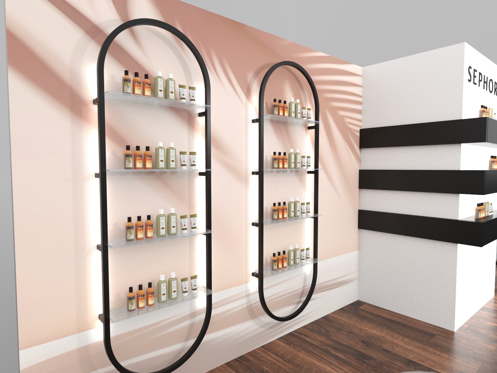 • (3) L-shaped Product Shelves (Front: 54" W x 6" D x 7.5" H )
