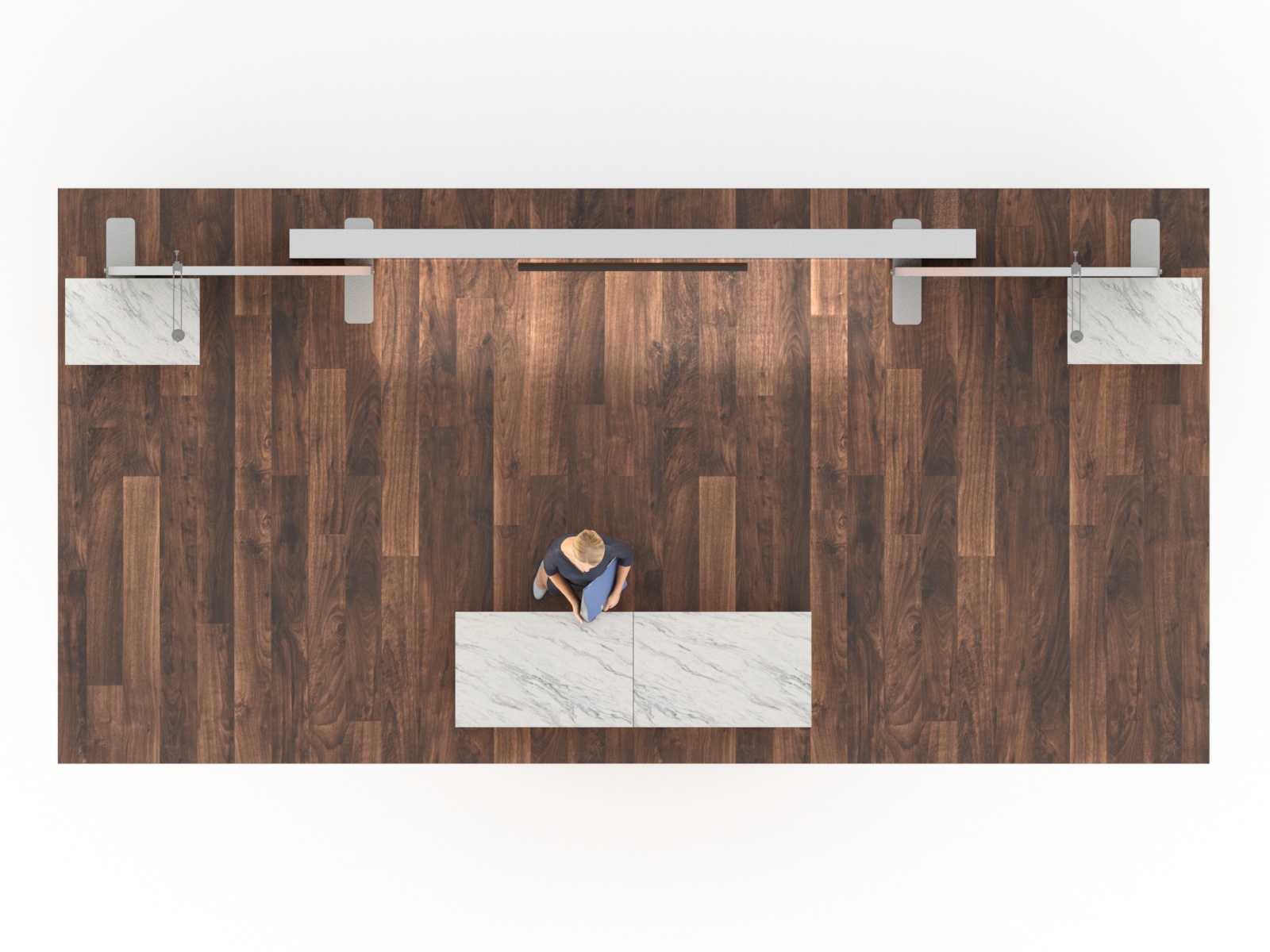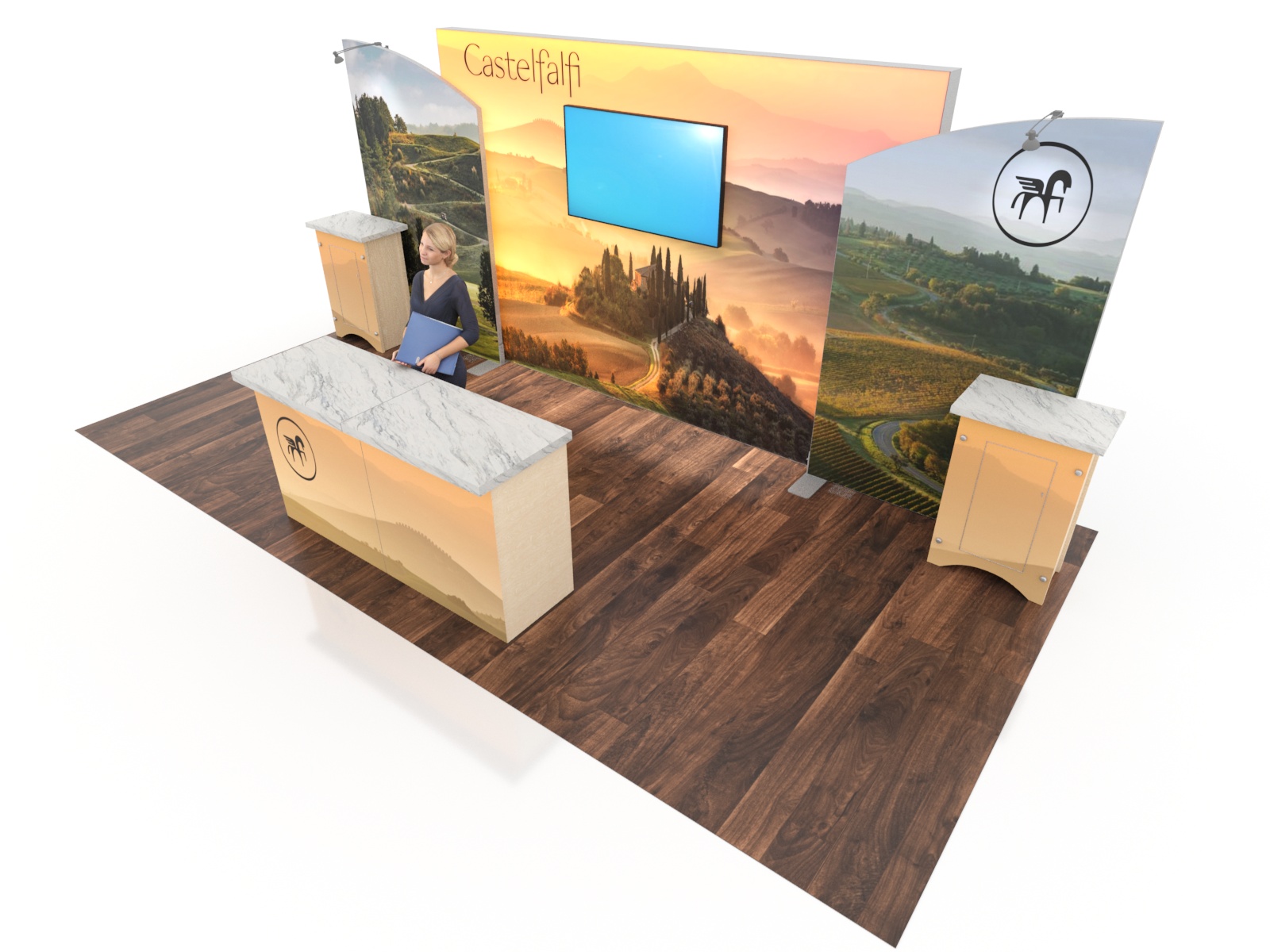 Graphics: Primarily one large tension fabric graphic @ 7.5 ft x 6.75 ft with a smaller tension fabric graphic and/or direct print graphics. Velcro tension fabric connections.