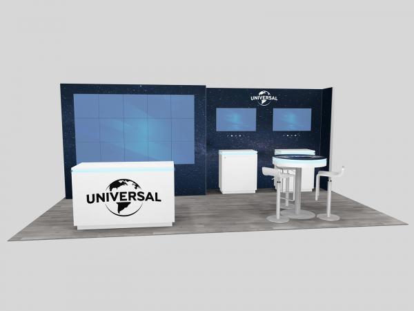 Light and movement attract attention on the trade show floor. Smart exhibitors use that to their advantage with compelling large format videos using LED video tiles and monitors. The RE-2170 and RE-2171 are rental inline designs using modular components to achieve an upscale, multi-functional exhibit in a 200 sq. ft space.