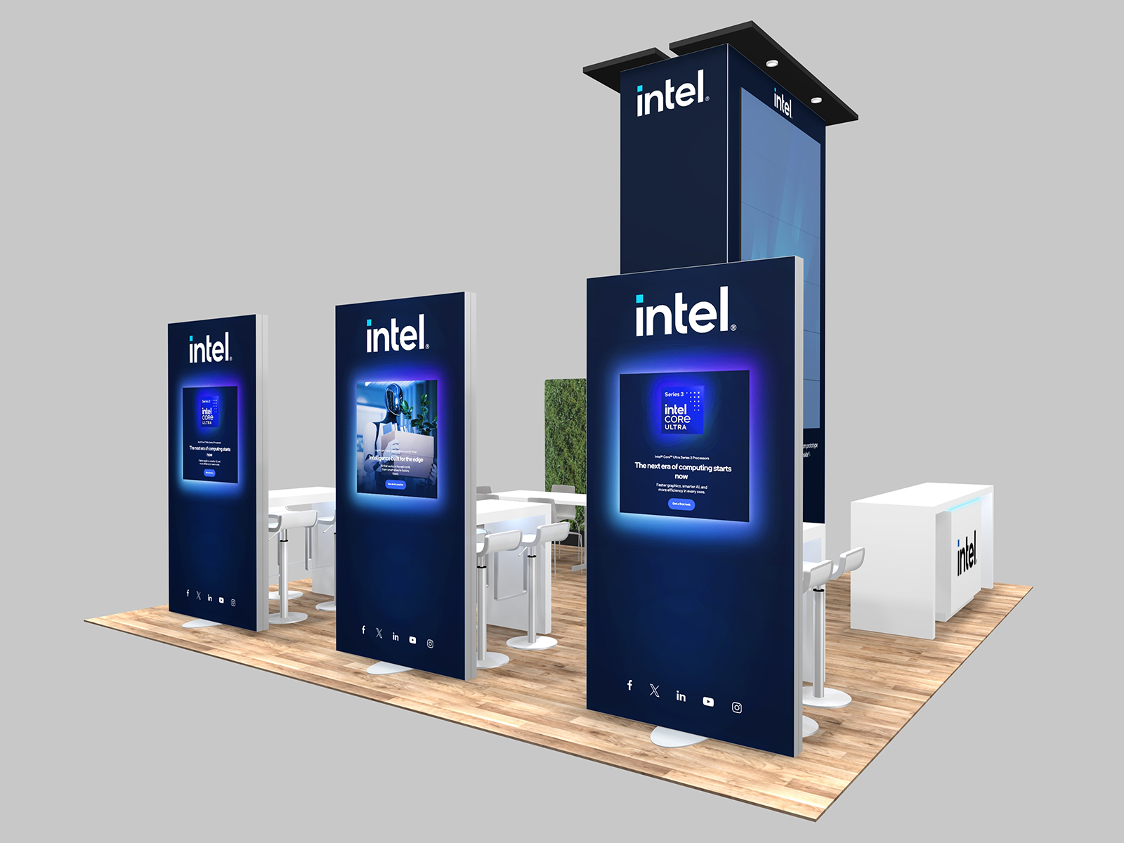 The 20 x 20 exhibit includes casual and demo seating, closet and counter storage, and monitor mounts. The central tower supports a video tile option along with walk-in closet storage. The waterfall counters attach to double-sided SuperNova lightboxes with backlit fabric graphics.