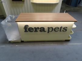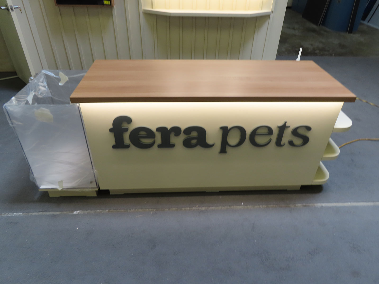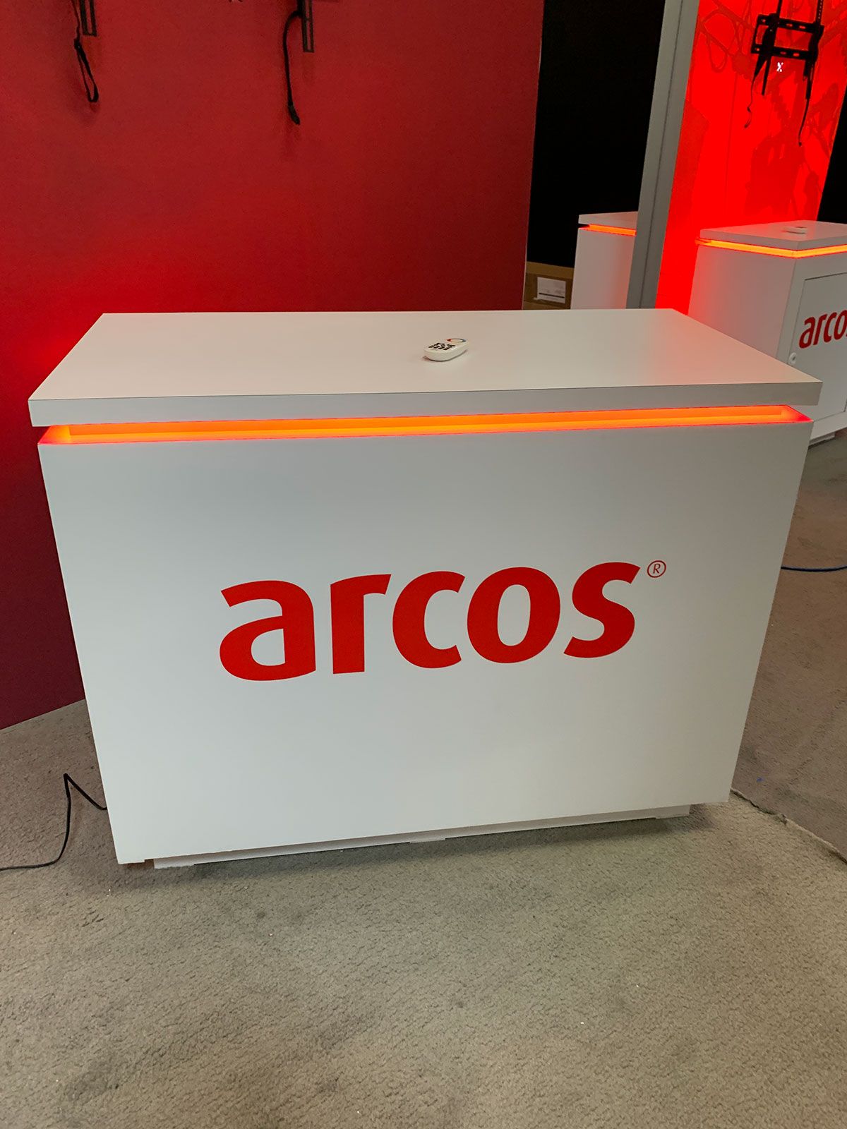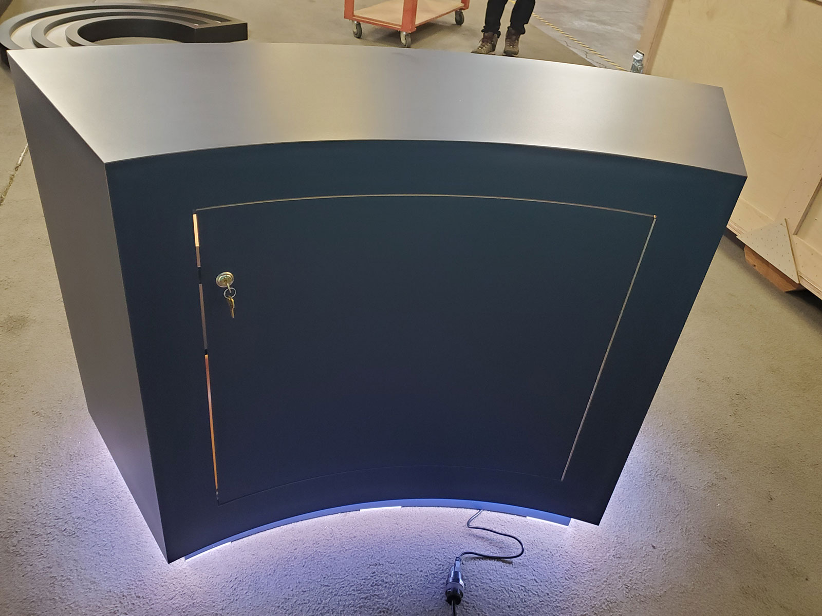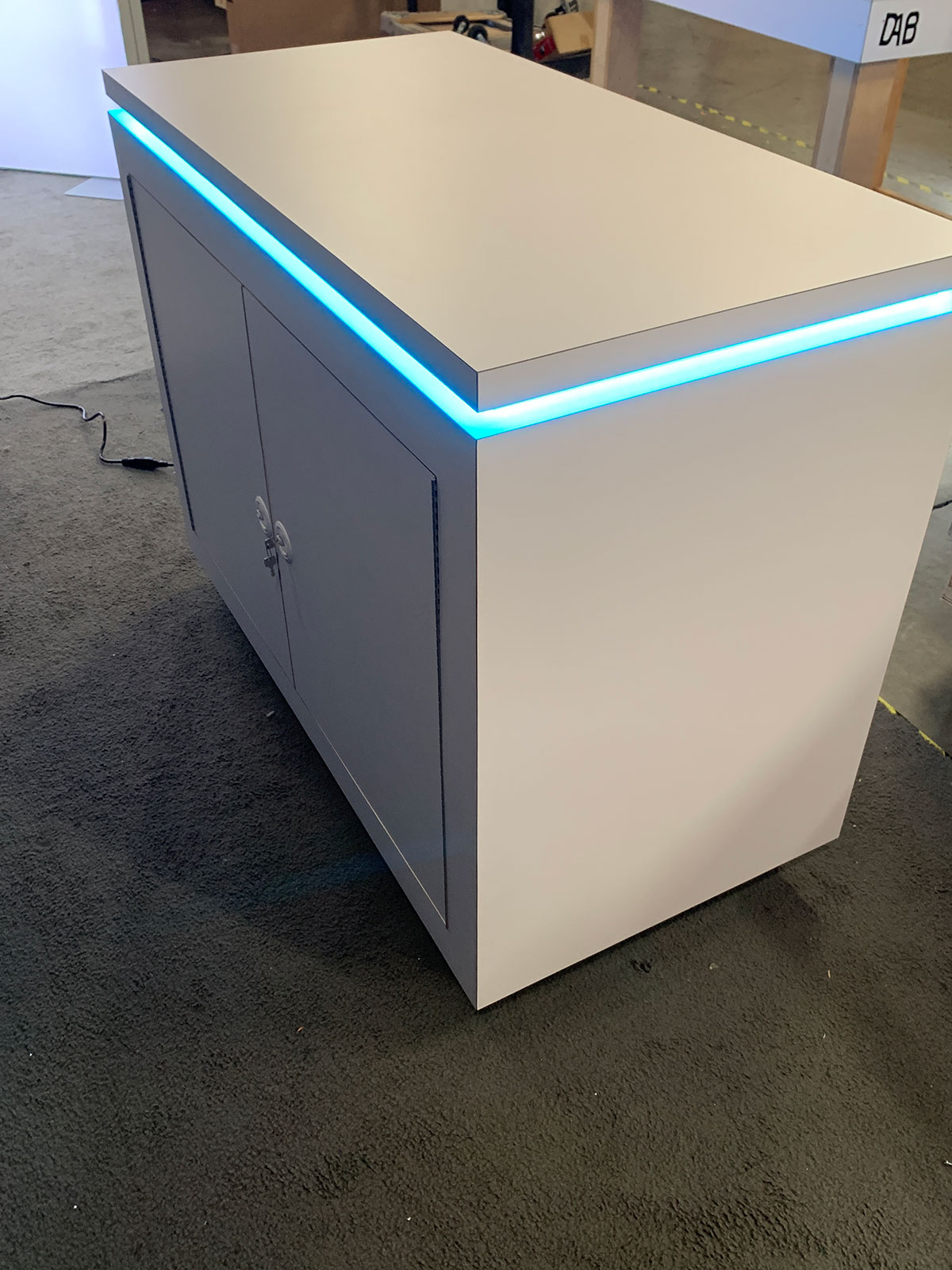 Custom Product Display Counter with Backlit Logo and LED Accent Lights, Locking Storage, and Plex Display Case Custom Product Display Counter with Backlit Logo and LED Accent Lights, Locking Storage, and Plex Display Case