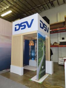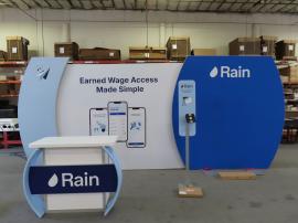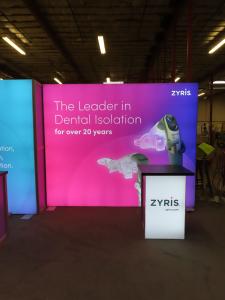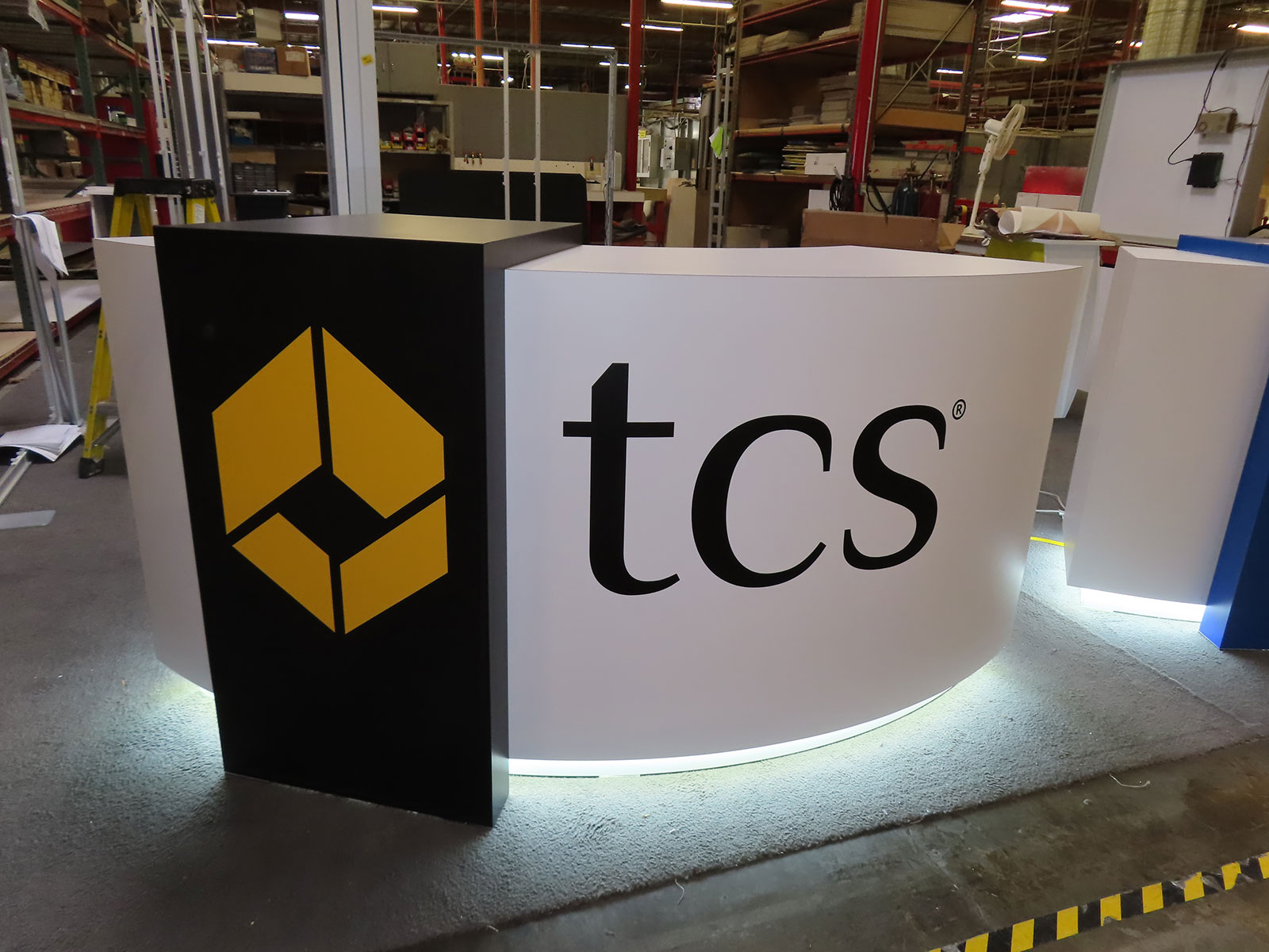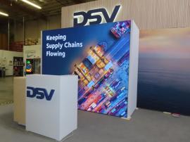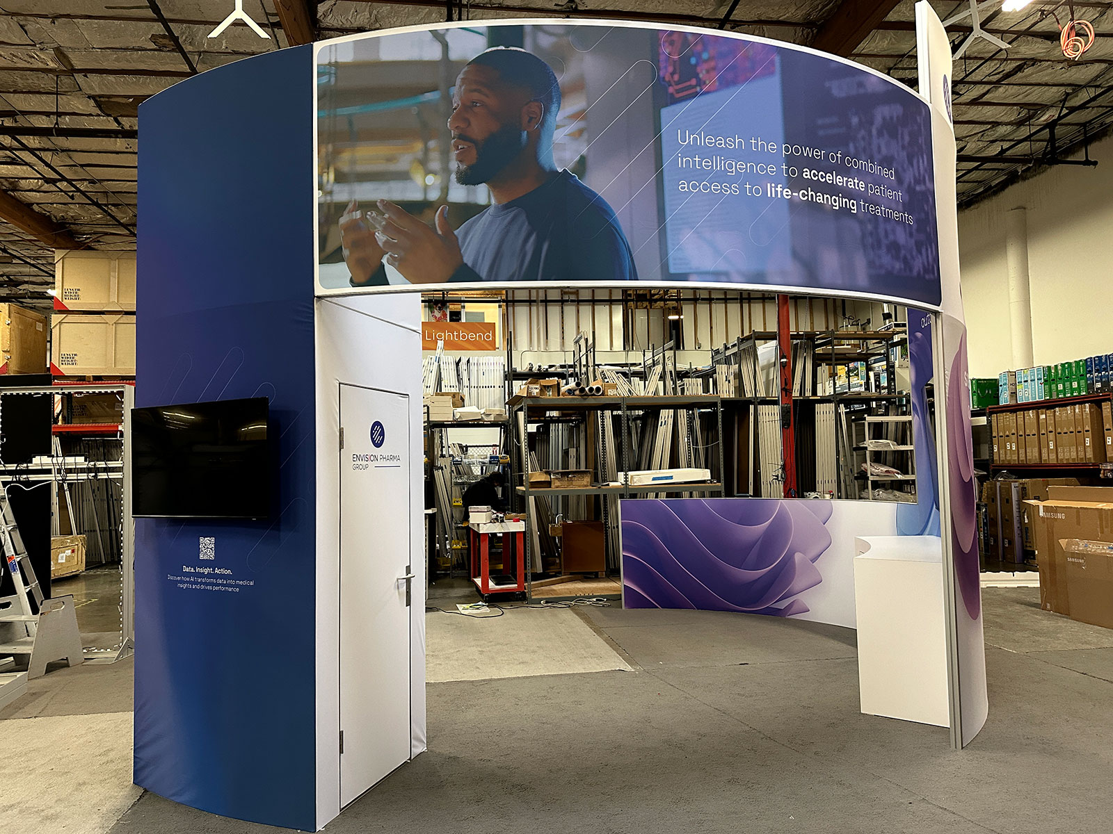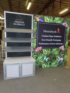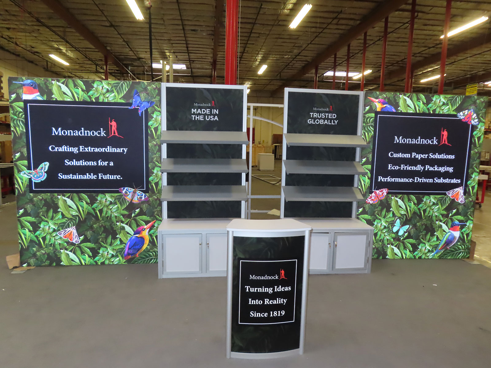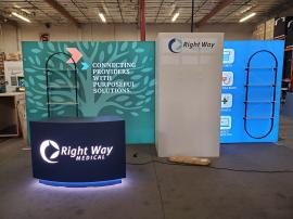 Modified ECO-2064 Sustainable Exhibit with Tension Fabric and Direct Print Graphics, Header, Acrylic Shlelves, Locking Storage, LED Lighting, Privacy Wall, Monitor Mount, and MOD-1716 Backlit Reception Counter with Locking Storage [ORD-67046]
