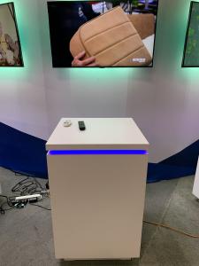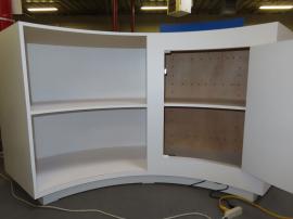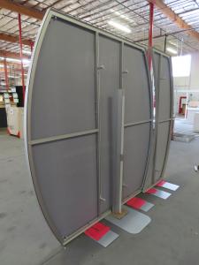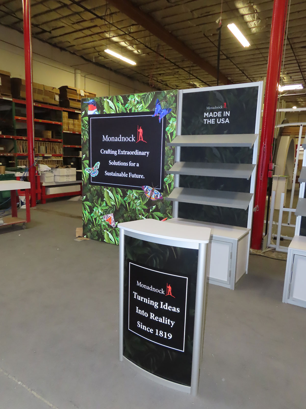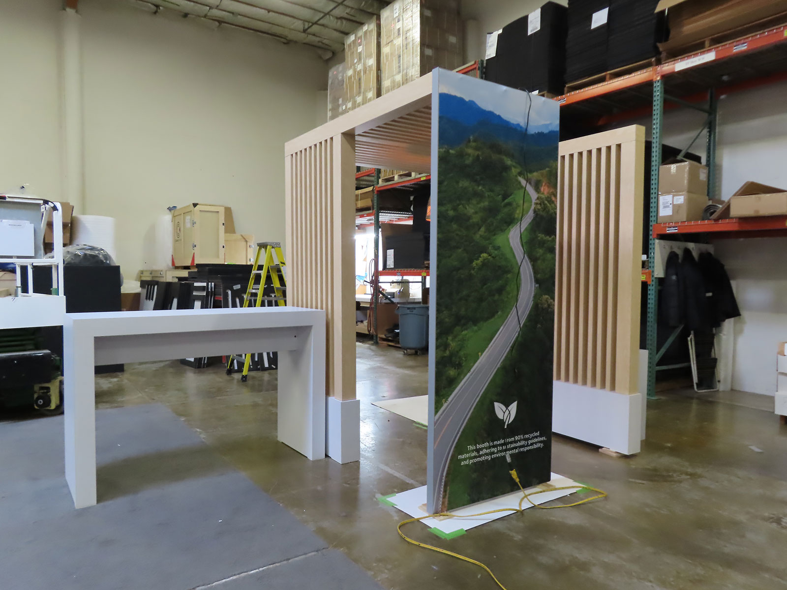 Modified ECO-2038 Sustainable Exhibit with Shelves, Locking Closet, Lightbox, SEG Fabric Graphics, Monitor Mount, and MOD-1590 Backlit Reception Counter with Locking Storage Modified ECO-2038 Sustainable Exhibit with Shelves -- View 2 Modified ECO-2038 Sustainable Exhibit with Shelves -- View 3 Modified ECO-2038 Sustainable Exhibit with Shelves -- View 4