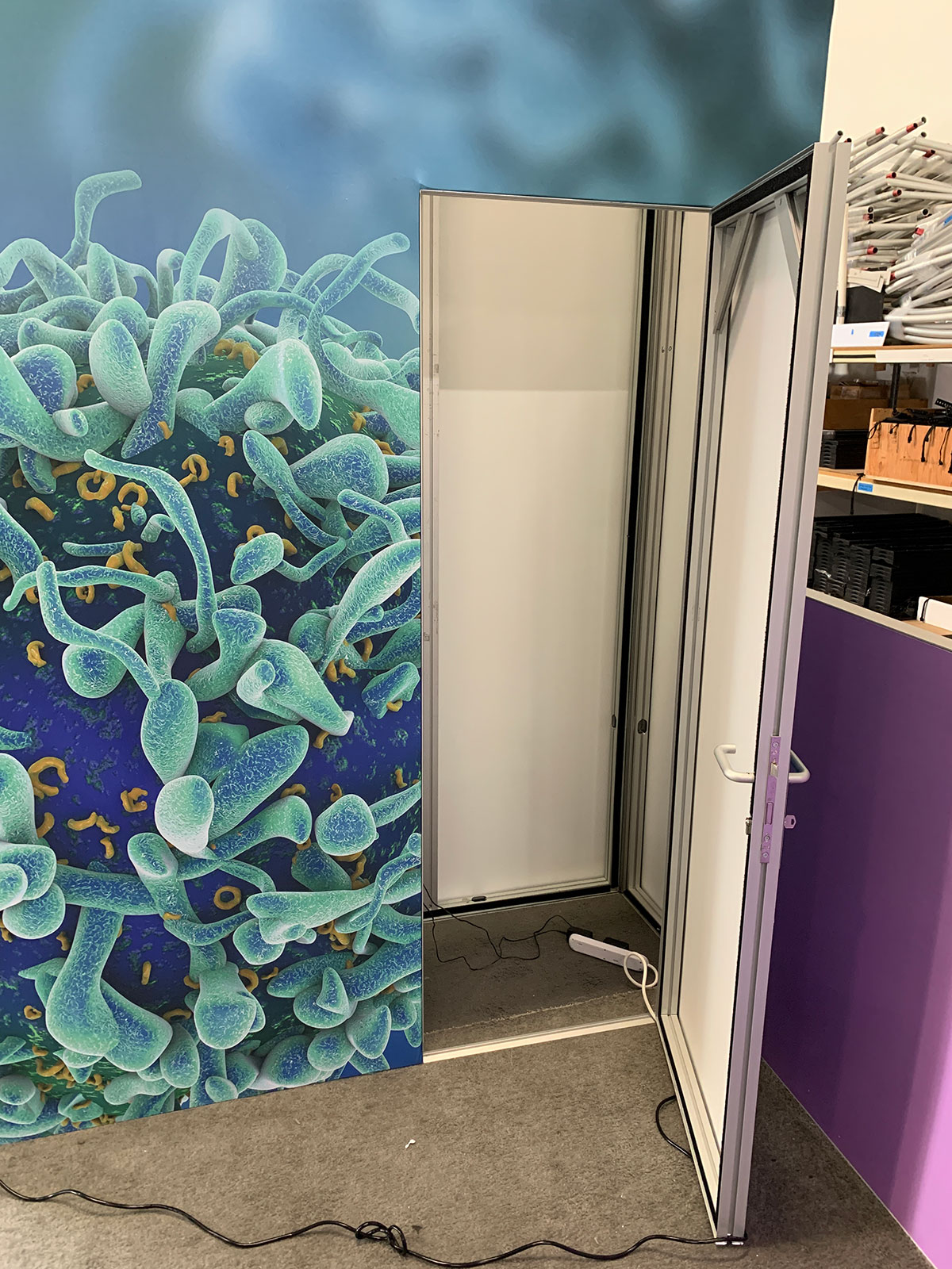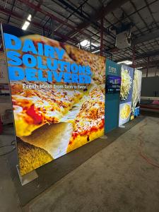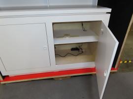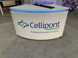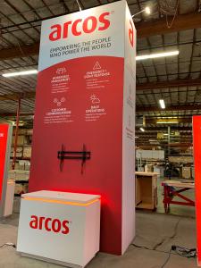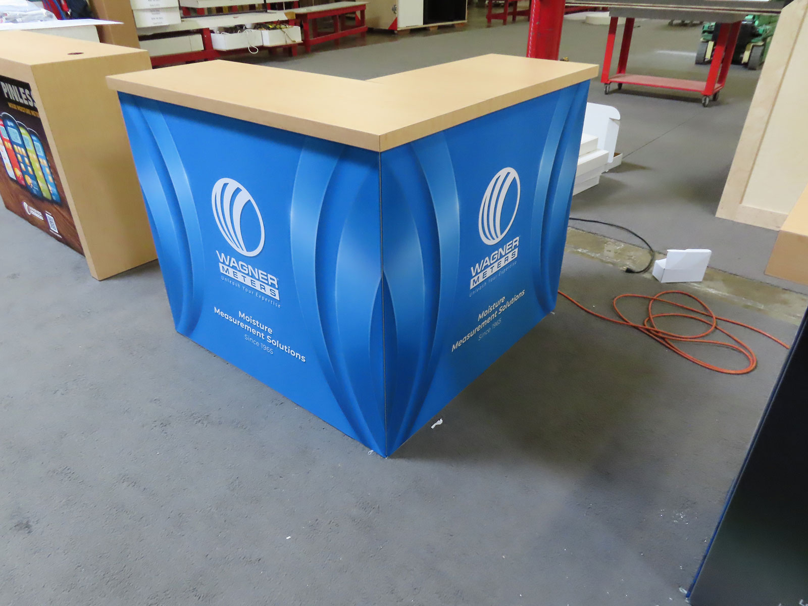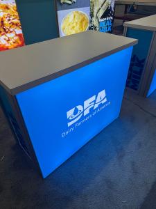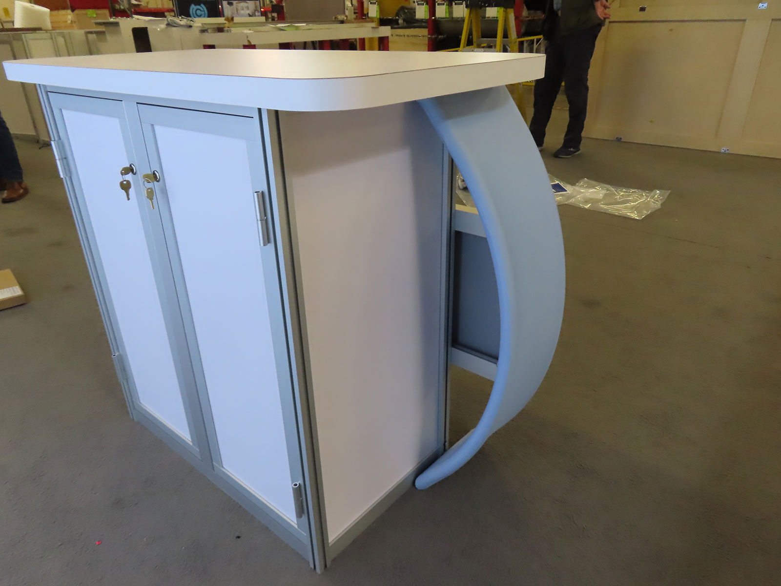 Modified ECO-2038 Sustainable Exhibit with Shelves, Locking Closet, Lightbox, SEG Fabric Graphics, Monitor Mount, and MOD-1590 Backlit Reception Counter with Locking Storage [ORD-69141]