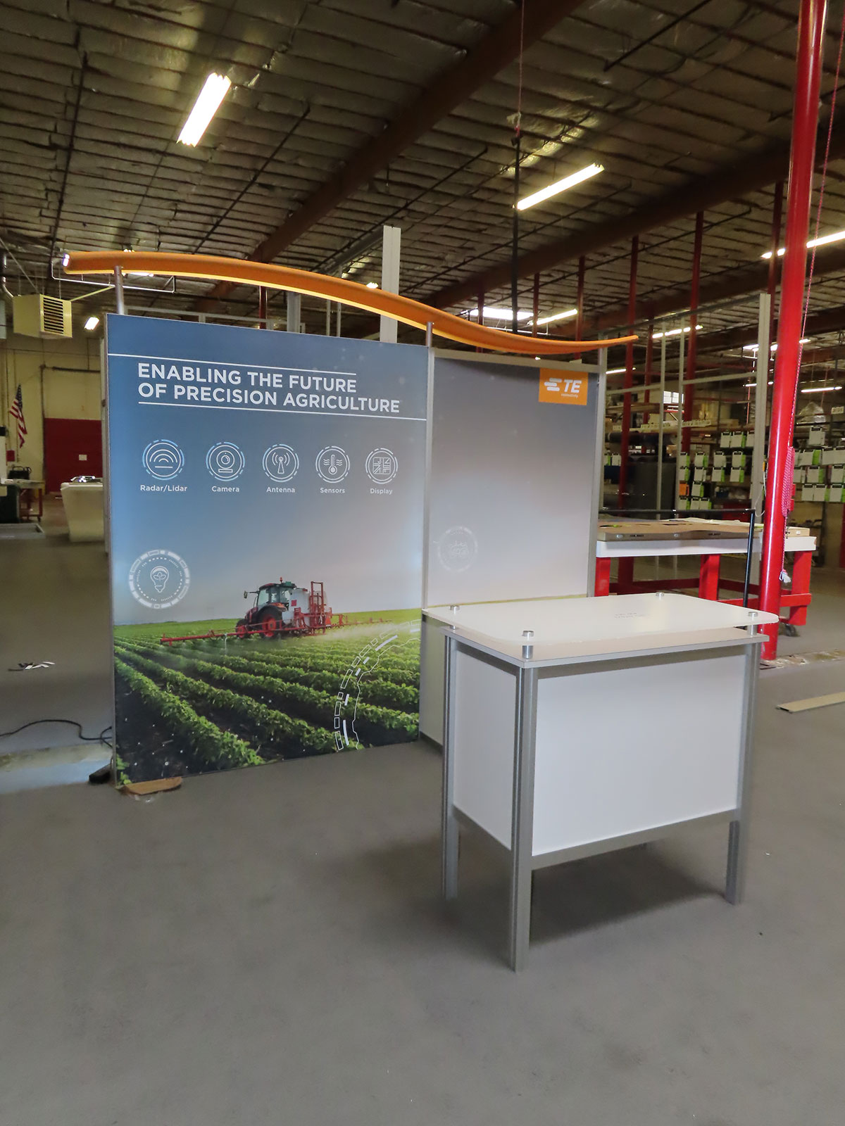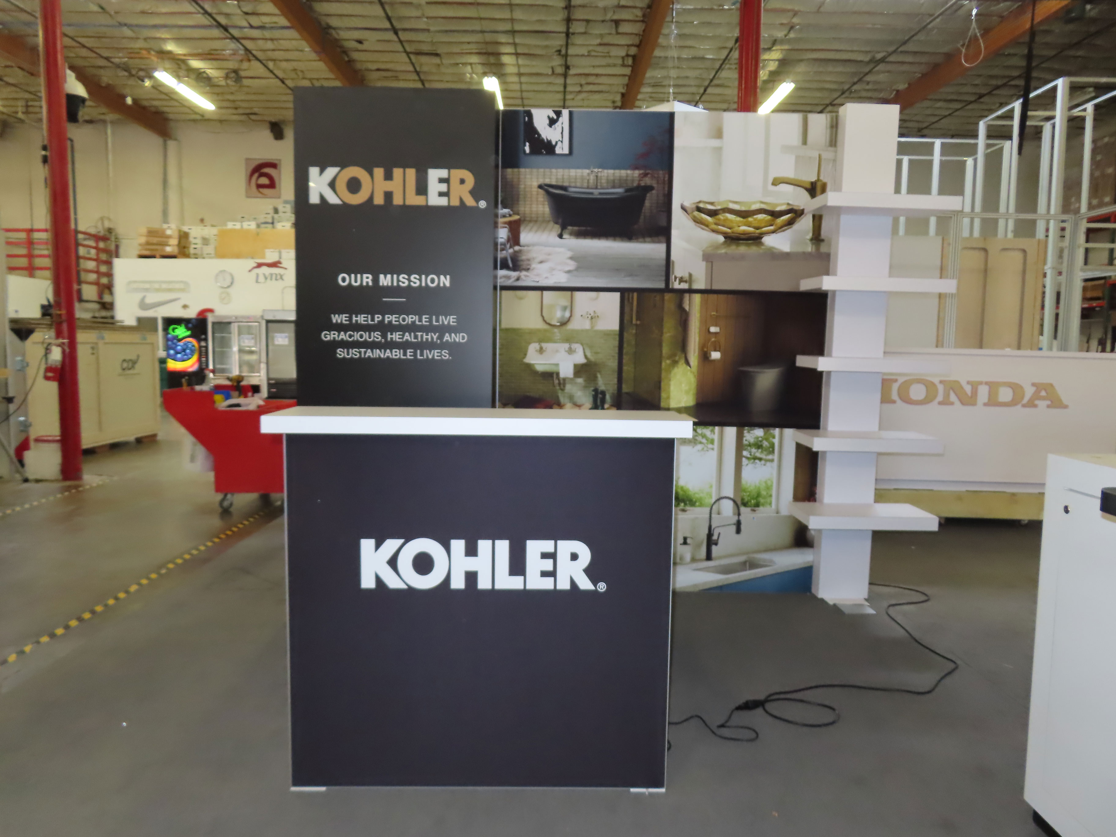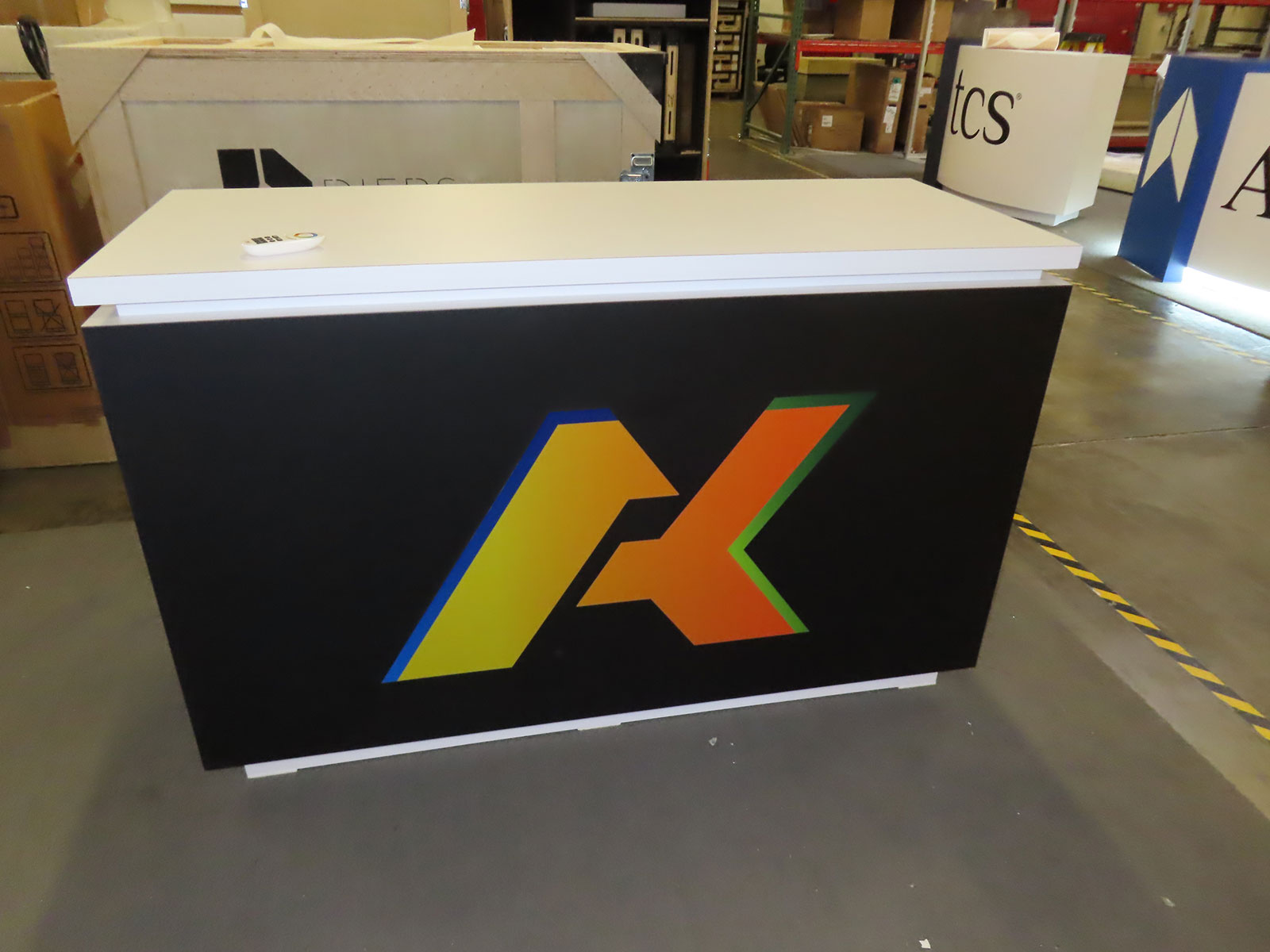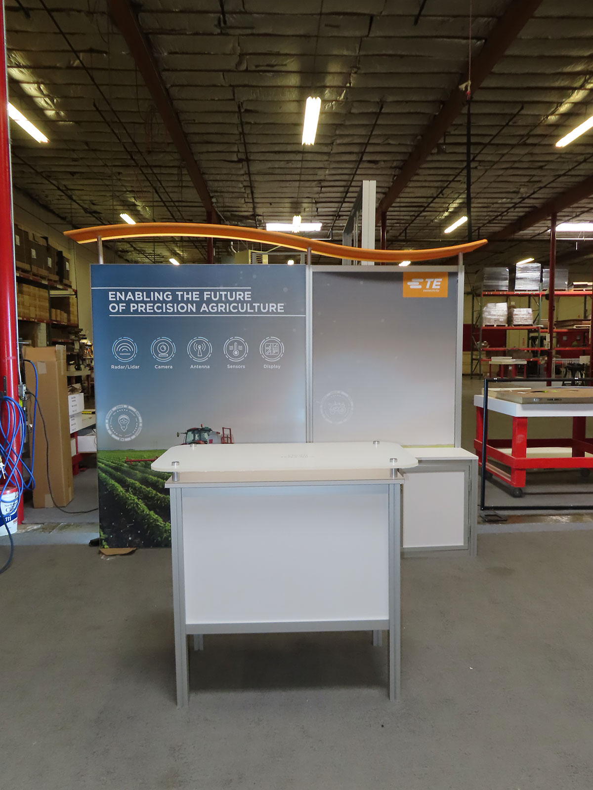 Modified VK-4044 Reconfigurable Inline Exhibit with Shelves, Monitor Mount, Backlit Fabric Graphics, Canopy, Modified MOD-1726 Counter with Locking Storage, and Product Display. Shown w/o LED Video Tiles (Center Section) [ORD-69091]
