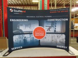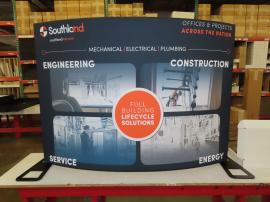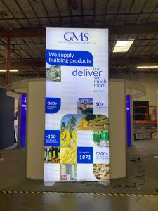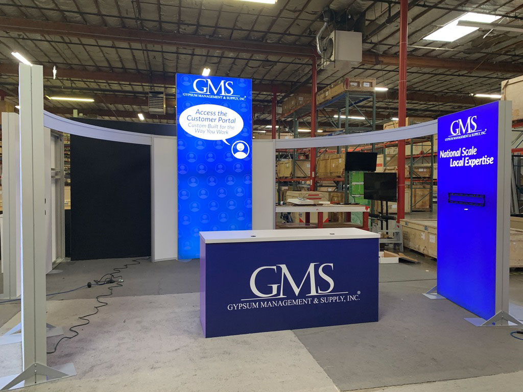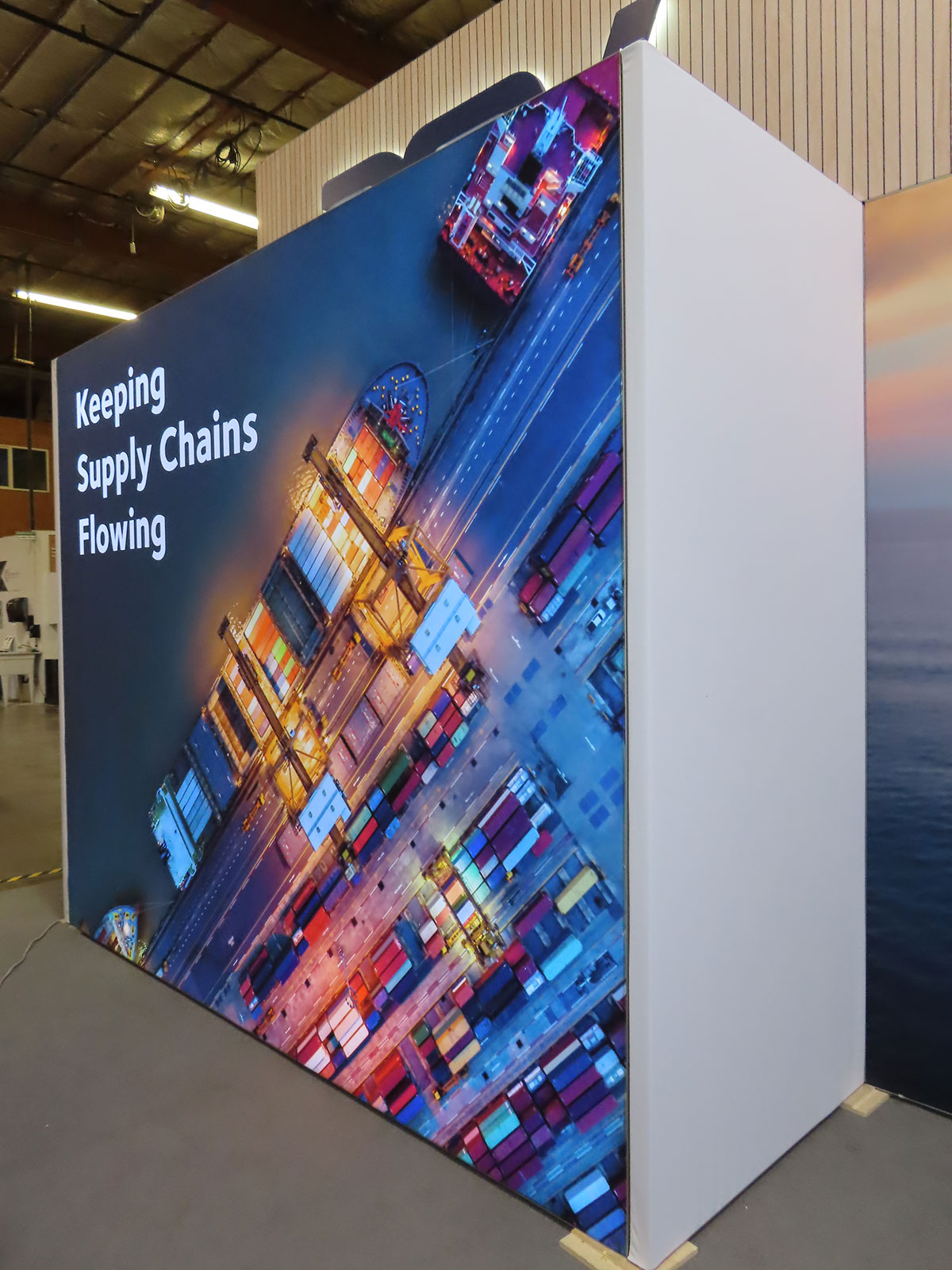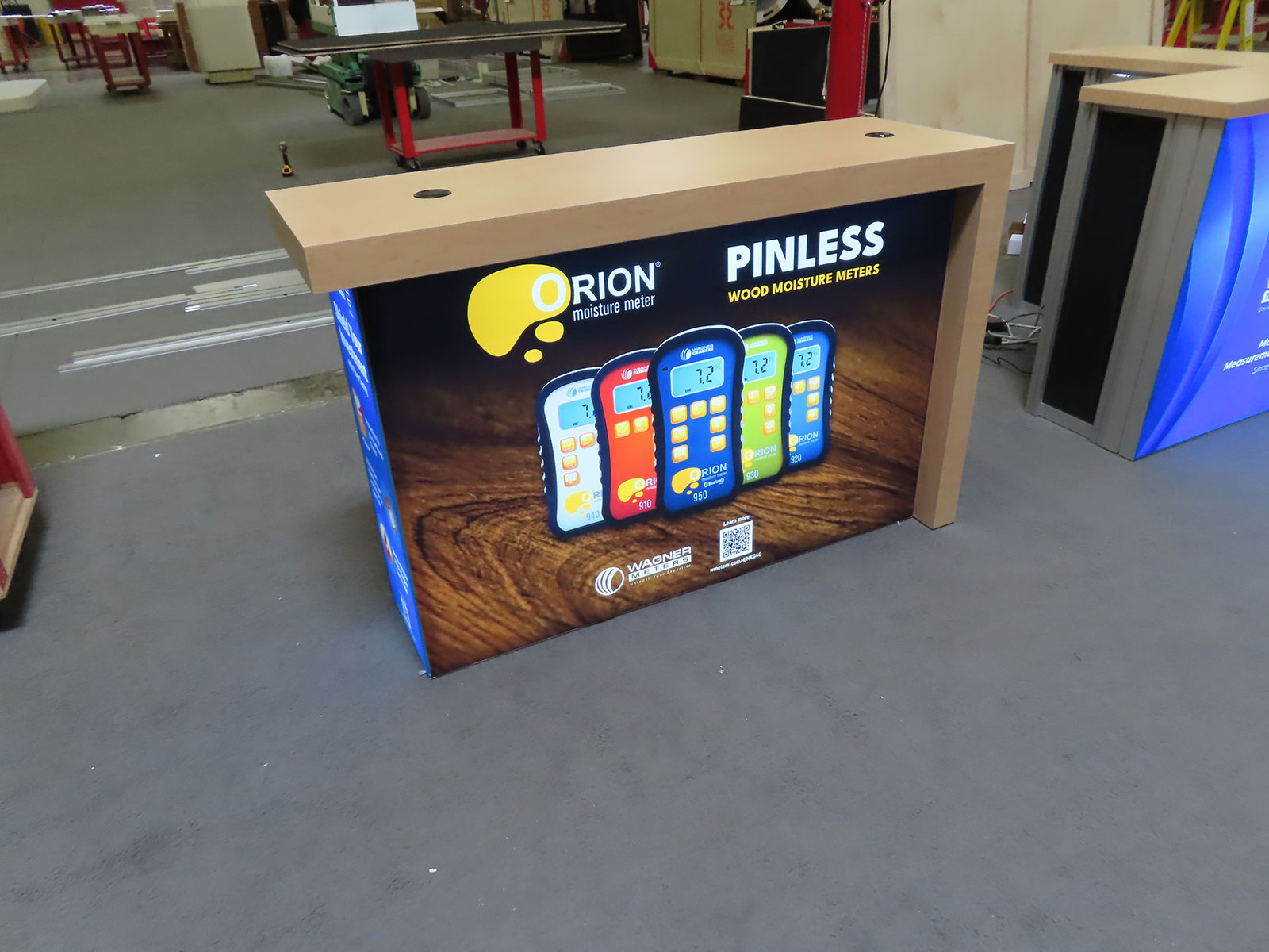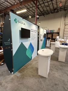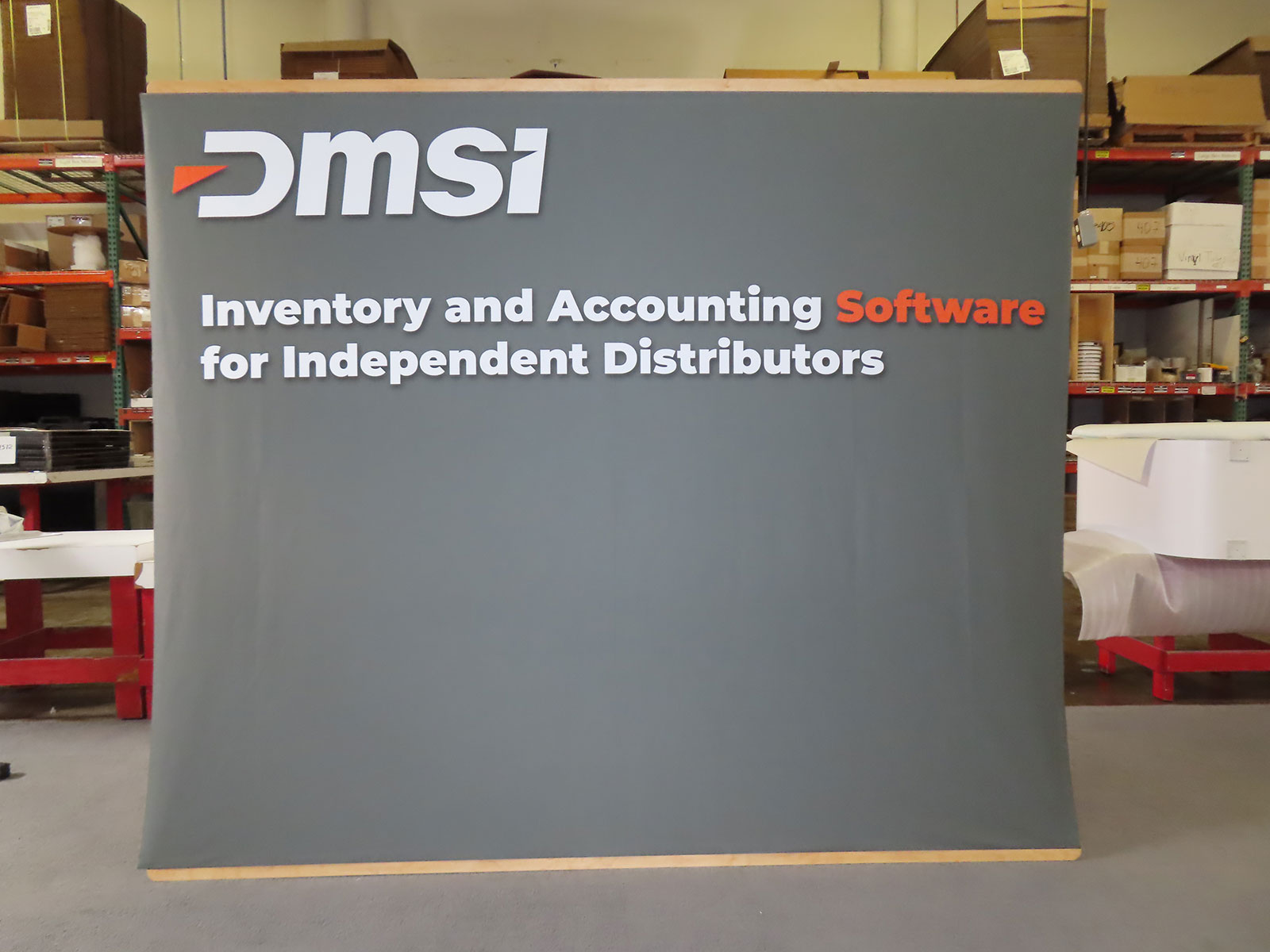 RENTAL: Modified RE-2103 Inline Design with Gravitee Panel System Backwall, Custom Hardrock Maple Laminated Soffits with Recessed Puck Lights, Extrusion Supported Laminated Shelving, Large Monitor Mount, 85" Monitor with HDMI Cable, SEG Fabric Graphics [ORD-69166]