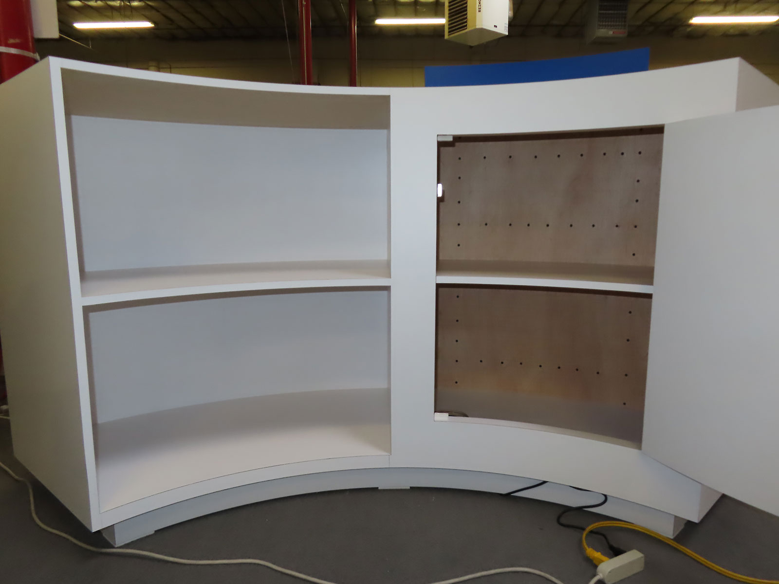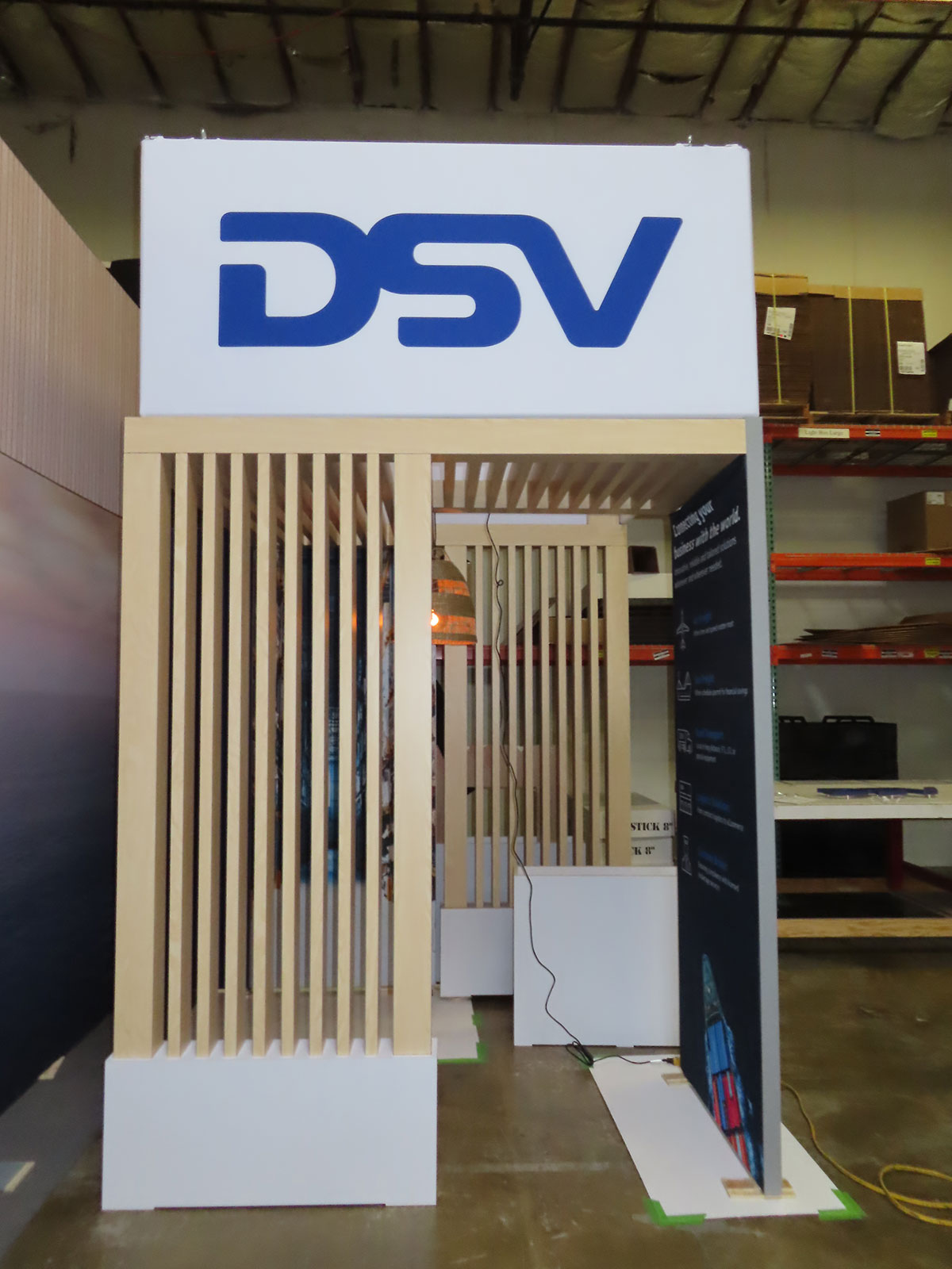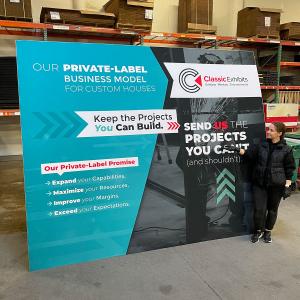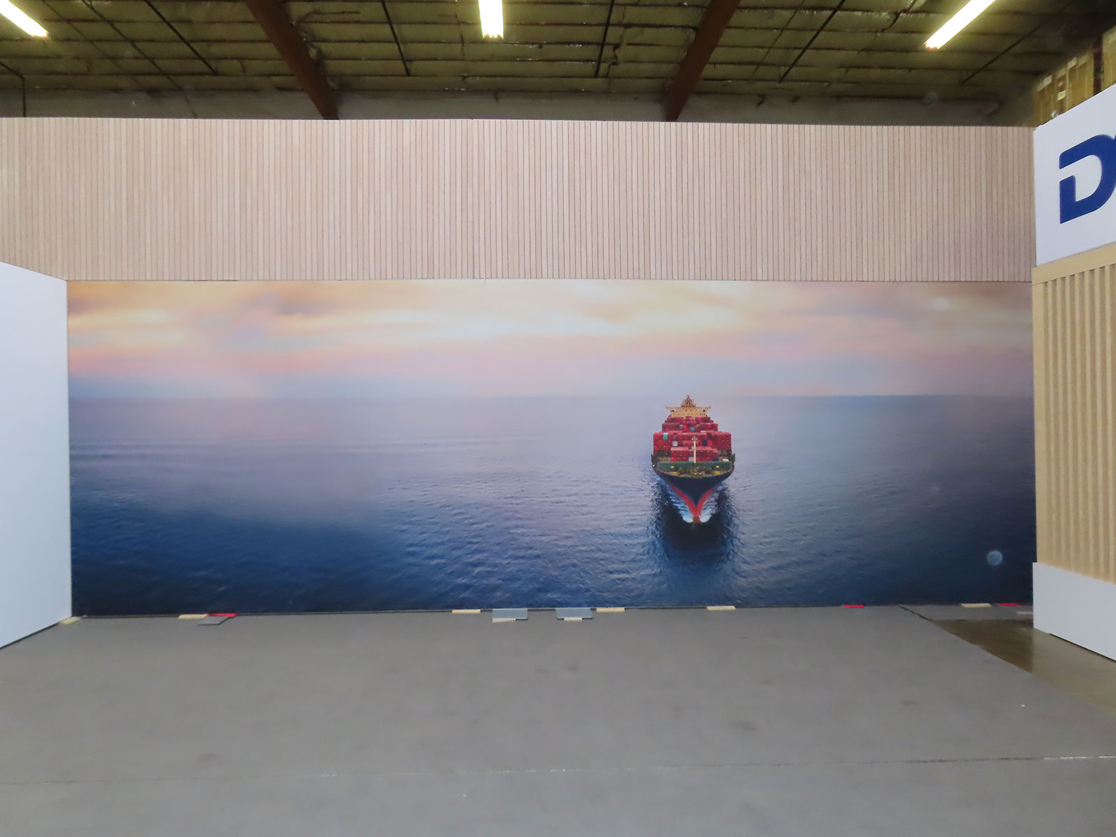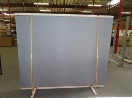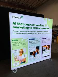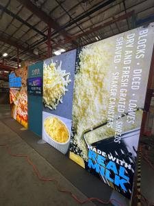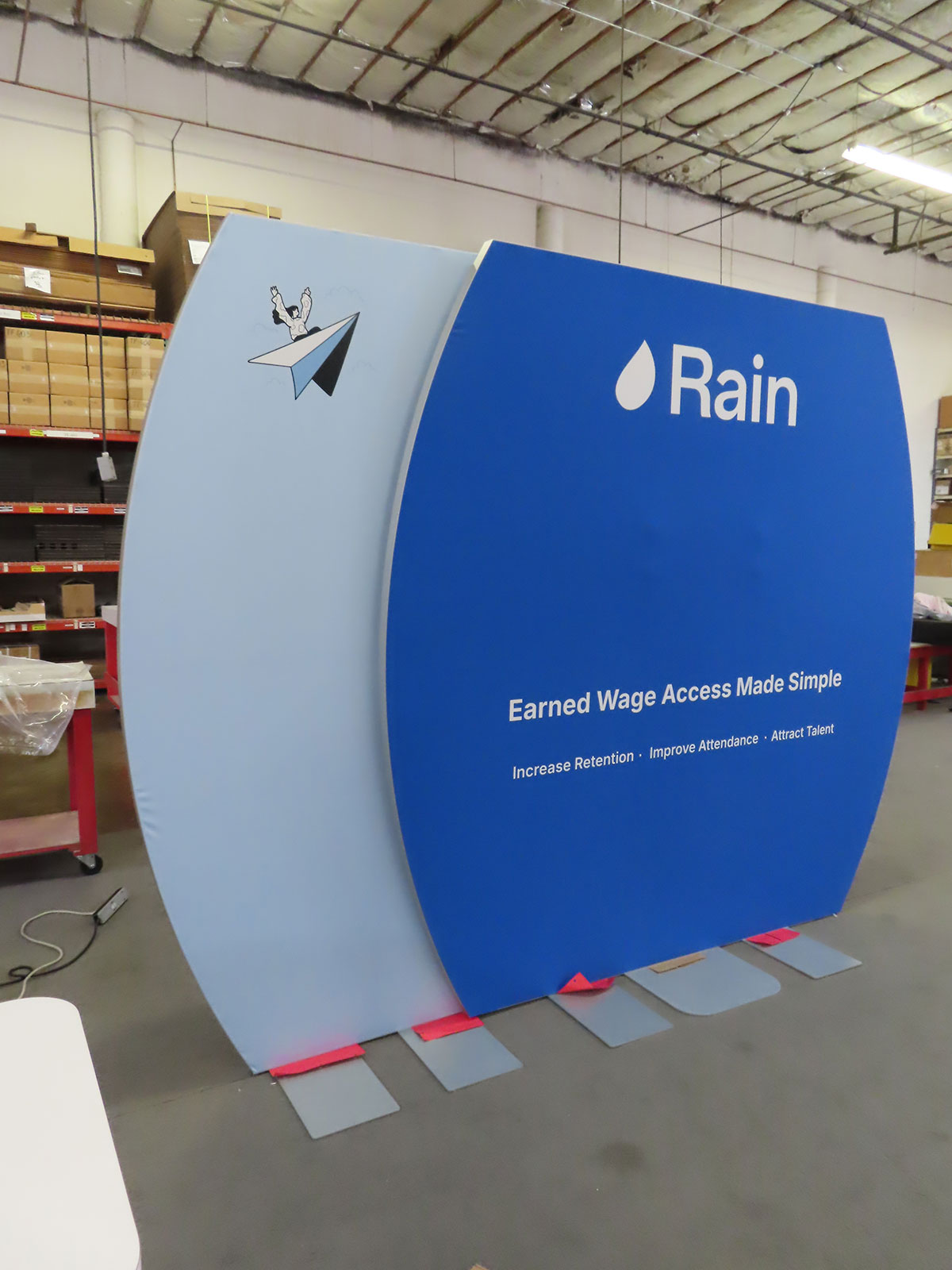 RENTAL: Modified RE-2103 Inline Design with Gravitee Panel System Backwall, Custom Hardrock Maple Laminated Soffits with Recessed Puck Lights, Extrusion Supported Laminated Shelving, Large Monitor Mount, 85" Monitor with HDMI Cable, SEG Fabric Graphics [ORD-69166]