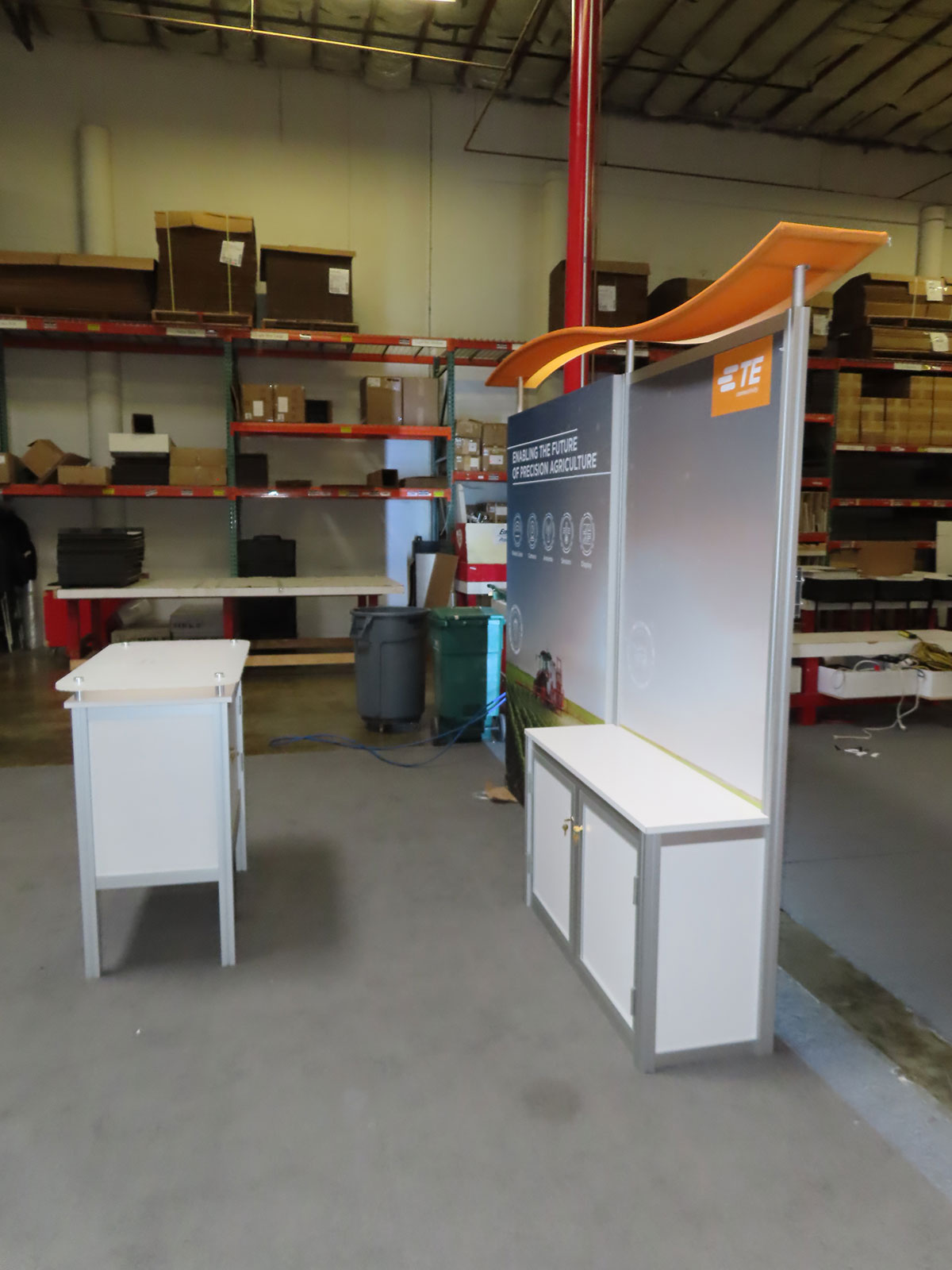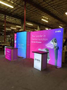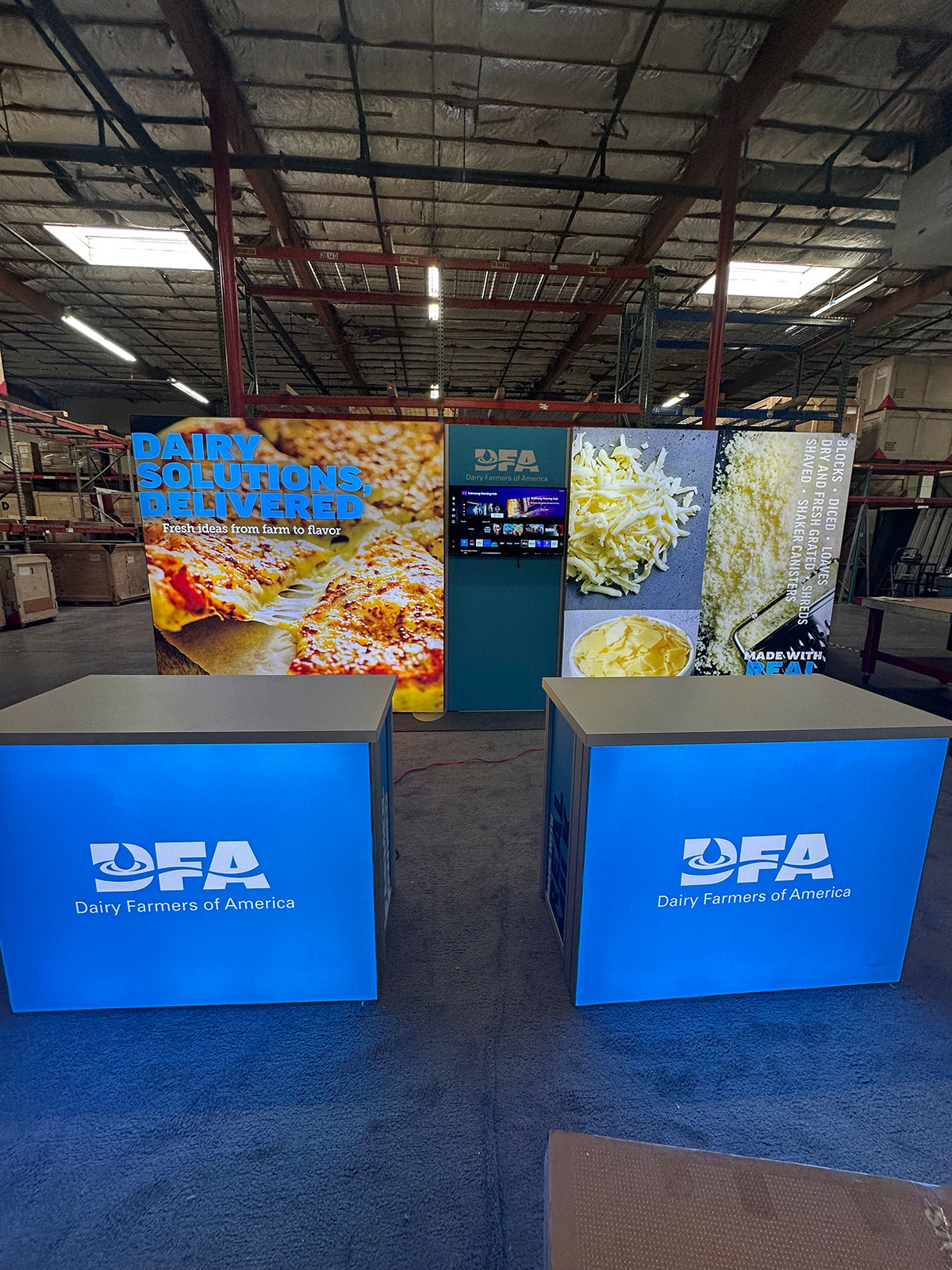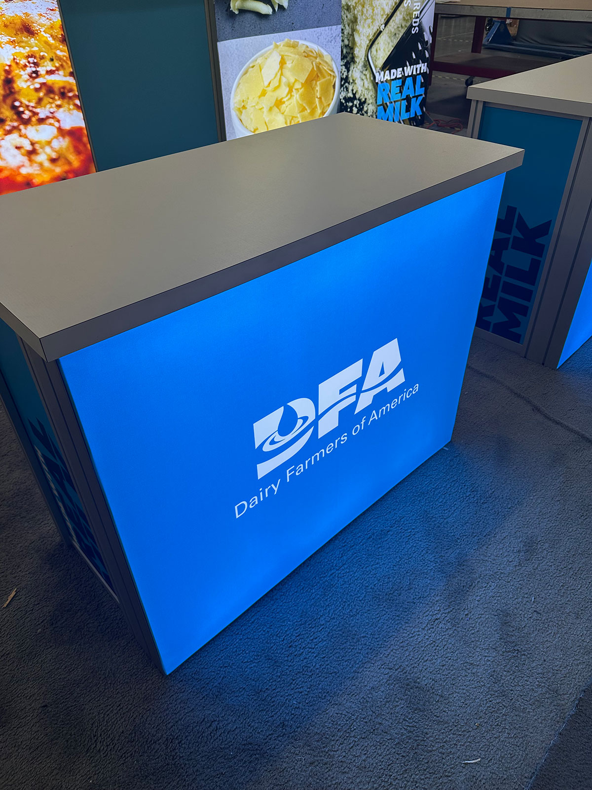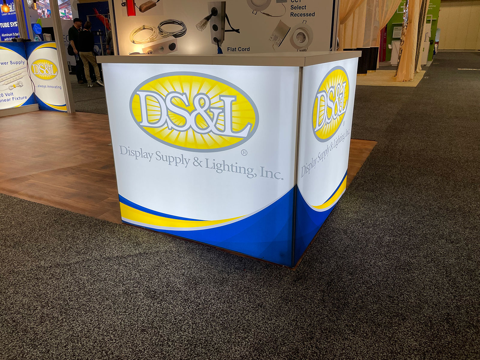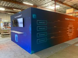 Custom Inline Exhibit with SuperNova Backlit Lightboxes, (4) Product Shelves, Storage Closet, Fabric and Direct Print Graphics, Reception Counter w/ Open Storage, and Counter w/ Locking Storage and Wireless Charging Pads [ORD-69079]