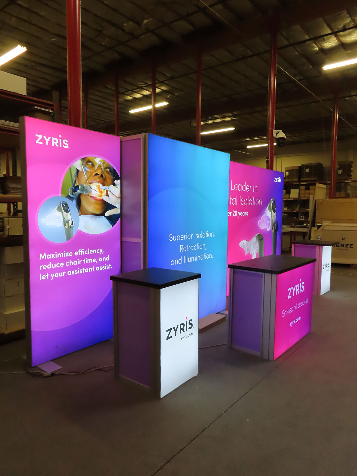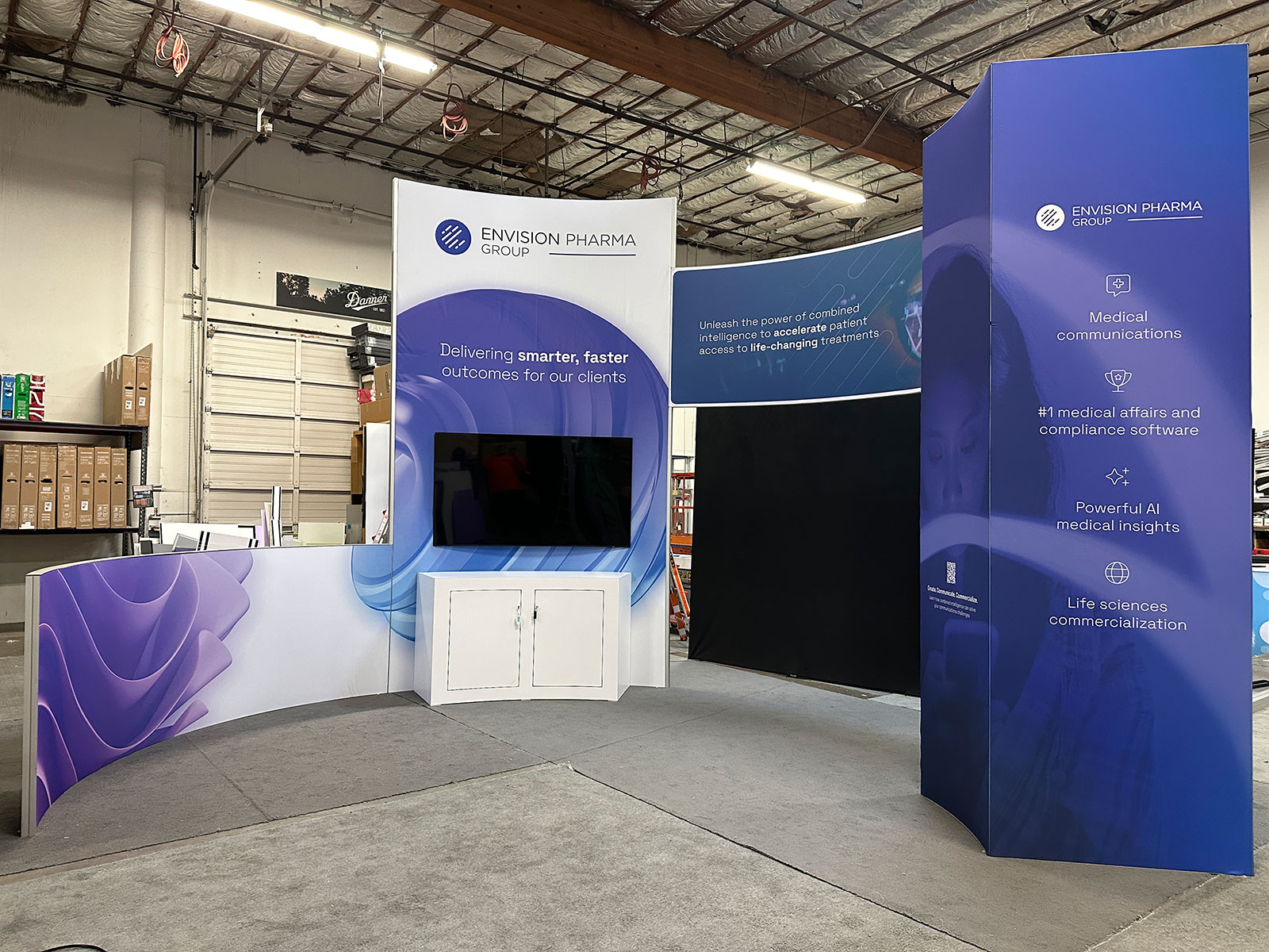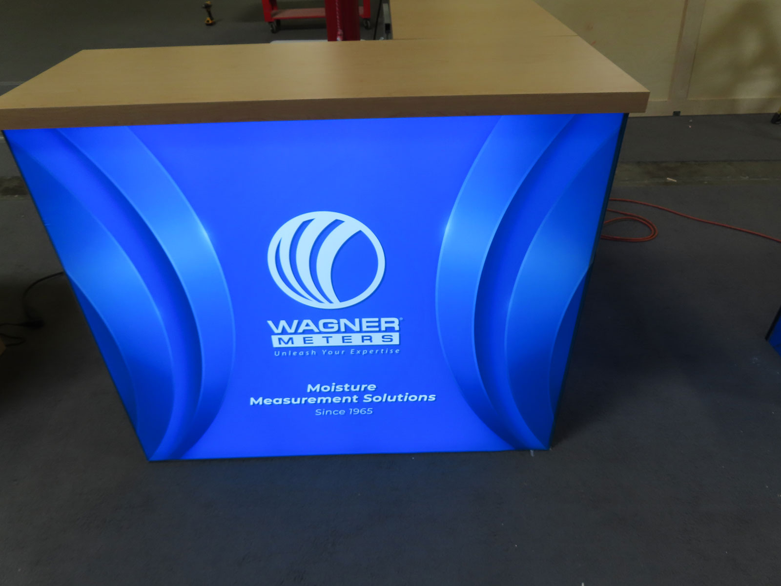 Custom Inline Exhibit with SuperNova Backlit Lightboxes, (4) Product Shelves, Storage Closet, Fabric and Direct Print Graphics, Reception Counter w/ Open Storage, and Counter w/ Locking Storage and Wireless Charging Pads [ORD-69079]