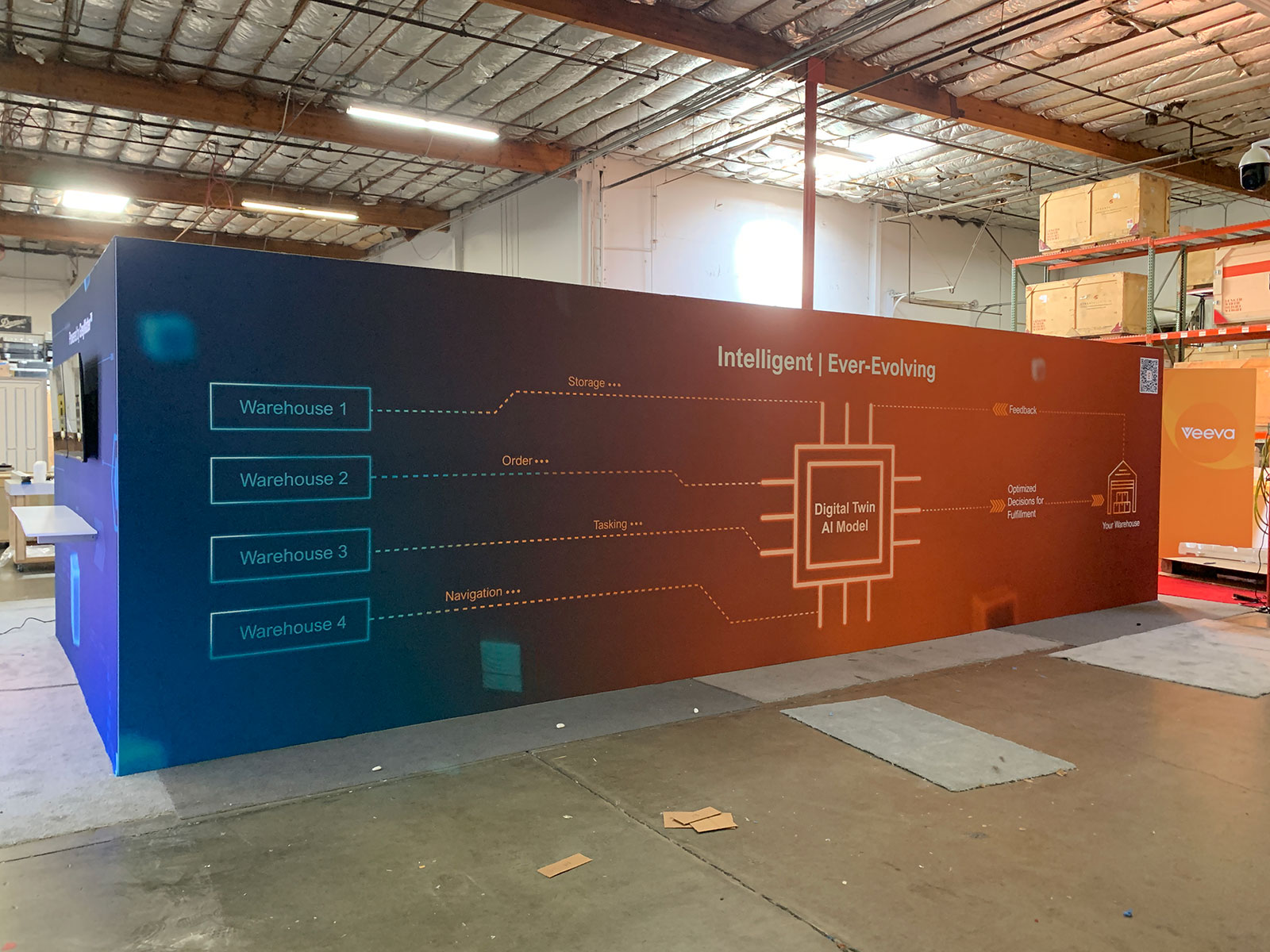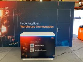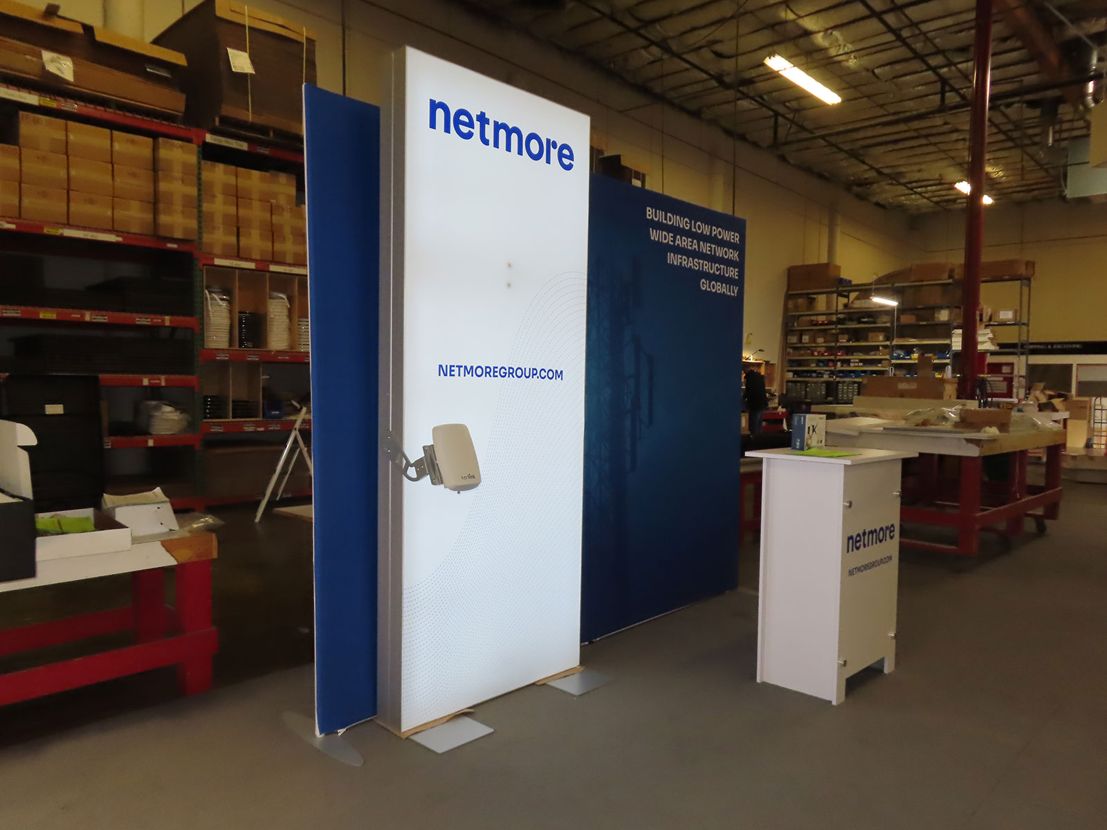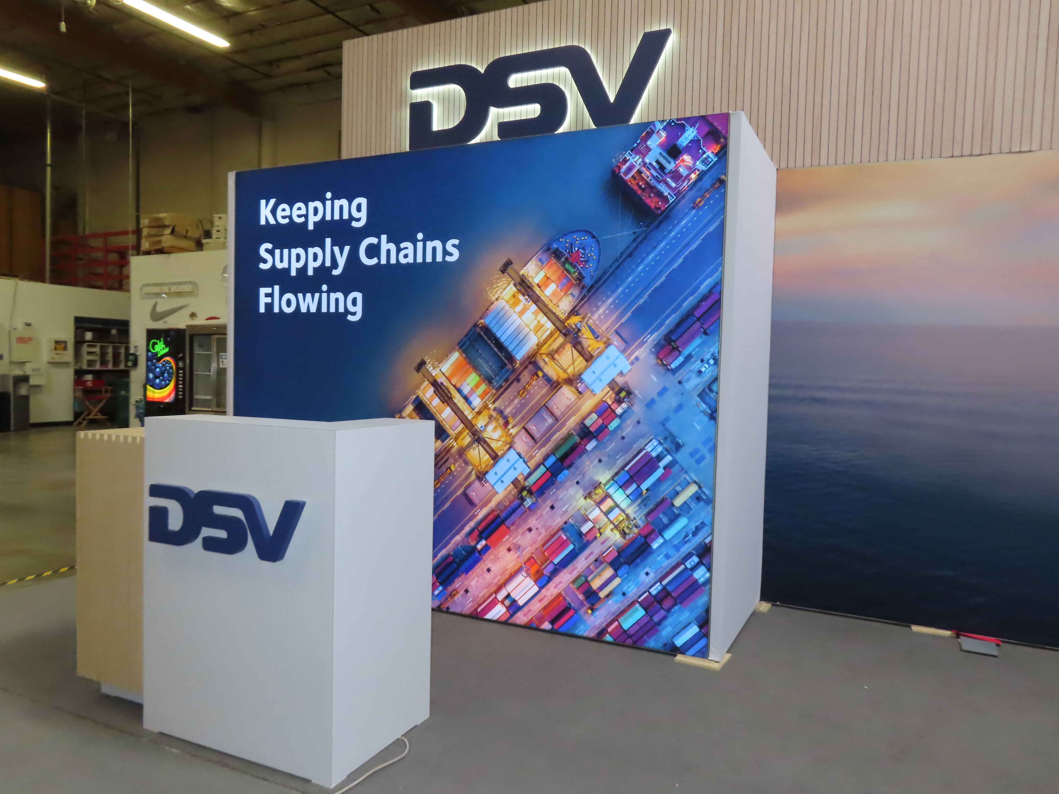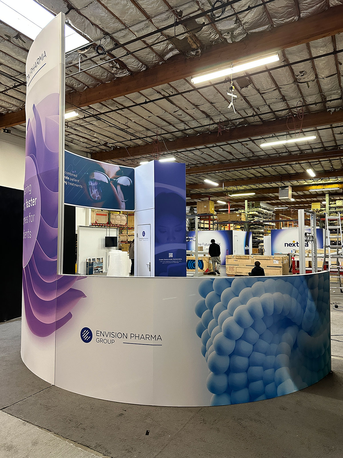 Custom Inline Exhibit with SuperNova Backlit Lightboxes, (4) Product Shelves, Storage Closet, Fabric and Direct Print Graphics, Reception Counter w/ Open Storage, and Counter w/ Locking Storage and Wireless Charging Pads [ORD-69079]
