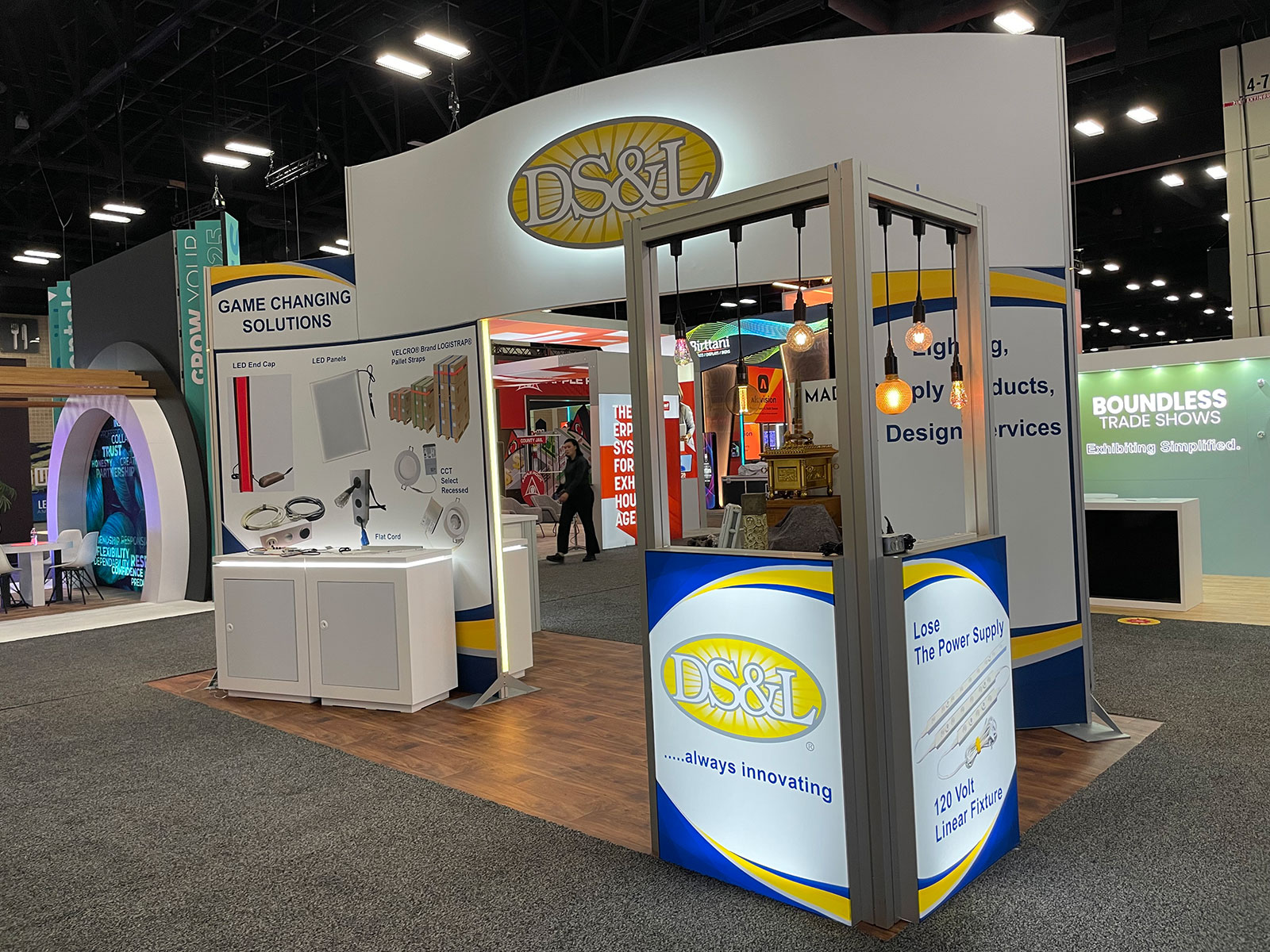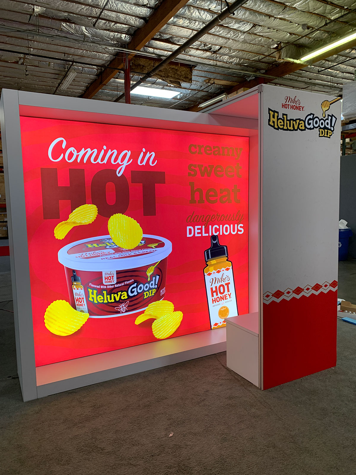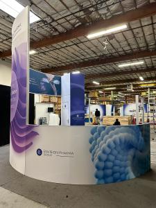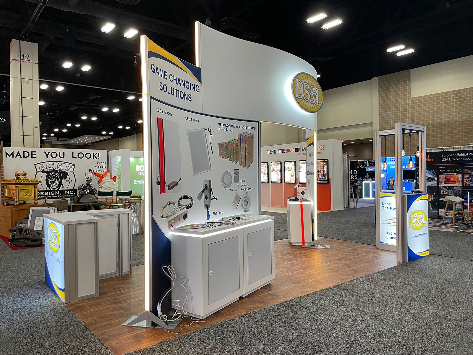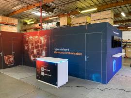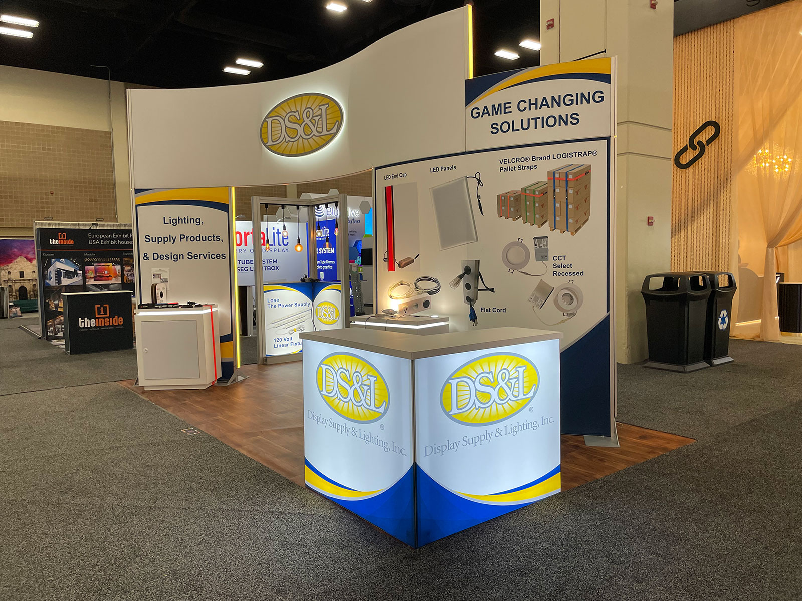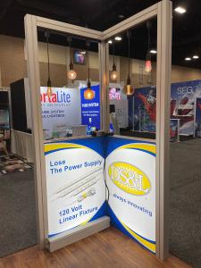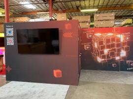 Custom Inline Exhibit with SuperNova Backlit Lightboxes, (4) Product Shelves, Storage Closet, Fabric and Direct Print Graphics, Reception Counter w/ Open Storage, and Counter w/ Locking Storage and Wireless Charging Pads Custom Inline Exhibit with SuperNova Backlit Lightboxes -- View 2 Custom Inline Exhibit with SuperNova Backlit Lightboxes -- View 3 Custom Inline Exhibit with SuperNova Backlit Lightboxes -- View 4 Custom Inline Exhibit with SuperNova Backlit Lightboxes -- View 5 Custom Inline Exhibit with SuperNova Backlit Lightboxes -- View 6