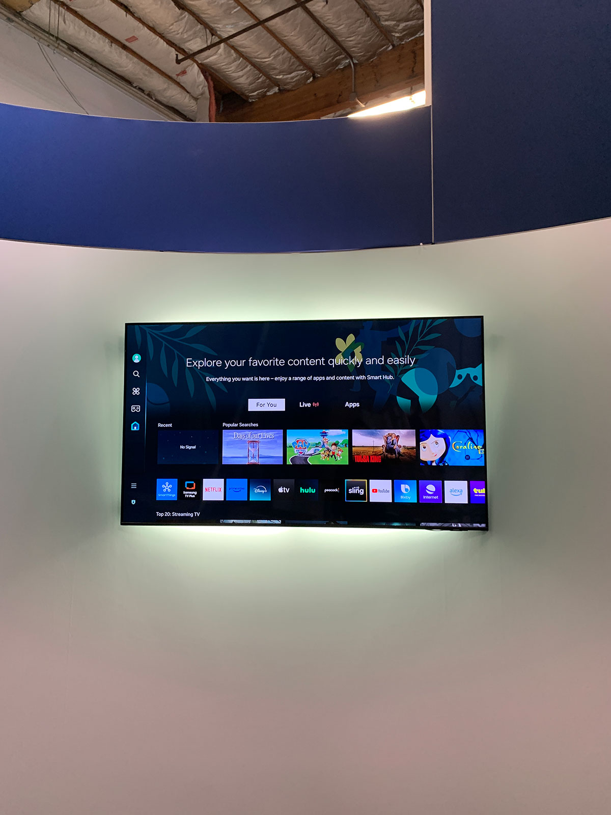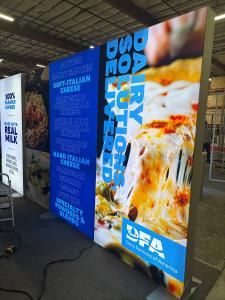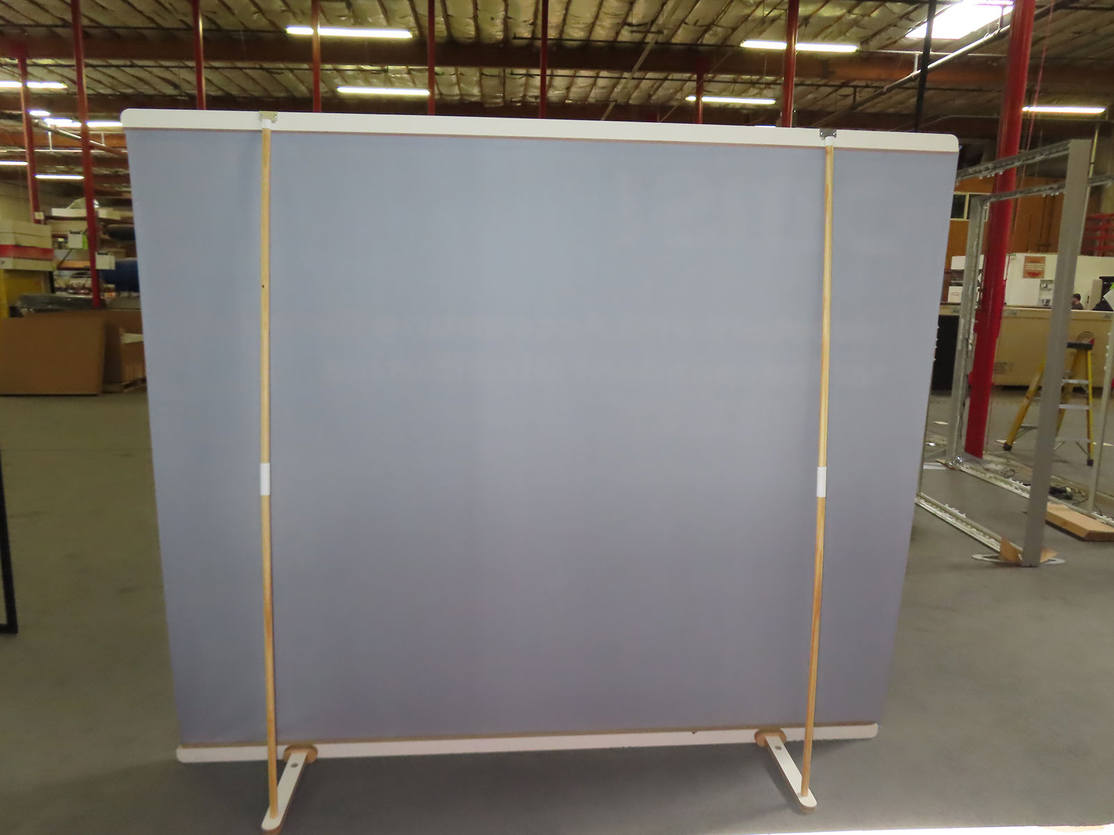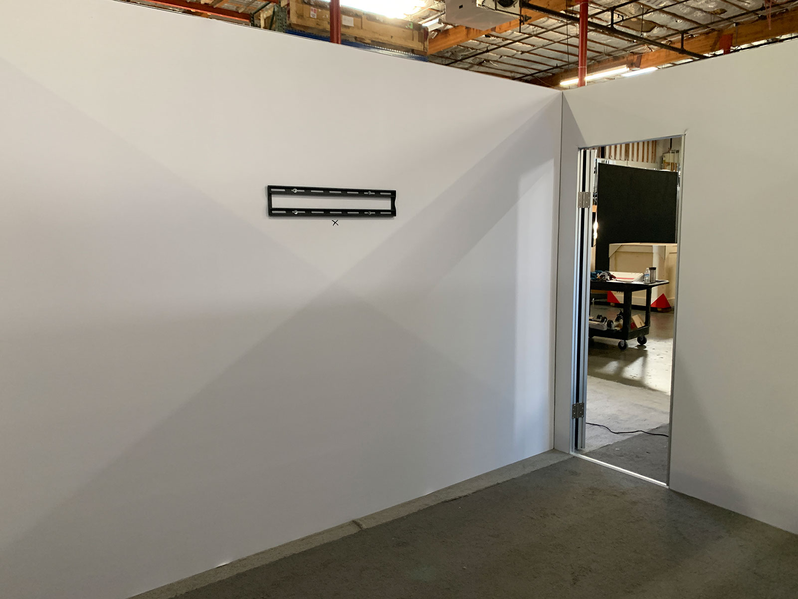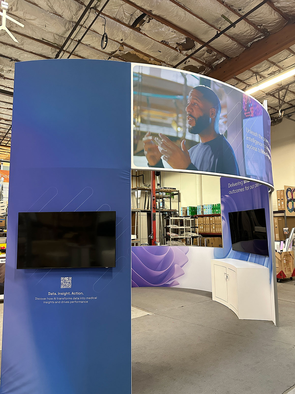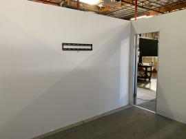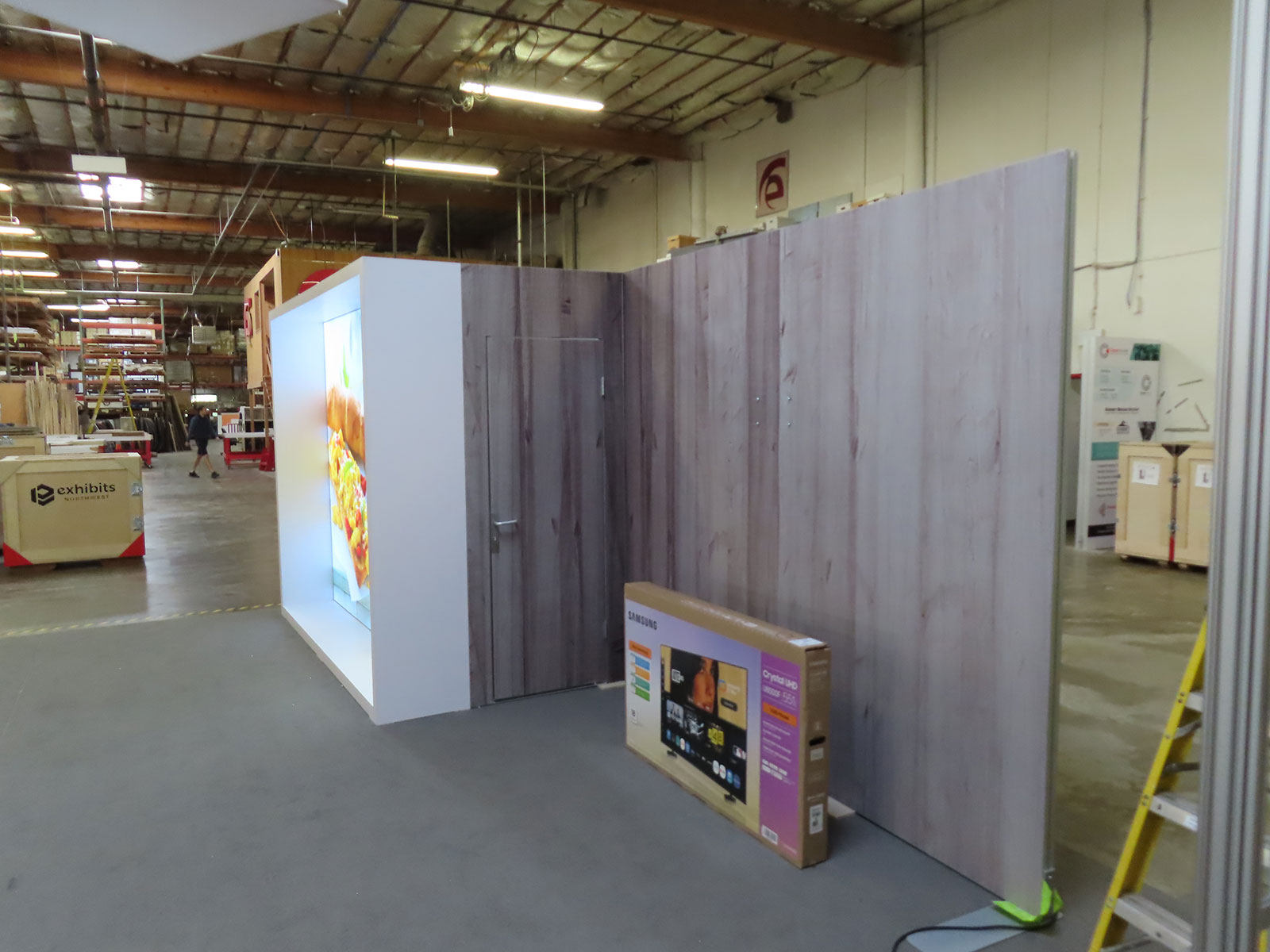 RENTAL: Modified RE-2103 Inline Design with Gravitee Panel System Backwall, Custom Hardrock Maple Laminated Soffits with Recessed Puck Lights, Extrusion Supported Laminated Shelving, Large Monitor Mount, 85" Monitor with HDMI Cable, SEG Fabric Graphics RENTAL: Modified RE-2103 Inline Design with Gravitee Panel System Backwall -- View 2 RENTAL: Modified RE-2103 Inline Design with Gravitee Panel System Backwall -- View 3 RENTAL: Modified RE-2103 Inline Design with Gravitee Panel System Backwall -- View 4