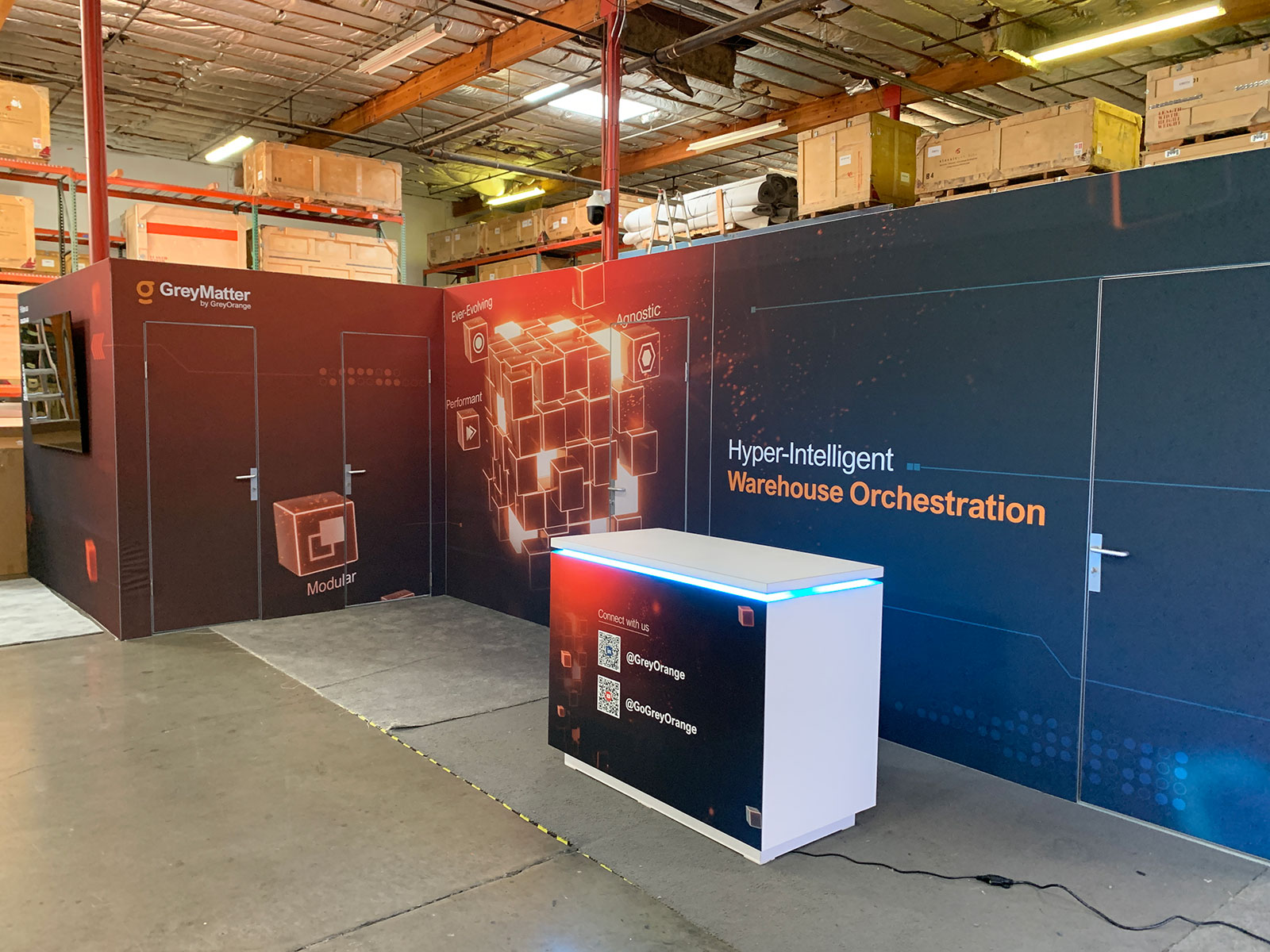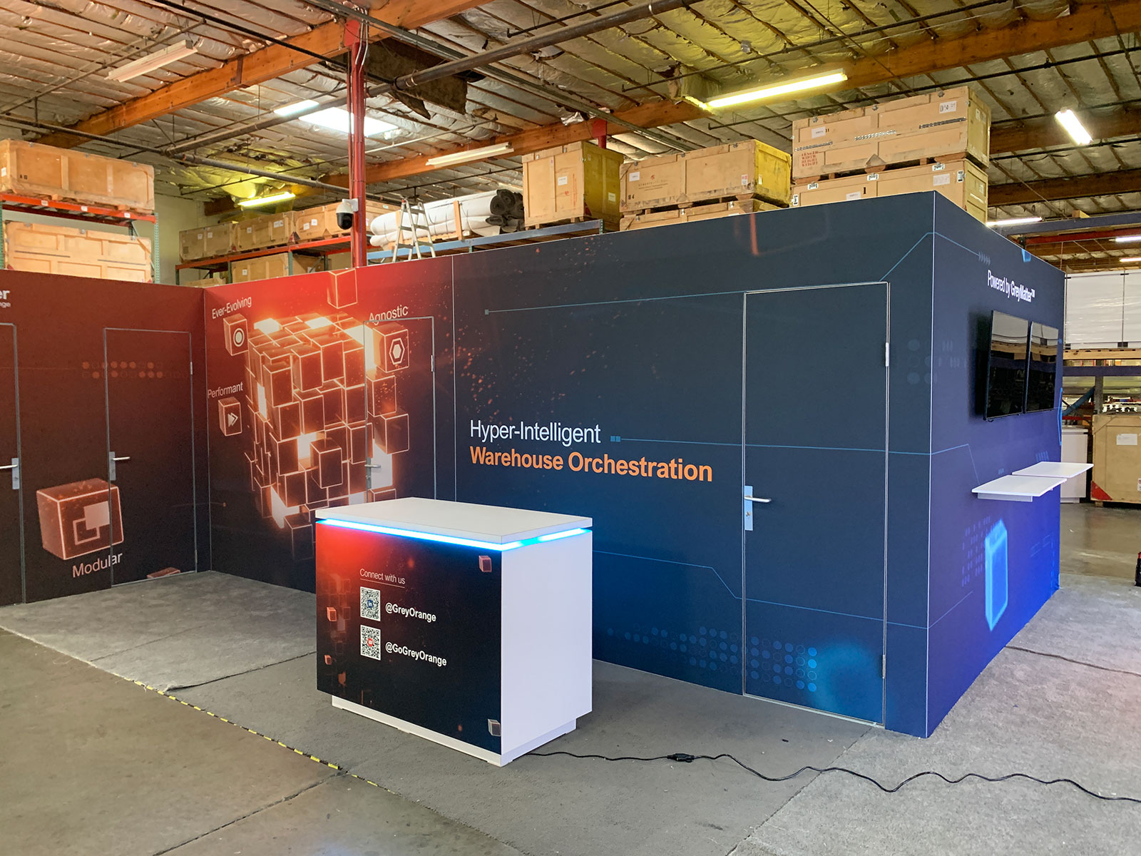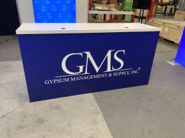 Custom Gravitee Modular Inline Exhibit with SEG Fabric Graphics, (3) Monitor Mounts, Closet Storage, (2) MOD-1509 Backlit Counter with Locking Storage, and (1) Custom Backlit Counter with Wireless Charging Pads [ORD-68745]