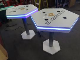 Reconfigurable Gravitee Custom Inline with SEG Fabric Graphic and Printed Hexagon Felt Graphics, LED Accent Lights, Magnetic Attachments, Shelves, Locking Closet, Reception Counter w/ Locking Storage, and Modified MOD-1464 Wireless Charging Table [ORD-68761]