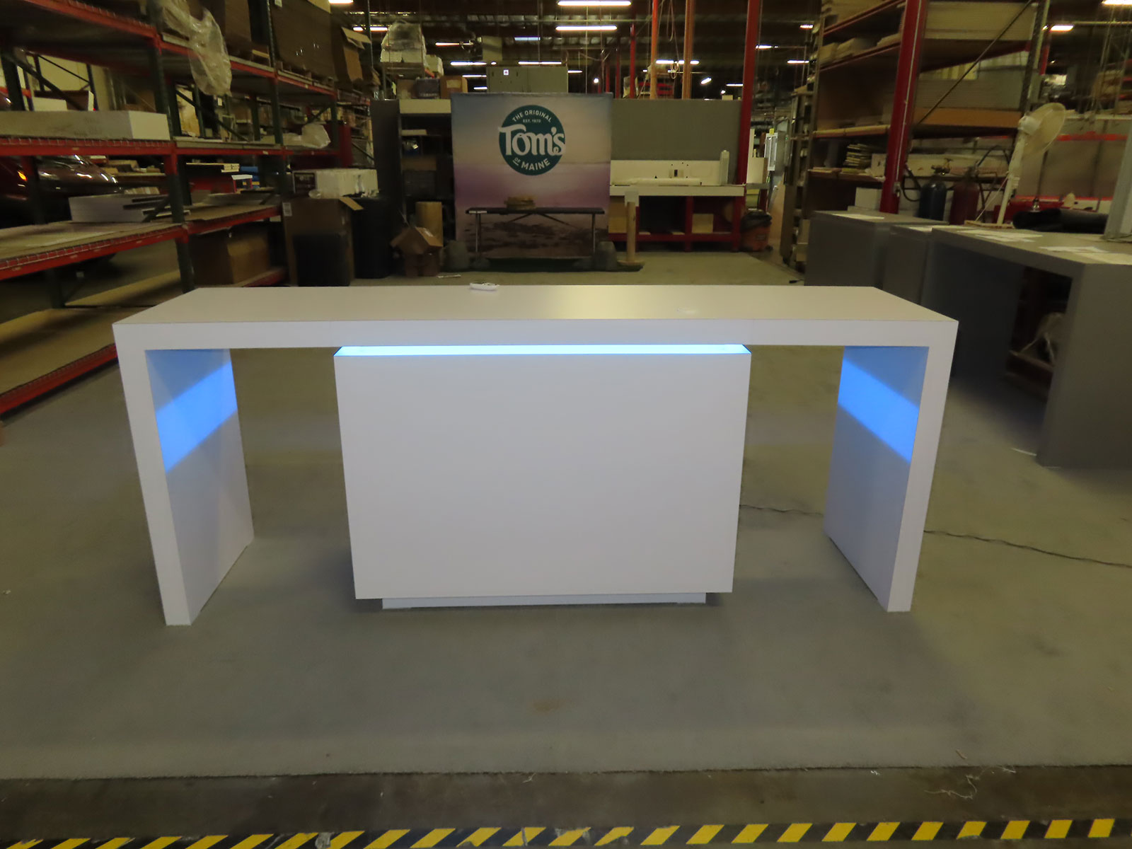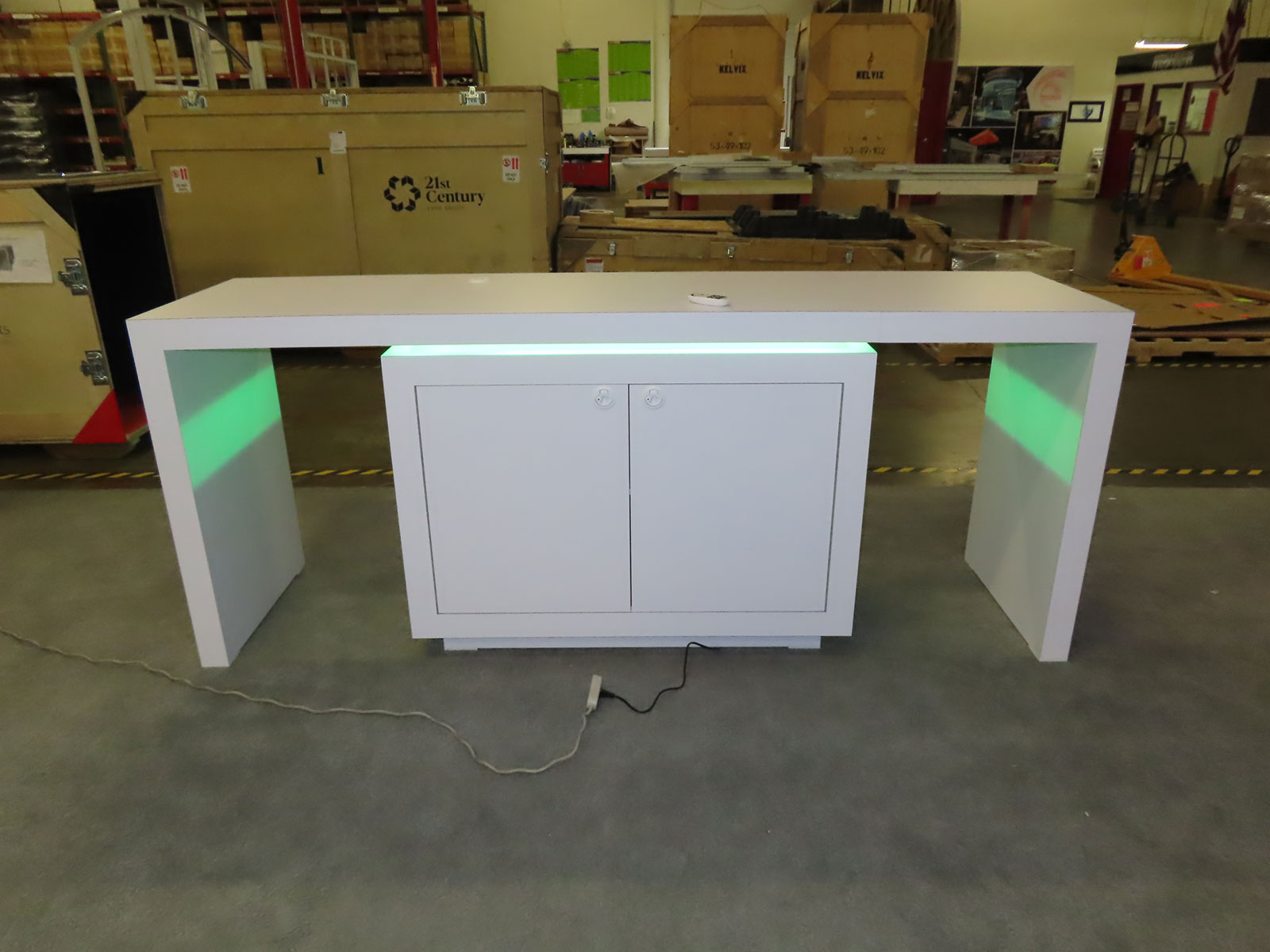 RENTAL: Custom Gravitee Inline Design with White Laminated Canopy, Center Bump-Out, (2) RE-1595 White Laminated Workstation Counters with Recessed RGB Accent Lighting, RE-1576 White Laminated Reception Counter with Recessed RGB Accent Lighting, Edge Light RENTAL: Custom Gravitee Inline Design with White Laminated Canopy -- View 2 RENTAL: Custom Gravitee Inline Design with White Laminated Canopy -- View 3