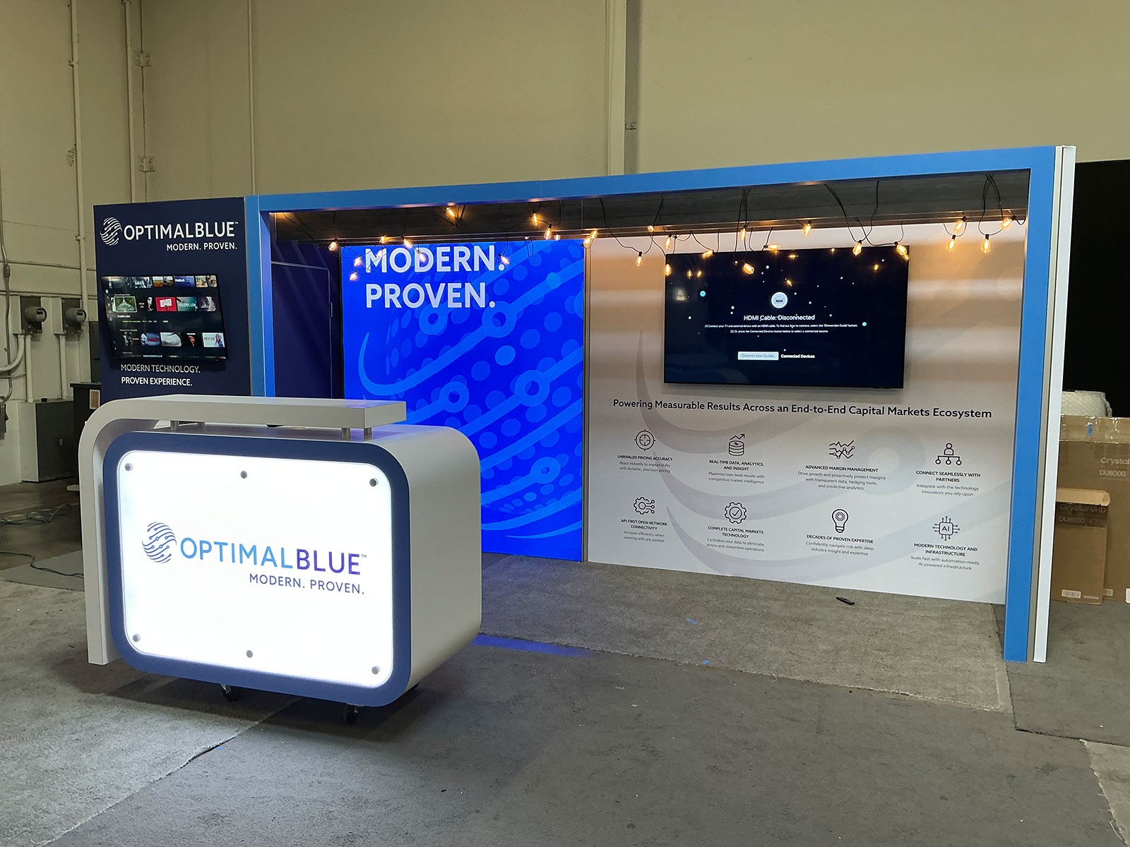 RENTAL: Modified RE-2149 Inline Design with Gravitee Storage Closet with Locking Door, 75" Wide x 95" High Single-Sided Lightbox, Gravitee Backwall with Right Return Panel, Extrusion Beams with Edison Accent String Lighting, Front Extrusion Framework for Accent Graphics, RE-1568 White Laminated Backlit Reception Counter, 65" Monitor, 43" Monitor, 36" Wide x 12" Deep White Laminated Shelf, SEG Fabric Graphics, and Direct Print Acrylic Graphic [ORD-70085]
