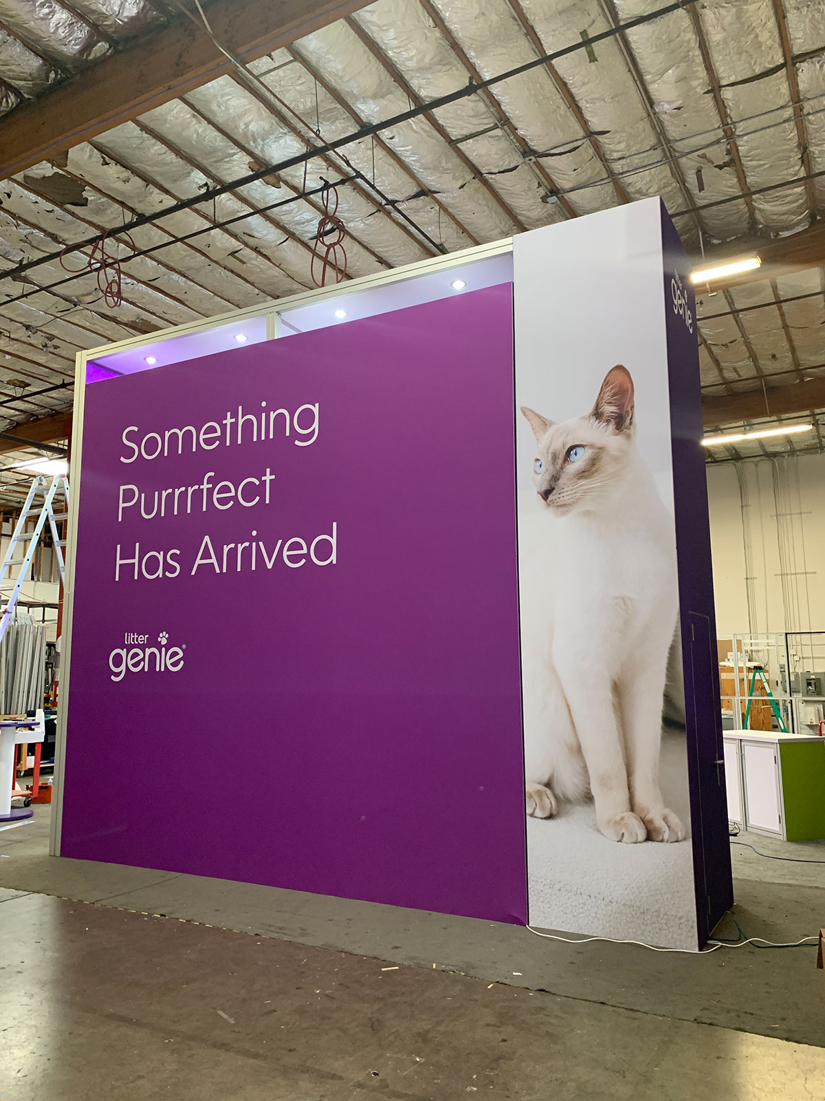 RENTAL: Custom Island Design with Gravitee Storage Tower with Locking Door, Arch Canopy Structure with Recessed Puck Lighting, Double-Sided Lightbox at 48" Wide x 190" High, Double-Sided Backwall Under Arch Canopy at 178" Wide x 176" High, 75" Monitor, (4) 36" Wide x 12" Deep Laminated Shelves, Freestanding Double-Sided Lightbox at 48" Wide x 190" High, (2) 38" Wide x 12" Deep Laminated Shelves, (8) Product Pedestals with Purple Vinyl Finish, RE-1615 Genius Bar with White Laminate Finish, RE-1567 Backlit Reception Counter, 10' x 10' x 36" Square Hanging Sign, SEG Fabric Graphics, Direct Print Vinyl Applied Graphics, and Pillowcase Fabric Graphic [ORD-699988]