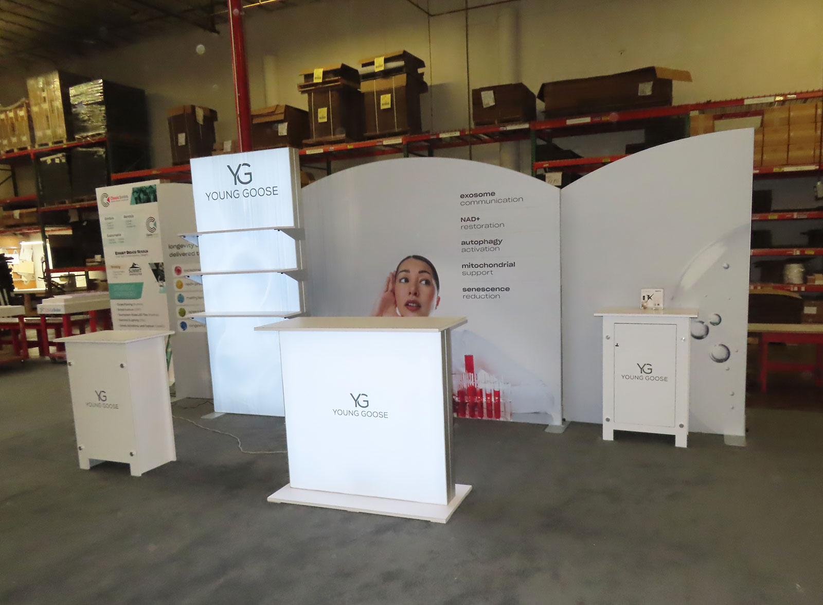 Gravitee Modular Inline Exhibit with Tension Fabric Graphics, SuperNova Lightbox, Shelves, Monitor Mount, Closet Storage, and (2) MOD-1703 Reception Counters [ORD-70616]