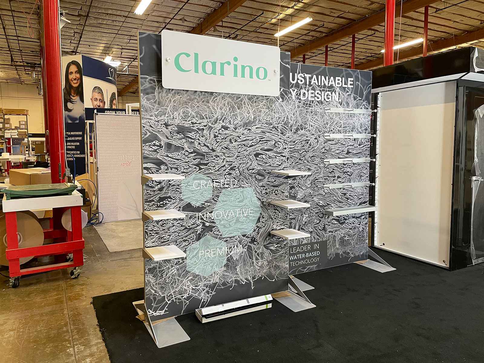 Custom Inline Exhibit with Header, Shelves, Hooks, Fabric