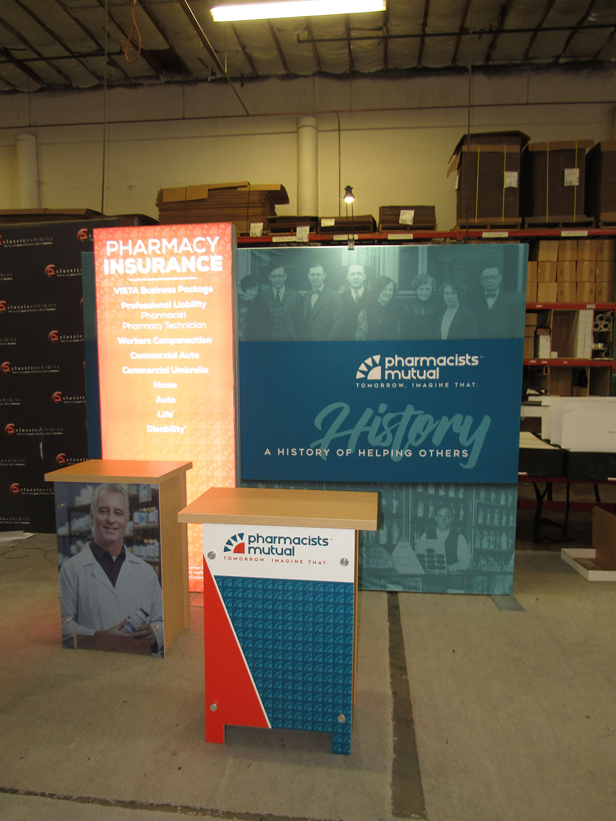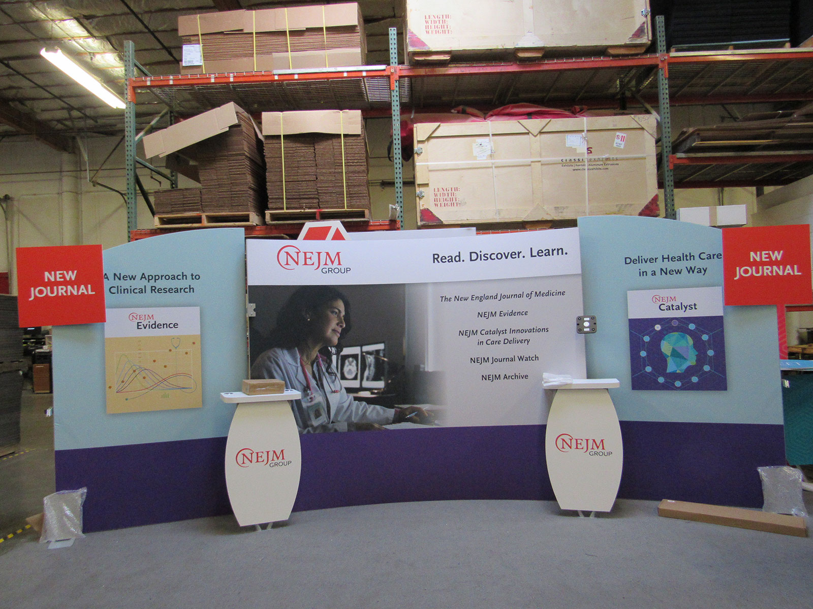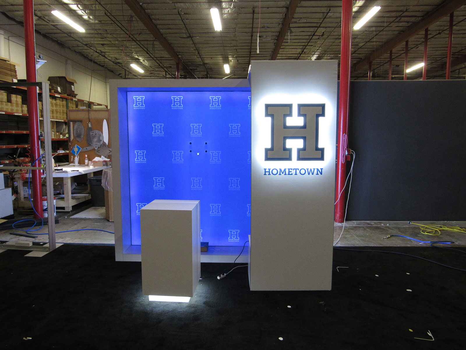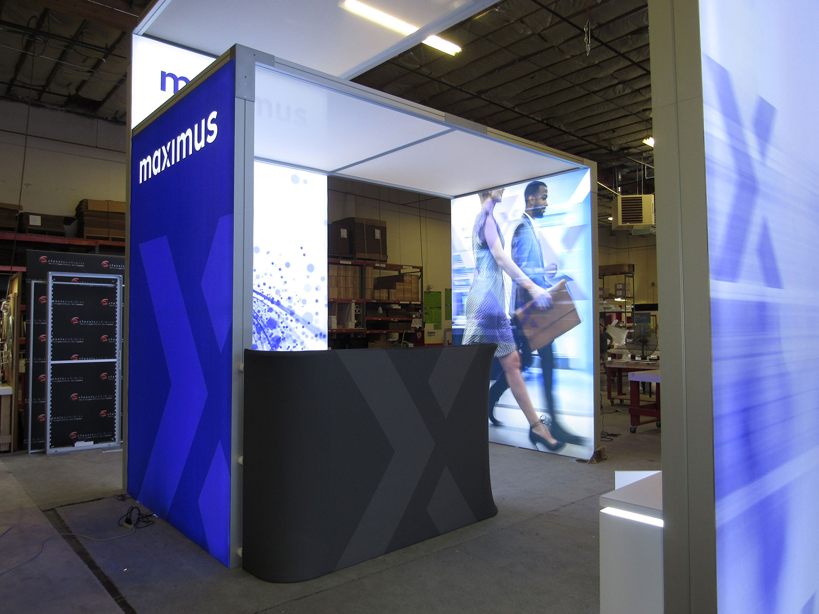 Exhibit with Backlit Fabric Graphics, Backlit Logo, Shelves, Large