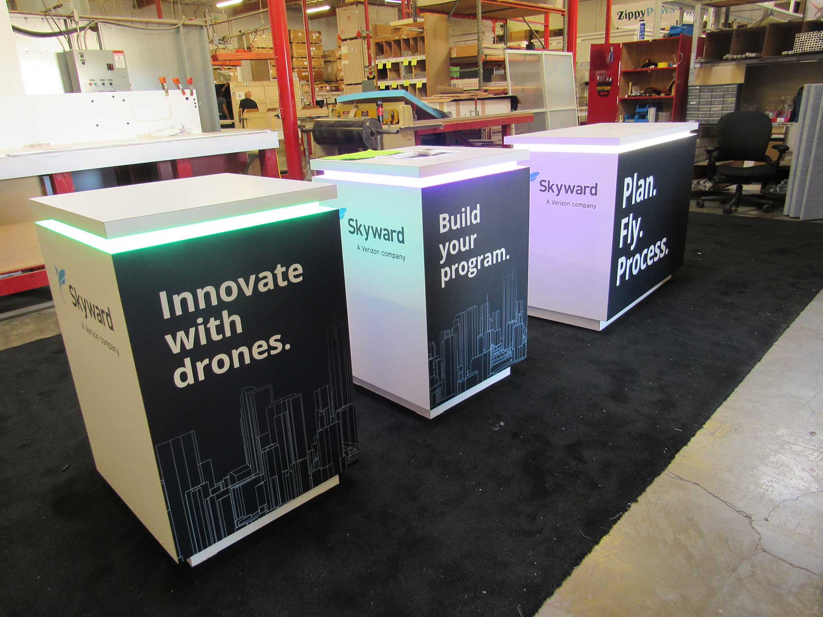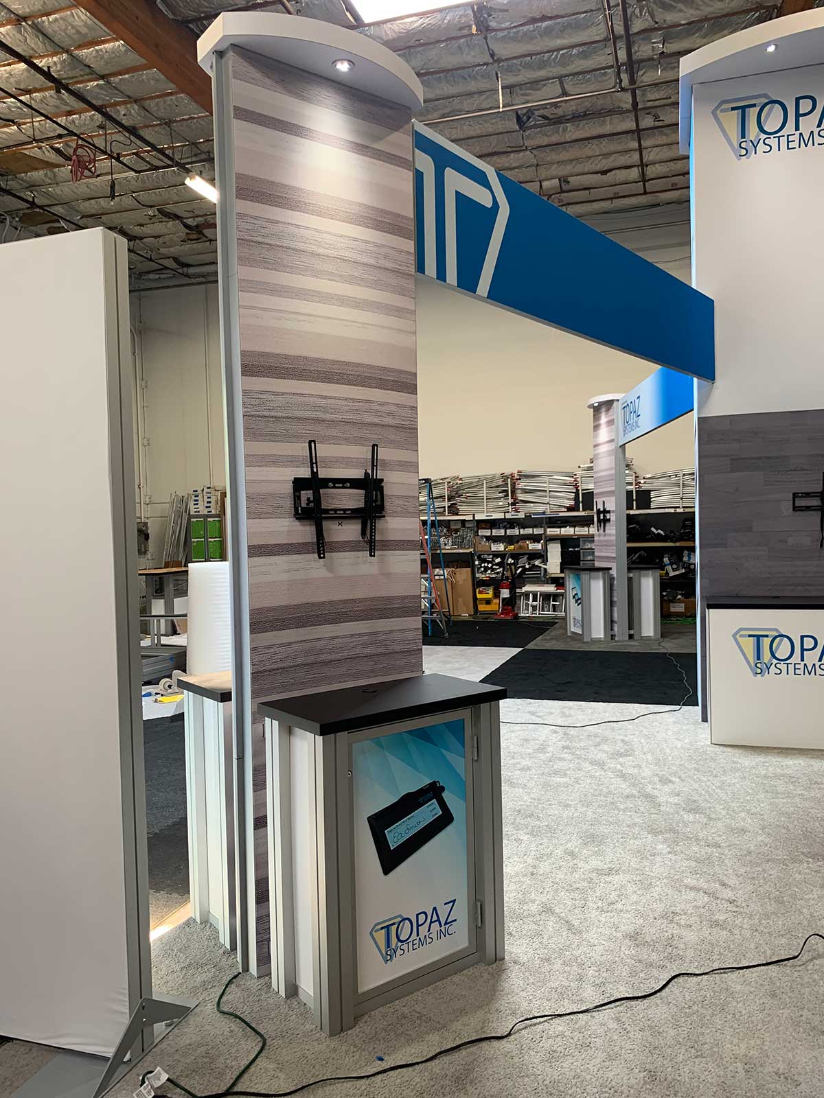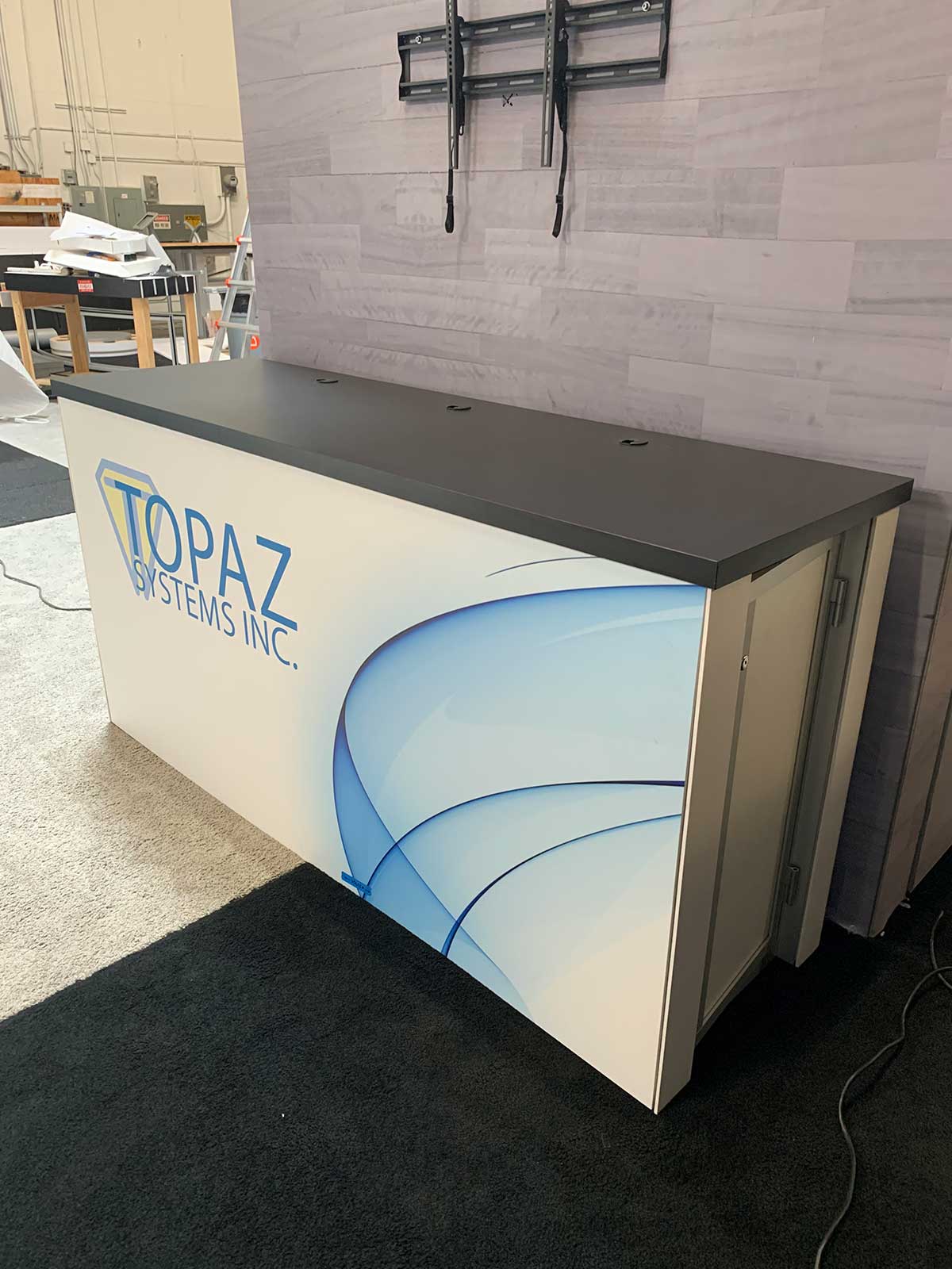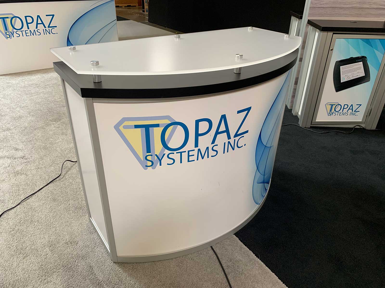 Tapered Counter Kiosk, SEG Fabric Graphics, Vinyl Graphics, Drop
