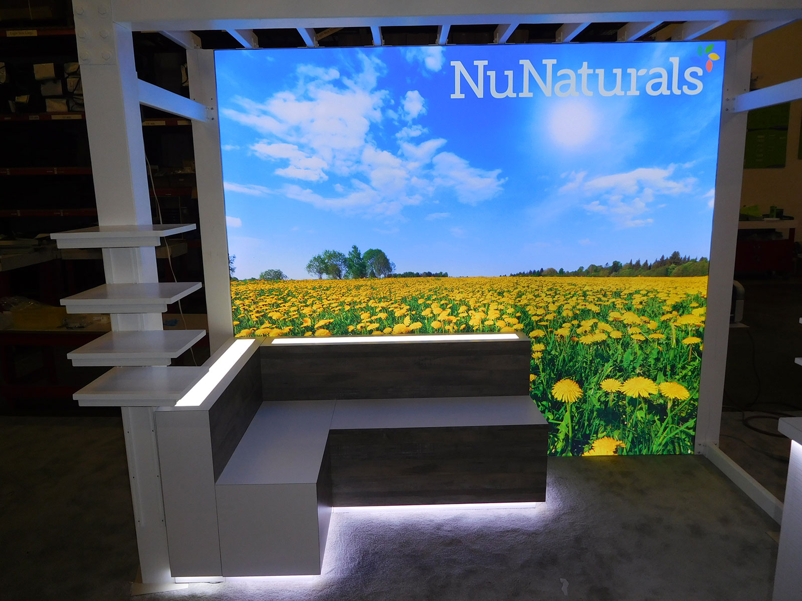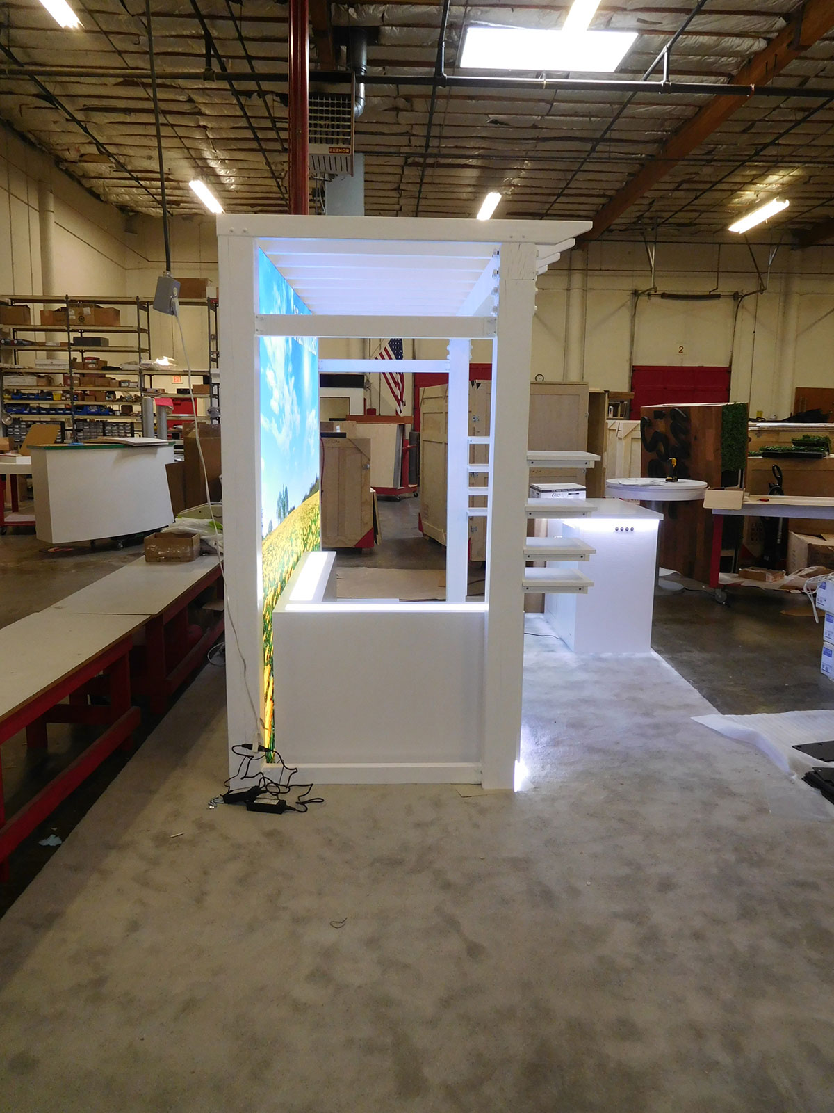 Custom Exhibit with Pergola, Product Shelves, Benches, LED